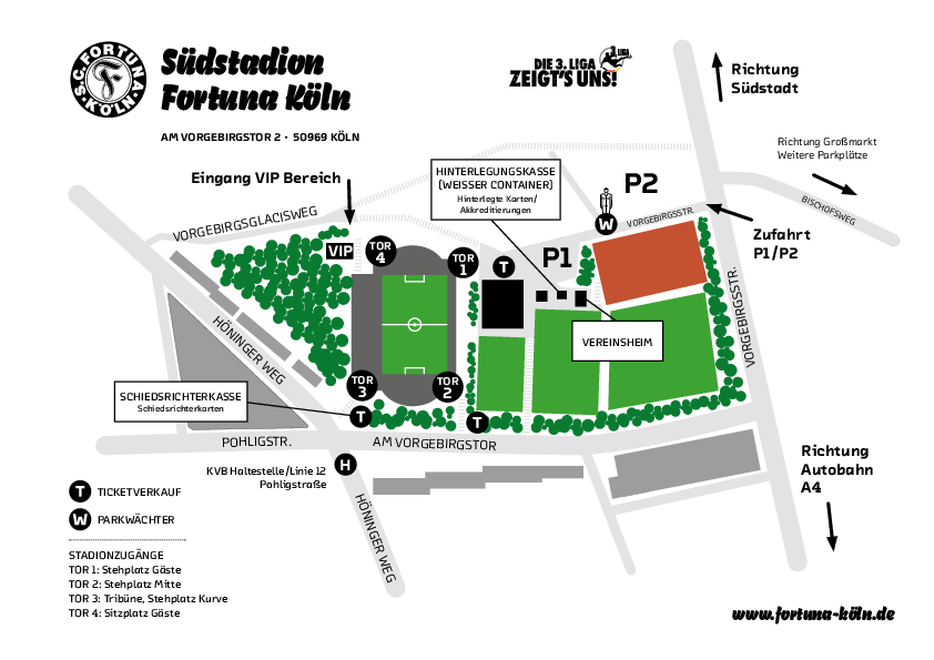 An den drei Kassen bei Tor 3, die an der Seite vom Haupteingang stehen, können Karten für Stehplatz Mitte gekauft werden. Besucher, die von der Haltestelle Pohligstraße aus kommen, können somit an Tor 3 schon Karten für Stehplatz Mitte kaufen und dann an Tor 2 mit reduzierter Wartezeit ins Südstadion.