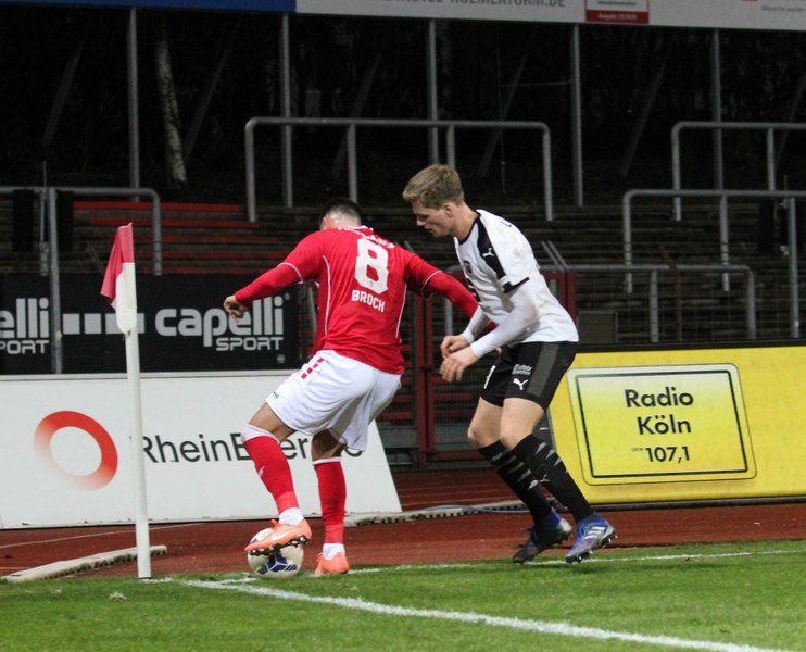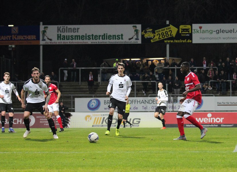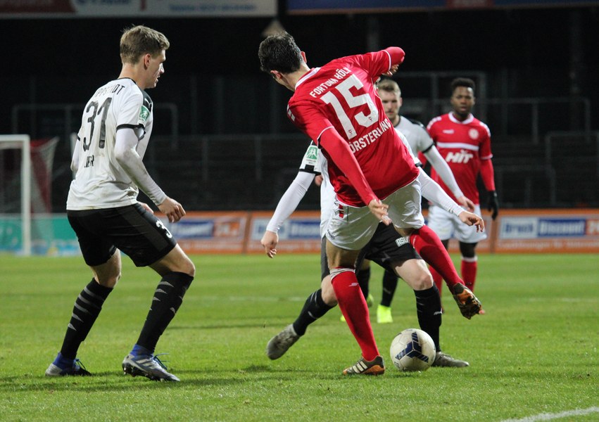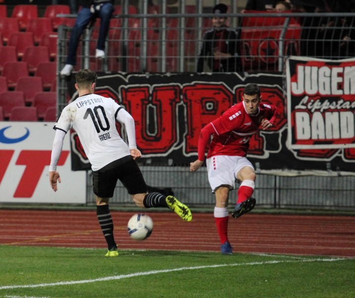 Die Fortuna sicherte sich im Spiel, das aufgrund der späten Anreise der Mannschaft und Fans der Gäste rund fünf Minuten später startete, die erste Torannäherung. Das Team von Thomas Stratos setzte gut nach und eroberte sich am gegnerischen Strafraum den Ball. Das Spielberät landete schließlich bei Lars Bender, der den Ball auf das Tor zog, das Gehäuse jedoch deutlich verpasste (1.). Fünf Minuten später schaffte es Mike Owusu nicht, eine Hereingabe von Suheyel Najar zu kontrollierten. So versprang der Ball in die Arme von Keeper Balkenhoff. Lippstadt meldete sich zunächst über Ecken im Spiel an. Doch sowohl Roman Prokoph (8.), als auch Noe Baba (9.) waren hellwach und köpften den Ball aus der Gefahrenzone. Fortuna sicherte sich mehr Ballanteile, schaffte es aber aus aussichtsreichen Positionen nicht, Druck hinter die Abschlüsse zu bekommen (12./14./15.). Auf der anderen Seite musste Rauhut erstmals in der 16. Minute eingreifen. Den Satten Schuss lenkte Fortunas Schlussmann den Ball aber sicher zur Seite. Die Südstädter suchten immer wieder den Weg nach vorne, brachten sich hintern jedoch durch Ungenauigkeiten selbst in Bedrängnis. 29. Minuten waren gespielt, als sich die rechte Angriffsseite der Fortuna zu Wort meldete. Weidlich setzte sich gegen seinen Mitspieler durch und legte auf Ochojski ab. Der suchte mit seiner Flanke zwar Stürmer Prokoph, fand jedoch nur einen Lippstädter-Abwehrkopf. Kurz vor der Pause sorgte Lars Bender dann für einen Aufschrei der Fortunen. Nach einer Ecke lauerte er am zweiten Posten und zog den Ball auf das Tor. Balkenhoff hatte den Ball jedoch im Nachfassen. Trotzdem hatte die Fortuna Glück, nicht mit einem Rückstand in die Pause zu gehen. Nils Köhler nahm Maß und zimmerte den Ball an die Unterkante der Latte. Von dort sprang er jedoch vor die Linie, sodass es mit einem torlosen Remis in die Pause ging.
