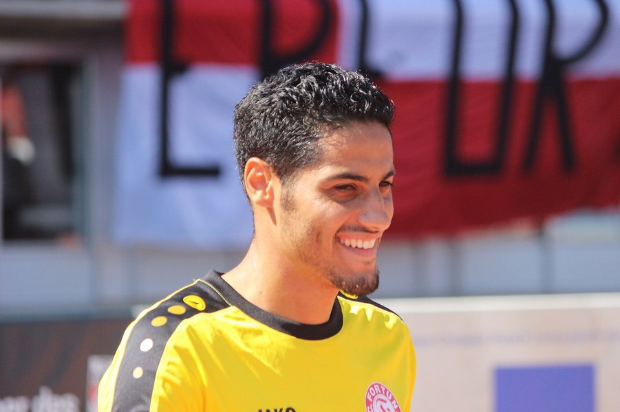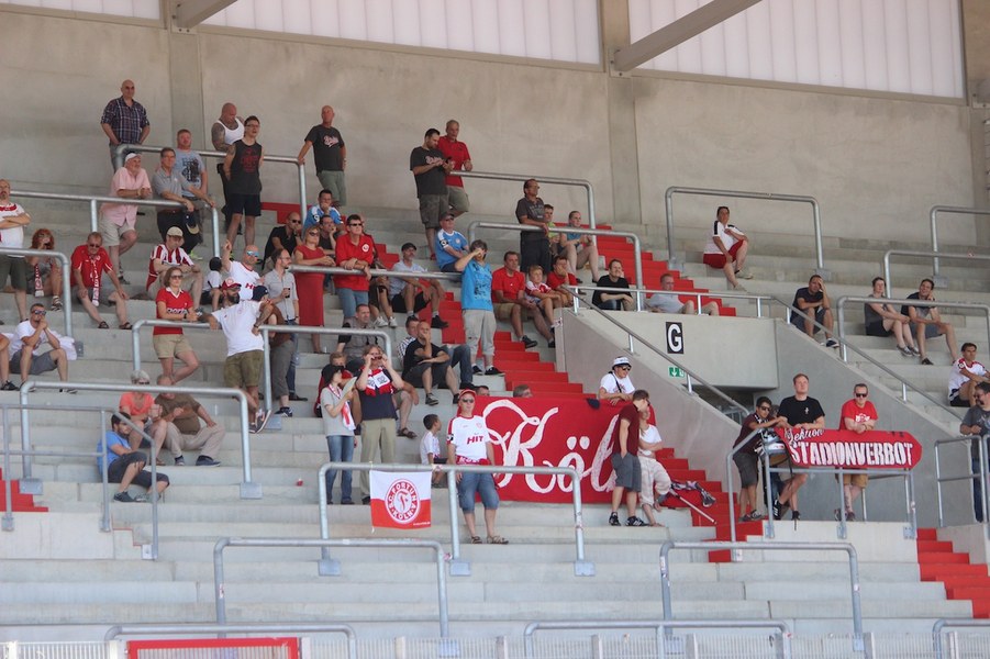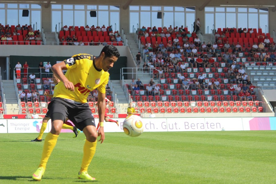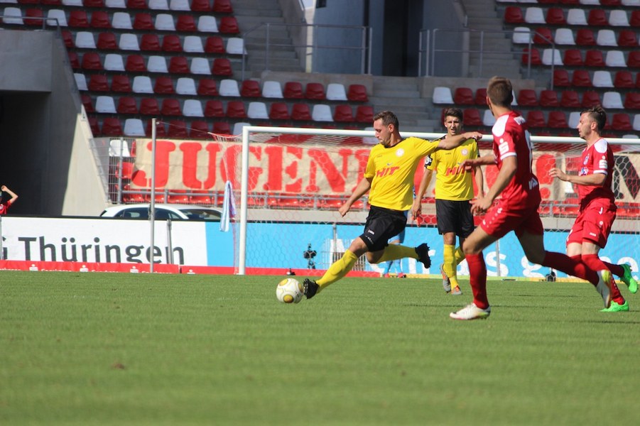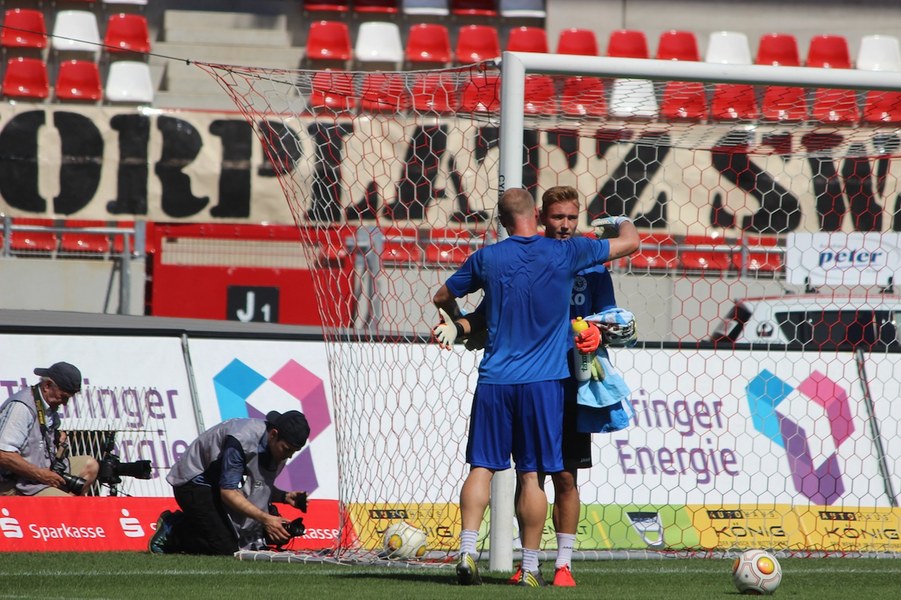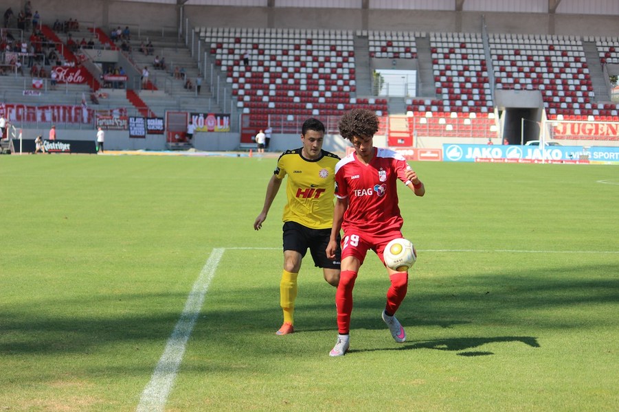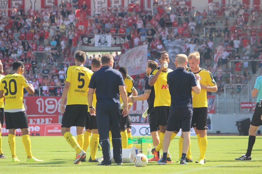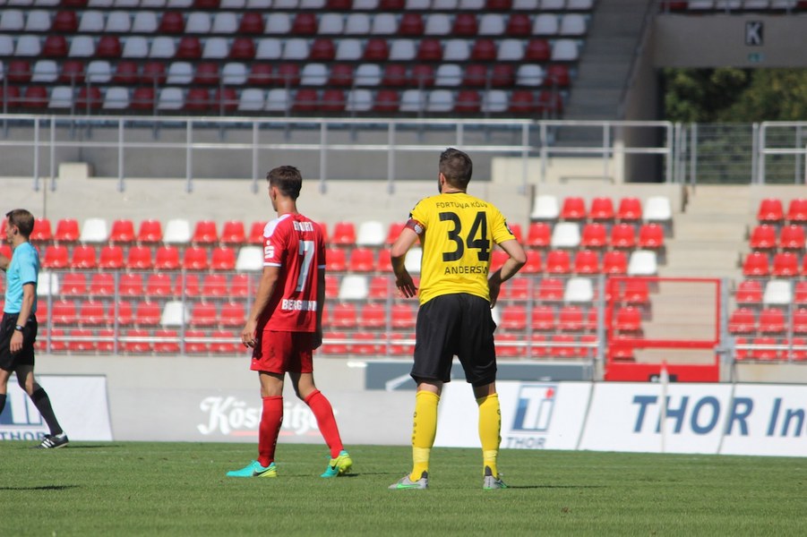 Bei knallender Hitze tasteten sich beide Mannschaften langsam in die Partie. Es dominierten die langen Bälle auf beiden Seiten. Die Fortuna bekam aber schnell ein Gefühl für das Spiel, auch wenn man früh verletzungsbedingt auf Kwame verzichten musste - für ihn kam Röcker (12.). Die Südstädter hatte ein leichtes optisches Übergewicht - Torszenen gab es aber auf beiden Seiten nicht. Erst nach einer guten Viertelstunde wurde es mal interessant, als nach Abstimmungsproblemen in der Kölner Defensive Benamar aus dem Rückraum zum Abschluss kam (16.). Es blieb in der Folge ein Abnutzungskampf im Steigerwaldstadion. Hier und da schleichten sich aufgrund der Temperaturen Konzentrationsfehler auf beiden Seite ein, bis Mitte der 1. Halbzeit aber ohne Folge. Nach kurzer Trinkpause fasste sich Bergmann für RWE ein Herz und setzte nach seinem Solo Kammlott in Szene, dessen Schuss Boss aber sicher parierte (29.). Die Gastgeber hatten nun mehr vom Spiel. Nach einer guten halben Stunde verbuchte auch die Fortuna ihren ersten gefährlichen Abschluss, als sich Souza von links aus spitzem Winkel versuchte (33.). Der Fortuna fehlte aber insgesamt das Tempo in ihren Aktionen. Erfurt schien nun besser mit den Bedingungen klar zu kommen: Einen zu kurz geratenen Rückpass erlief Benamar, aber Boss verkürzte geschickt den Winkel gegen den Erfurter (35.). Kurz darauf setzte sich Pigl nach langem Ball gegen Röcker durch, scheiterte aber wieder an Fortuna-Keeper Boss (38.). Kurz vor der Pause sorgte ein ruhender Ball von Tyrala für Durcheinander vor dem Tor von Boss, es ging aber torlos in die Kabine (45.).