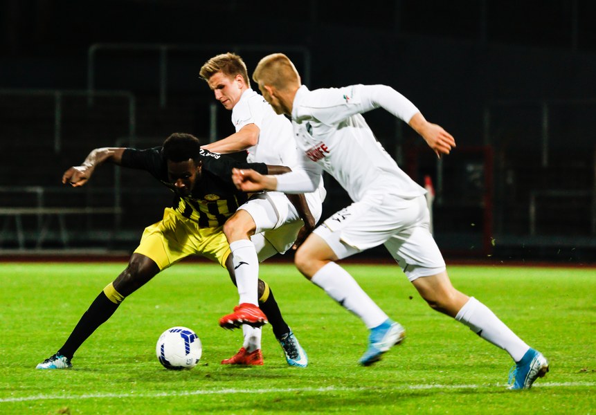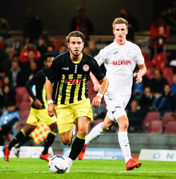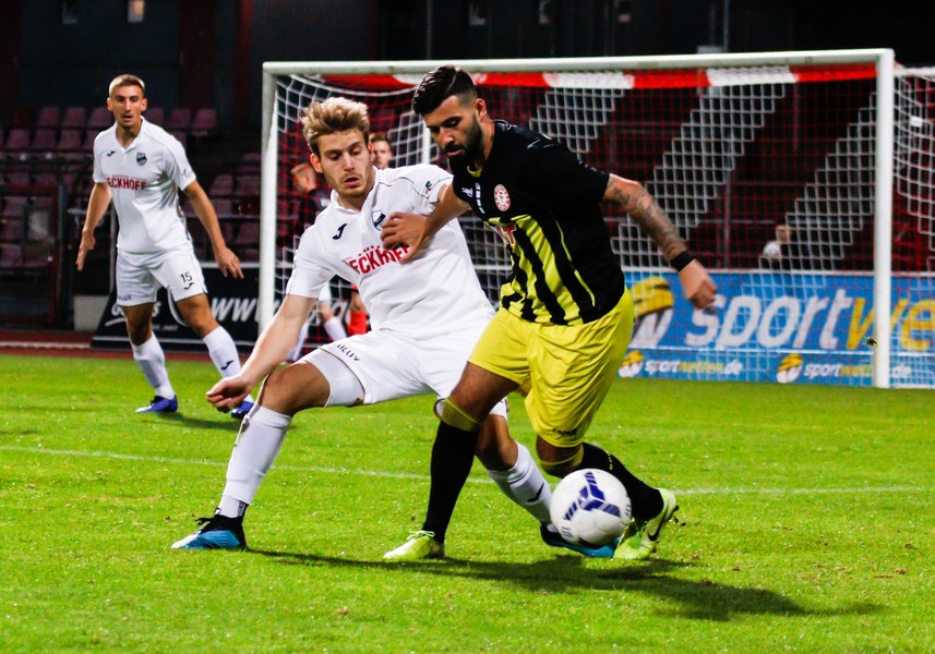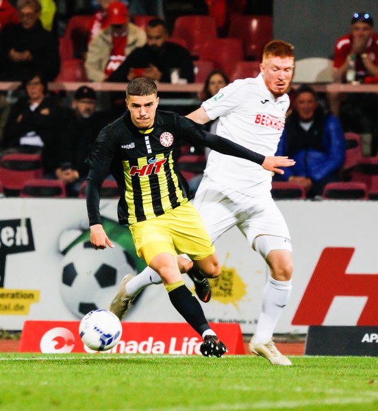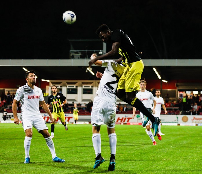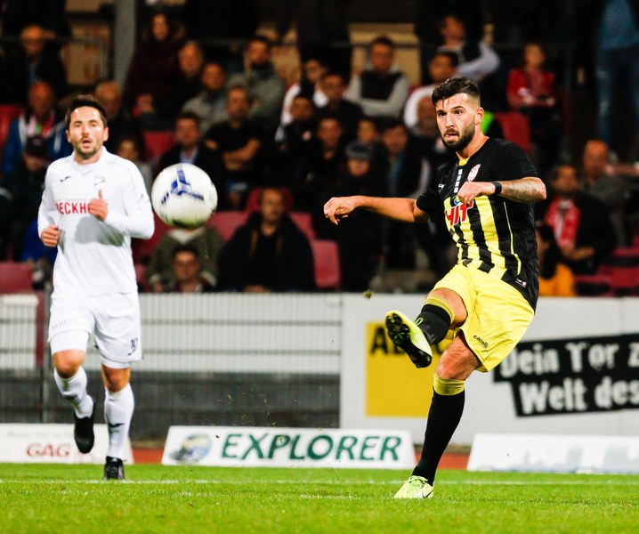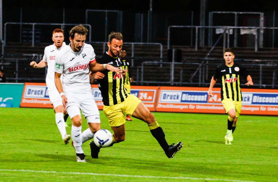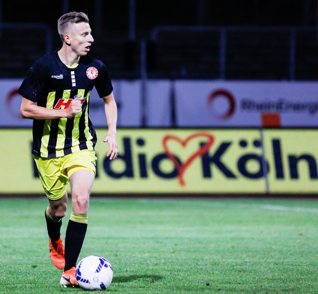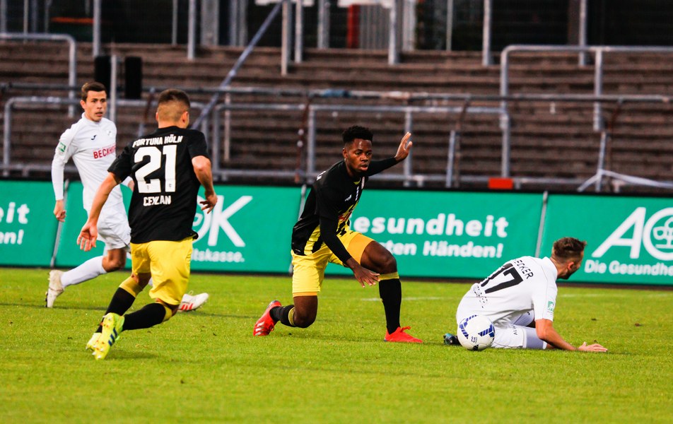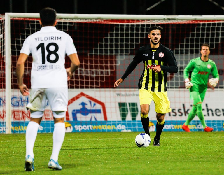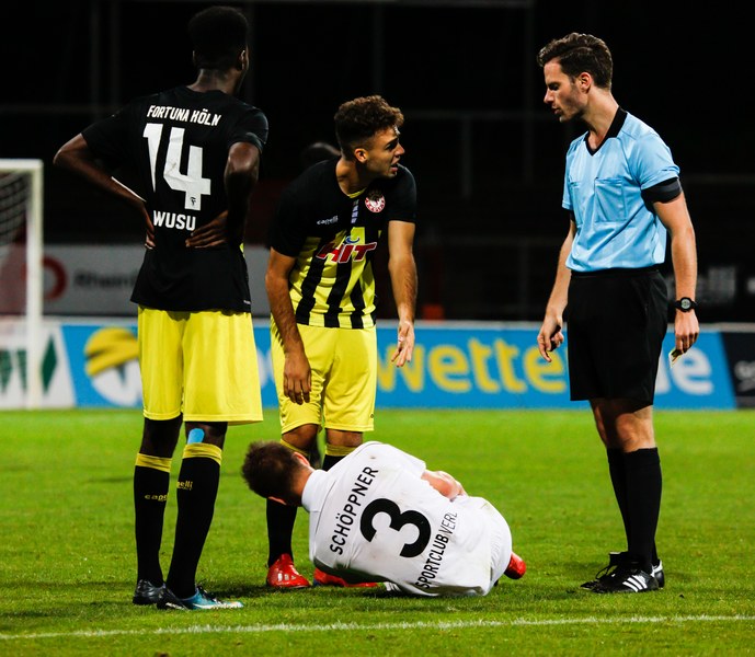 Das 4. Heimspiel der Saison im Südstadion begann mit einer Premiere. Erstmals in der Saison spielte Fortuna Köln mit dem schwarz-gelben Traditionstrikot. Die Startelf hatte Neuheiten auf zwei Positionen: Trainer Thomas Stratos brachte Roman Prokoph und Ali Ceylan für Lars Bender und Alem Koljic. Aber die Gäste fanden den besseren Start. Bereits in den ersten sechs Minuten hatten die Gegner schon zwei Ecken und einen Freistoß, und zeigten mit frühem Pressing, dass ein schweres Spiel auf die Fortuna warten würde. Für die ersten Möglichkeiten der Gäste sorgte Nico Hecker gleich doppelt. Zuerst zog er einen Schuss über das Tor (7.) dann scheiterte er an Noe Baba, der für den bereits überwundenen Rauhut auf der Linie klärte (9.). Ab der 17. Minute konnten die Kölner etwas aufatmen und den Druck von Verl besser kontrollieren. Gefährlich wurde die Fortuna dabei aber nicht, da die Versuche nicht konsequent genug zu Ende gespielt wurden. Besser machten es die Gäste auf der anderen Seite. Verl drückte weiter und traf das Tor mit einem Kopfball von Zlatko Janic (25.): 1:0 für den SC Verl. Was ein Glücksmoment für die Fortuna gewesen wäre, dauerte nur ein paar Sekunden: Die Gastgeber kamen zum vermeintlichen 1:1, aber es wurde auf Handspiel von Roman Prokoph entschieden. Dieser hatte einen gefährlichen Schuss ins Tor abgefälscht und erhielt daraufhin eine gelbe Karte (31.). Nur sechs Minuten später war es Jan Schöppener, der noch vor der Pause auf 2:0 erhöhte. Kurz vor dem Pausenpfiff startete Fortuna noch einen Versuch über die Außenbahn. Ali Ceylan versuchte, mit seinem Ball Roman Prokoph zu finden, aber seine Hereingabe geriet zu kurz (38.). So landete der Ball bei Blendi Idrizi, der aus der zweiten Reihe abzog, den Schuss jedoch über das Tor setzte (39.). Mehr gute Chance gab es nicht und so endete die erste Halbzeit.