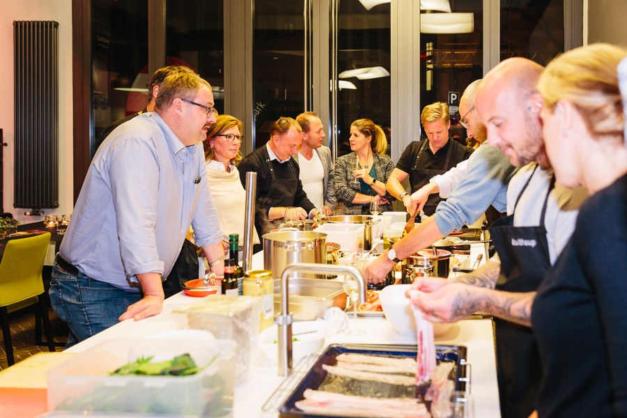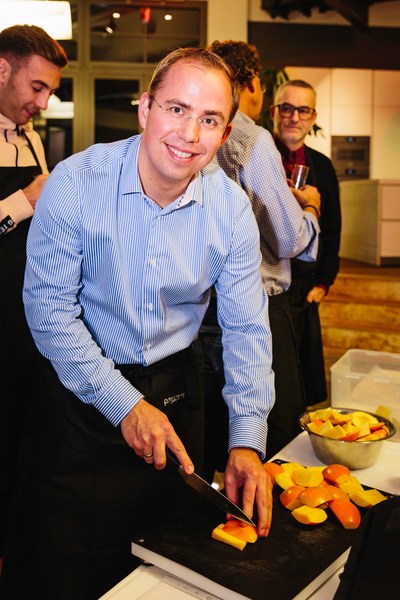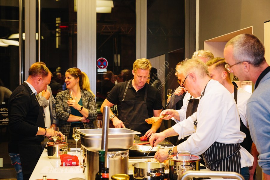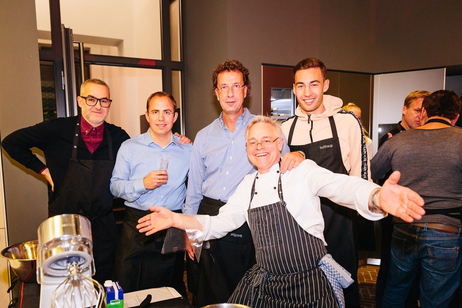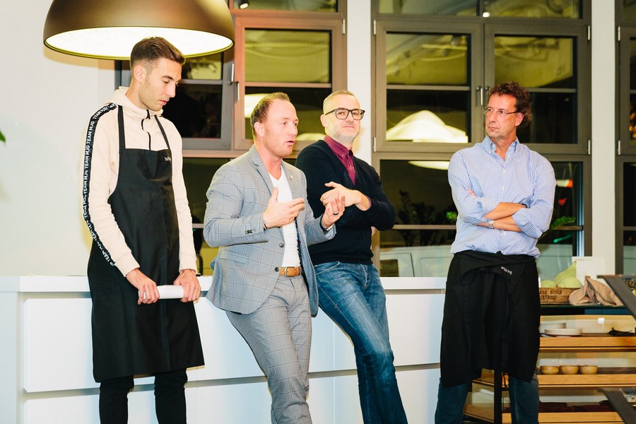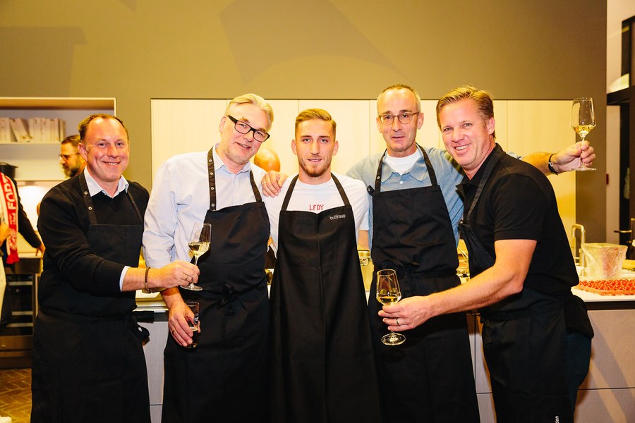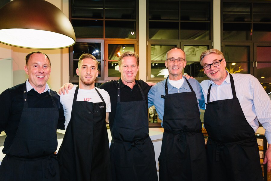 12 Partnerunternehmen aus dem Fortuna-Netzwerk waren dabei mit insgesamt 30 Personen bei bulthaup am mediapark. Zusammen mit Maurice Exslager bereiteten die Partner als Vorspeise einen Salat mit gebackenen Tomaten sowie Speck mit Kartoffeldressing zu. Die Hauptspeise betreute Robin Scheu, der gemeinsam mit Partnern Schweinefilet mit Kartoffelstampf und bunter Beete kochte. Für den Nachtisch zeichnete die Gruppe von Michael Eberwein verantwortlich, der mit Partnern eine Mascaropne-Creme mit Kakis zubereitete.