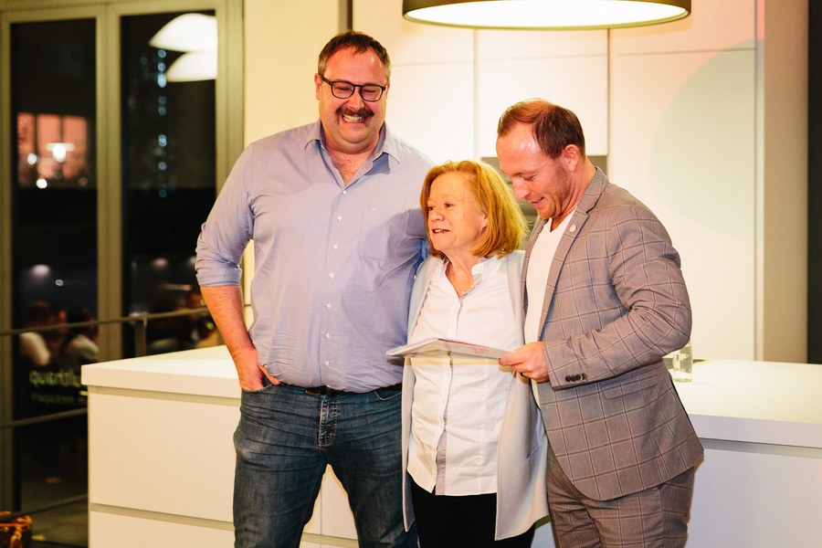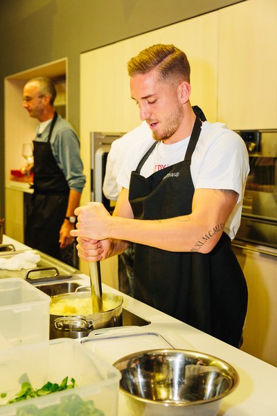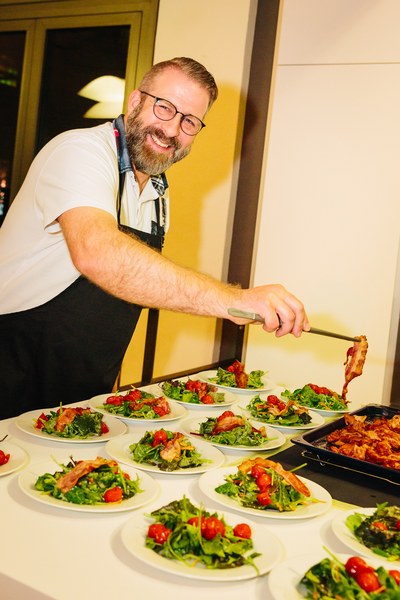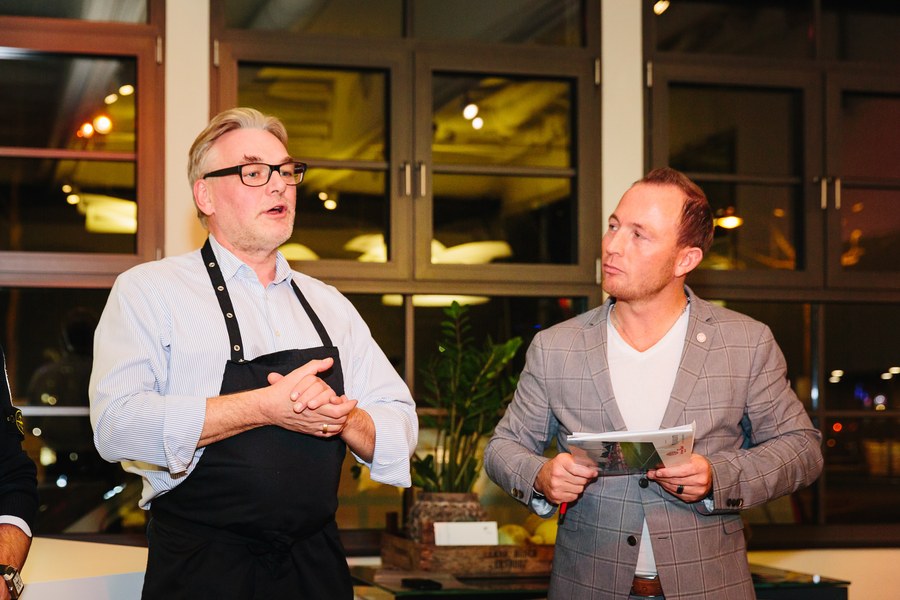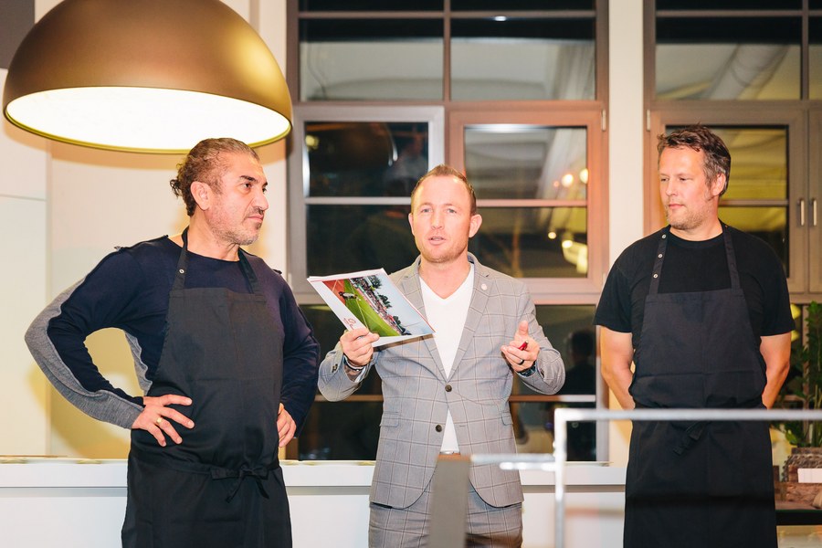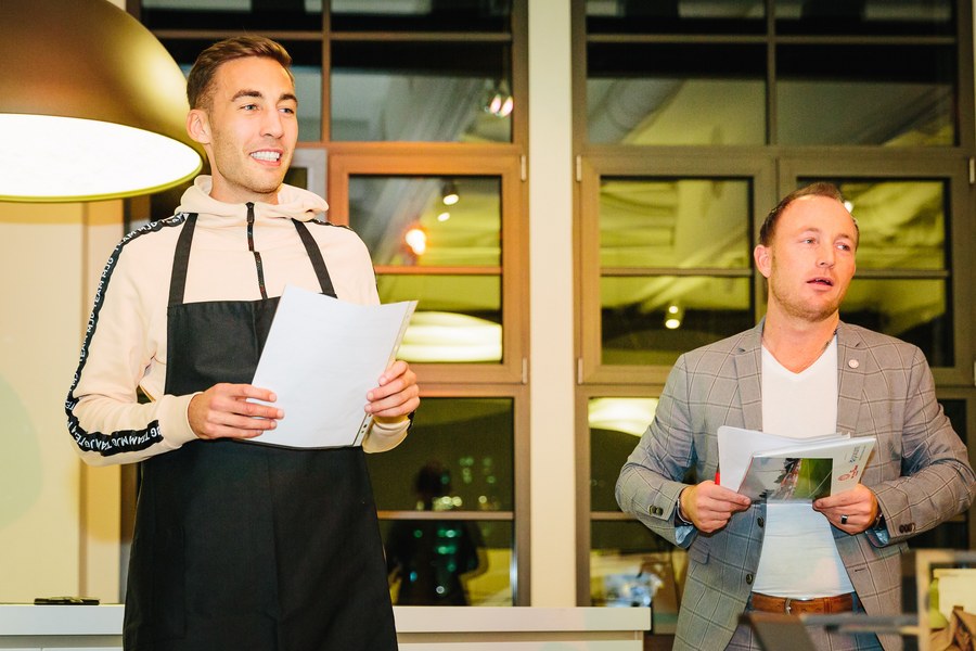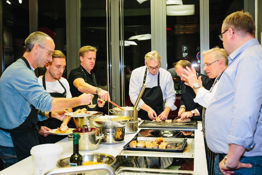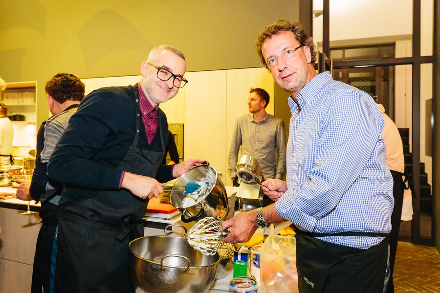 12 Partnerunternehmen aus dem Fortuna-Netzwerk waren dabei mit insgesamt 30 Personen bei bulthaup am mediapark. Zusammen mit Maurice Exslager bereiteten die Partner als Vorspeise einen Salat mit gebackenen Tomaten sowie Speck mit Kartoffeldressing zu. Die Hauptspeise betreute Robin Scheu, der gemeinsam mit Partnern Schweinefilet mit Kartoffelstampf und bunter Beete kochte. Für den Nachtisch zeichnete die Gruppe von Michael Eberwein verantwortlich, der mit Partnern eine Mascaropne-Creme mit Kakis zubereitete.