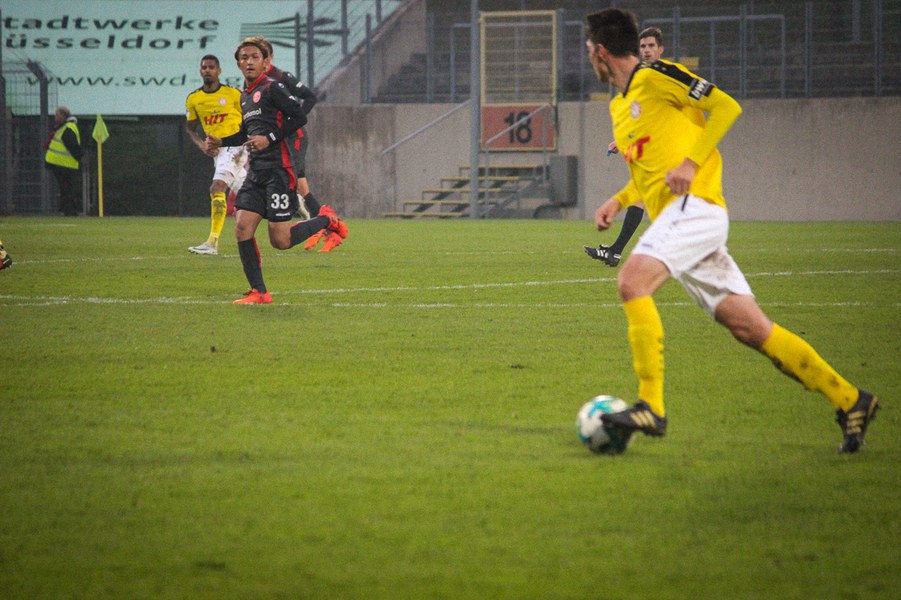 Beide Trainer nahmen das Testspiel nicht auf die leichte Schulter und ließen viele Stammspieler auflaufen. Die Fortuna aus Köln war es allerdings, die besser in die Partie kam. Die Südstädter zeigten sich giftig in den Zweikämpfen und liefen den Zweitligisten früh an. Die gute Anfangsphase der Kölner wurde dann auch mit einem Tor belohnt. Nach schöner Kombination kam Kurt an der Strafraumgrenze an den Ball und erzielte mit einem trockenem Flachschuss das 1:0 (18.). In der Folge konnten die Kölner den Nachbarn aus der Landeshauptstadt gut vom eigenen Tor fern halten. Dennoch kamen die Düsseldorfer in Person von Usami zum Ausgleich. Der Mittelfeldspieler erzielte artistisch per Volley den Ausgleich (28.). Die Fortuna aus Köln blieb aber auch nach dem Gegentor die bessere Mannschaft und hatte Pech, dass sich Bormuth in den Schuss von Keita-Ruel warf und ihn damit entscheidend am Tor vorbei lenken konnte (28.). Danach verflachte die Partie und fand hauptsächlich im Mittelfeld statt. Keine der beiden Mannschaften konnte sich vor dem Pausenpfiff weitere nennenswerte Chancen herausspielen, auch wenn die Kölner mehr Zugriff hatten.