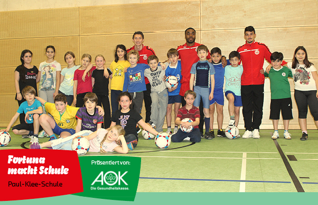 Um 9 Uhr begrüßten die Grundschüler die Fortuna-Spieler in der Paul-Klee-Schule. In der neugebauten Turnhalle ging es schließlich unter Anleitung von Kusi Kwame, Markus Pazurek und Cauly Oliveira Souza an drei Stationen ans Fußballtraining. So wurden das Dribbling, der Torschuss und der Fallrückzieher oder der Flugkopfball geübt. Nachdem zunächst eine Gruppe Viertklässler eine Dreiviertelstunde lang trainierte, kam anschließend eine Mädchen-Fußball AG an die Reihe.