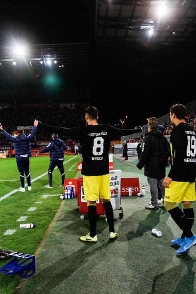 Beide Mannschaften kamen mit ordentlich Tempo aus der Kabine. Doch es war gerade einmal eine Minute gespielt, ehe sich Fortuna selbst in Bedrängnis brachte. Franko Uzelac spielte einen riskanten Rückpass auf Kevin Rauhut. Der Kölner Keeper war gerade noch vor dem heranrauschenden Selishta am Ball. Auch in der nächsten Szene stand der Fortuna Kapitän im Mittelpunkt, diesmal jedoch als Anstoß eines Fortuna-Angriffs. Mit seinem langen Ball fand er Lionel Salla, der die linke Seite langmarschierte und kurz vor der Grundlinie zurücklegte. Über Umwege landete der Ball bei Dennis Brock und schließlich Mike Owusu, der mit seinem Abschluss das Tor jedoch klar verfehlte (4.). Auf der anderen Seite kombinierte sich Essen bis zum Strafraum durch, ehe der Ball bei Endres landete. Der Essener versuchte es mit einem Schlenzer auf in die lange Ecke, verfehlte das Tor aber knapp (8.). Kurze Zeit später landete der Ball dann doch im Fortuna Tor. Die erhobene Fahne des Linienrichters unterbrach jedoch den Jubel der Essener – Abseits. Jubel gab es dann aber schließlich auf der anderen Seite. Franko Uzelac zog einen Freistoß aus knapp 30 Metern direkt auf das Tor und versenkte den Ball flach in der linken unteren Ecke. Es machte sich Unmut breit im Stadion Essen und Fortuna versuchte, die Ungenauigkeiten des Gegners auszunutzen. So spritzten die Südstädter in einen Aufbau von RWE. Dadurch, dass RWE den Keeper bei den Angriffen zwischen die Innenverteidiger zog, war das Tor blank. Prokoph versuchte es mit dem Heber über den zurückeilenden Keeper, setzte aber zu hoch an und verfehlter das Tor (27.). Fortuna machte Druck, scheiterte aber gleich doppelt mit zwei großen Chancen. Erst traf Mike Owusu nur den Pfosten (35.), dann scheiterte Salman am Keeper (37.). So blieb es bei der knappen 1:0-Führung der Fortuna zur Pause.