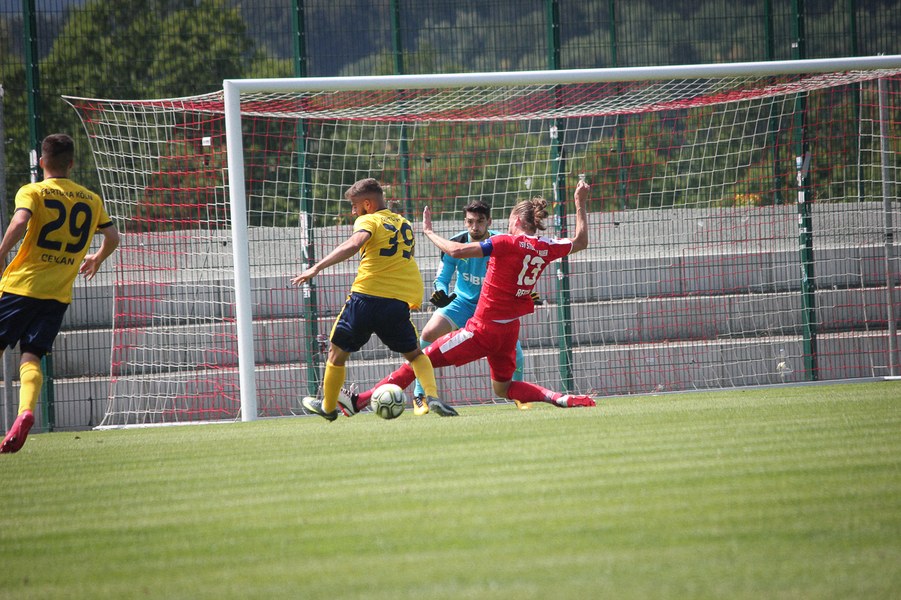 In einem lebendigen Test gingen beide Teams direkt ein hohes Tempo und schenkten sich speziell in der Defensive wenig. So entwickelte sich ein munteres, aber chancenarmes Spiel. Die Fortuna übernahm nach einem kurzen Abtasten die Kontrolle und verlagerte das Spielgeschehen in Steinbachs Hälfte. Zwar gelang offensiv nicht alles, aber bei Ballverlust holten sich die Südstädter das Spielgerät direkt wieder und hielten den Druck so hoch. Steinbach sorgte lediglich bei Kontern über Marquet mal für Entlastung. Bis auf zwei Ecken sprang für die Fortuna aus der Dominanz offensiv aber zunächst nichts heraus. Die dritte Ecke der Fortuna sollte dann erstmals einen Hauch von Torgefahr versprühen, auch wenn kein Kölner die Unordnung von Steinbach im Fünfmeterraum ausnutzen konnte (31.). Der Drittligist war bemüht und zeigte speziell über links die reifere Spielanlage. Es war jedoch eine Einzelaktion, die die einzige echte Torchance sein sollte: Aus 25 Metern zimmerte Kurt den Ball am reaktionslosen Bibleka an den Querbalken von Steinbachs Gehäuse (37.). Nachdem kurz darauf eine vielversprechende Hereingabe von Bröker durch den Strafraum flog (43.), ging es schließlich torlos in die Kabine.