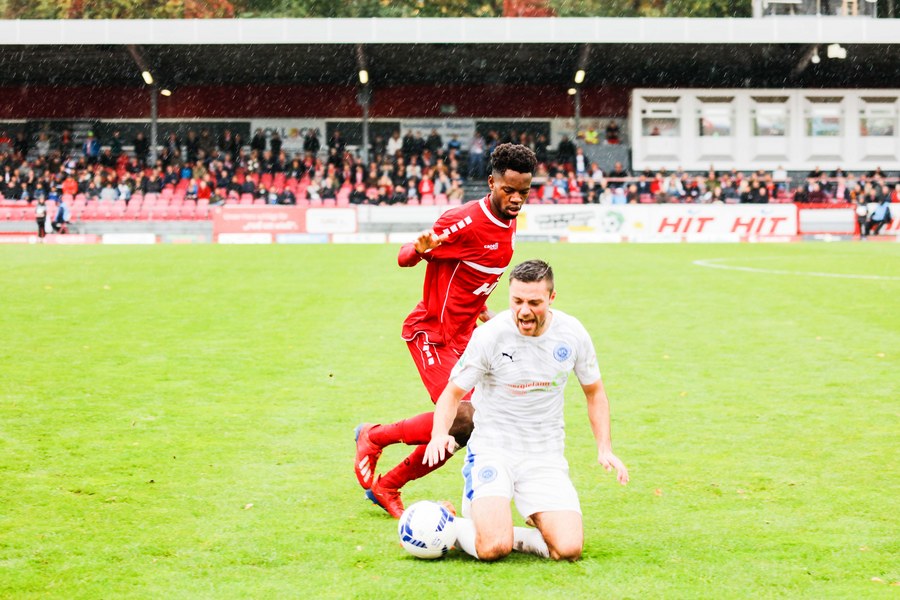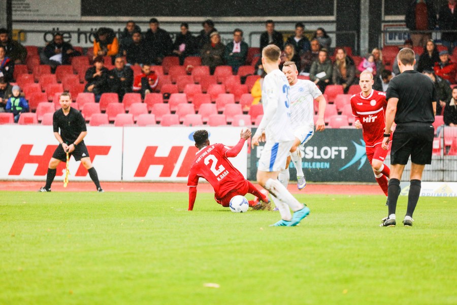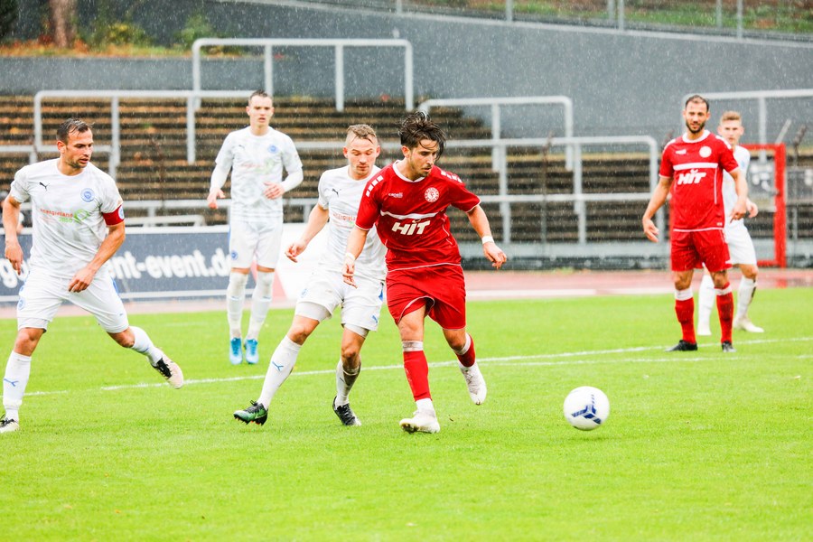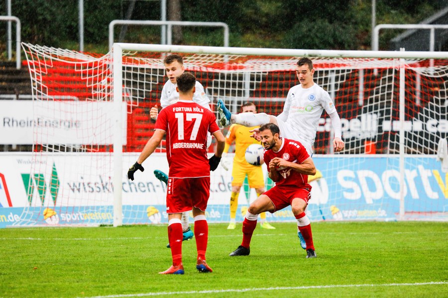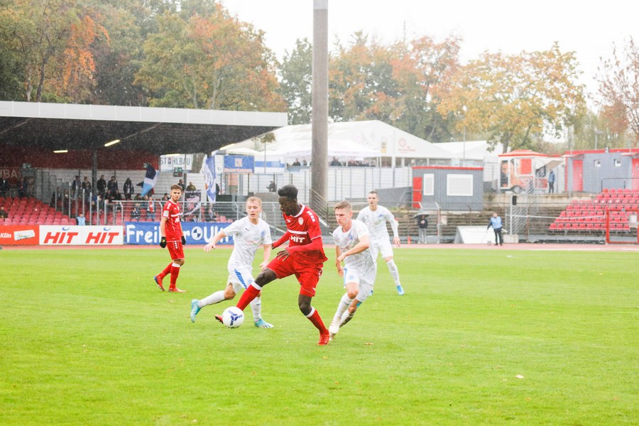 Das Spiel lief gerade mal ein paar Sekunden und einige Fans waren sicher noch auf der Suche nach einem Platz, als Fortuna den ersten Angriff startete und in der 1. Minute durch Hamza Salman in Führung ging. Er bekam den Ball von Ochojski aufgelegt und schloss am zweiten Pfosten ab. Torwart Alexander Eiban versuchte erfolglos den Ball noch von der Linie zu kratzen - 1:0 für die Südstädter. Lotte brauchte ein paar Minuten, um ins Spiel zu kommen, meldete sich dann aber mit einer Ecke zurück. Filip Lisnic sprang zum Kopfball hoch, setzte seinen Versuch aber über das Tor (7.). Spieler und Fans forderten in der 13. Minute einen Elfmeter für Fortuna. Mike Owusu setzte sich über rechts durch und wurde im Strafraum gelegt. Schiedsrichter Alexander Ernst sah aber kein Vergehen. Auf der anderen Seite sah Erhan Yilmaz eine gute Möglichkeit aus der Distanz. Sein Schuss ging jedoch knapp rechts vorbei (20.). In der 25. Minute hatte Fortuna erneut durch Mike Owusu die beste Torchance nach dem 1:0. Ein langer Ball sprang vor der Abwehr auf, die sich komplett verschätze, sodass Owusu hinter der letzten Kette an den Ball kam und allein auf den Torwart zulief. Eiban fuhr jedoch das Bein aus und bewahrte sein Team vor dem zweiten Gegentreffer. Die Gäste fanden die schnelle Antwort und trafen nur eine Minute später die Latte. Abderrahmane kratzte den Ball im Anschluss aber noch von der Linie (26.). Es regnete und beide Mannschaften versuchten den Ball auf dem nassen Untergrund schnell laufen zu lassen. Das Spiel wurde schneller, ohne, dass es beide Mannschaften in die gefährlichen Gebiete schafften – bis zur 40. Spielminute. Owusu zog auf der linken Seite nach innen und suchte aus gut 25 Metern den Abschluss, platzierte seinen Schuss aber zu hoch. Kurz vor der Halbzeit hatten die Gastgeber nochmal eine Ecke, die allerdings nicht für Gefahr sorgte. So ging es mit der knappen Führung in die Kabine.