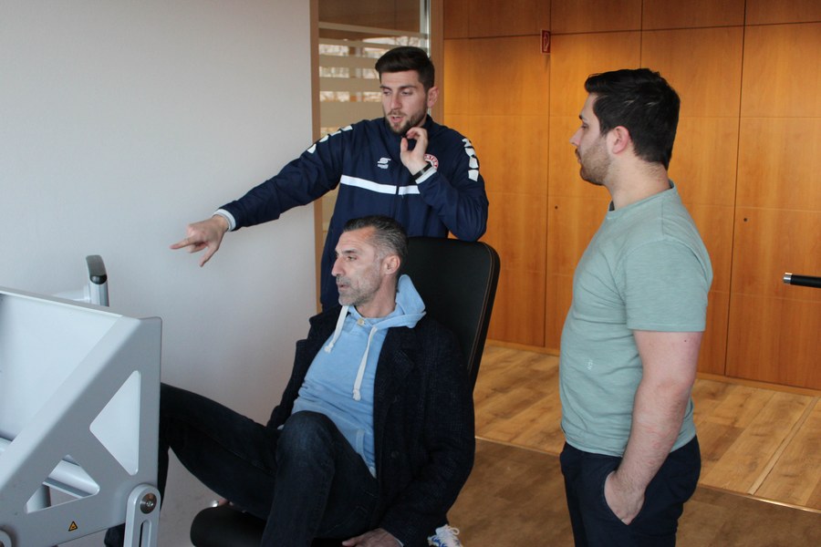 Weiter ging die Tour schließlich zu Dr. Ulrich Müller Lung. Bereits seit 2017 unterstützt er gemeinsam mit seinem Team der Radiologischen Praxis Köln die Fortuna. Die Praxis befindet sich im Gebäude des Malteserkrankenhauses St. Hildegardis und verfügt über ein Untersuchungsgerät für Kernspintomografie (MRT) sowie ein Untersuchungsgerät für die Computertomographie (CT). Im Vergleich wirkt die Praxis relativ klein, bietet jedoch genau durch diese Aspekte die perfekte und persönliche Unterstützung für die Spieler. Mit seinem Team sorgt Dr. Ulrich Müller Lung für die genaue Abbildung der Verletzung, die die Grundlage der Diagnose und der späteren Behandlung darstellt.