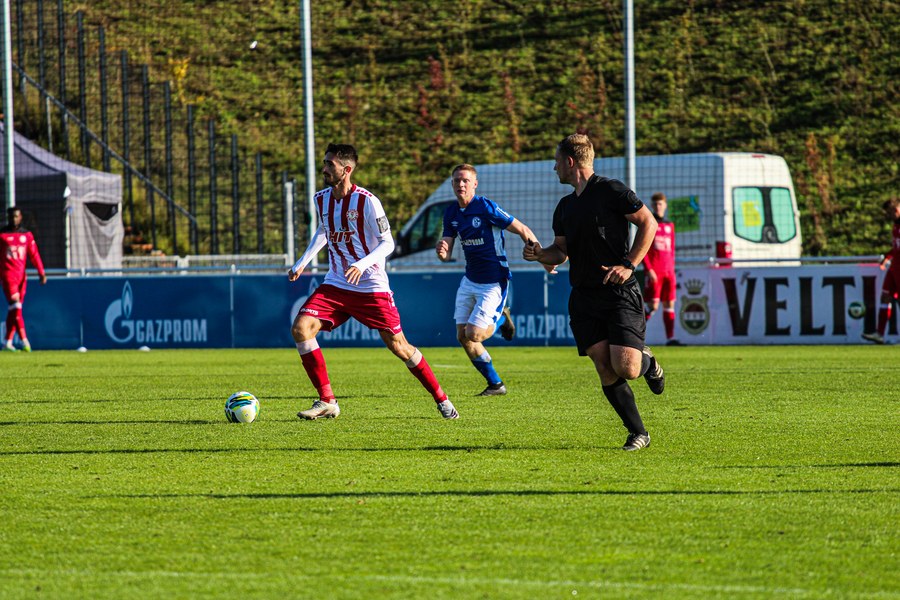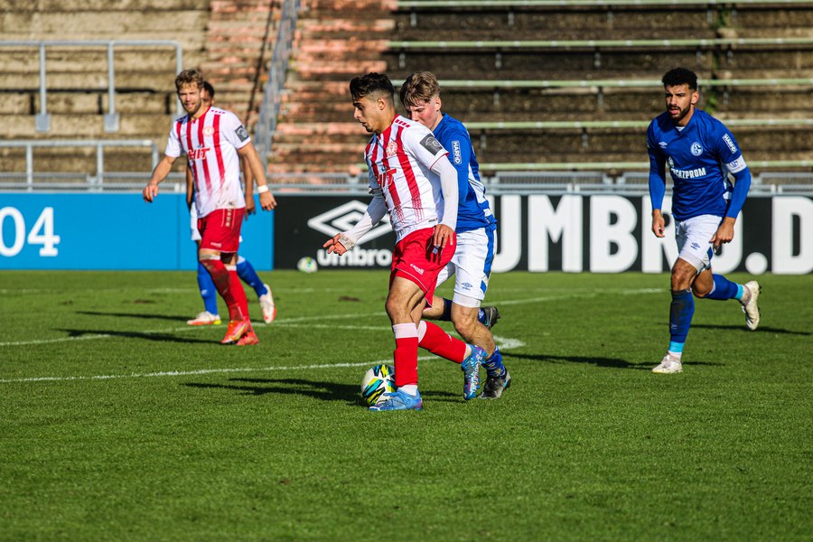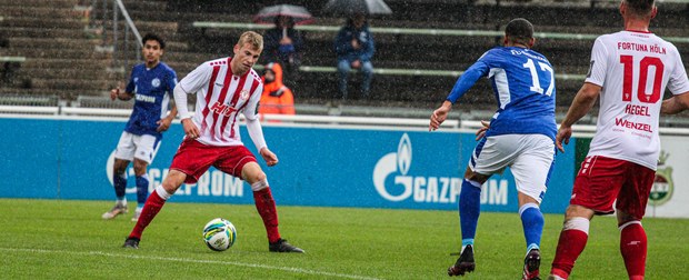 Die Fortuna startete mit viel Ballbesitz in die Partie und konnte das Spiel größten Teils in der gegnerischen Hälfte halten. Bereits in der 4.Minute der Partie erhielten die Kölner einen Freistoß. Der Ball kam zentral in den Sechzehner und Dieckmann versuchte den ersten Ball aufs Tor mit dem Kopf zu verlängern. Allerdings war der Schalker Torwart Felix Wienland zu Stelle. Nach knapp zehn Minuten befanden sich die Schalker erstmals in der tiefen Hälfte der Südstädter und versuchten zum Tor durchzukommen. Maik Kegel konnte den Ball jedoch vorerst für die Kölner klären. Die Kölner konnten das Spiel schnell wieder auf die andere Seite verlagern und Dieckmann probierte es im Alleingang. Er setzte sich auf Höhe des Sechzehners gegen zwei Schalker Gegenspieler durch und schoss aus der Distanz aufs Tor. Der Ball flog gut, doch der Schalker Keeper war zu Stelle und parierte zur Ecke für die Südstädter (12.Minute). Im weiteren Spielverlauf versuchte die Fortunen das Spiel in der gegnerischen Hälfte zu halten, doch die großen Torchancen blieben aus. Owusu versuchte es nach Ballgewinn im Alleingang durch die Mitte. Kurz vor dem Tor kam er zum Schuss doch der Torwart war da und klärte zu einer weiteren Ecke für die Kölner. Die Ecke von der rechten Seite kam zentral in den Sechszehner und Löhden verlängerte mit dem Kopf. Doch hinter im stand kein Mitspieler, der den Ball verwerten konnte (21.Minute). Kurz drauf waren die Gastgeber im Anmarsch auf das Kölner Tor, doch der Linienrichter hob de Flagge zum Abseits und der Angriffs aufs Tor war damit beendet (27.Minute). In der 35. Minute erspielen sich die Kölner die erste riesige Torchance. Najar passte den Ball auf Marquet, der noch weiter in den Torraum lief und schoss. Doch auch hier war der Torwart wieder zur Stelle und klärt zu Ecke. Auch in den letzten fünf Minuten der ersten Hälfte gaben die Kölner nicht auf und versuchten die noch die Führung zu erzielen. Försterling passte gut 25m vor dem Tor auf Owusu. Dieser lief weiter in den Sechzehner, kam allerdings nicht zum Schuss. Hölscher stand jedoch bereit und versuchte sein Glück, doch der Ball landete in den Händen des Schalker Keepers.