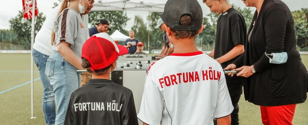 Um 11 Uhr fiel der Startschuss am Vereinsheim und auf dem Kunstrasengelände des Jean-Löring Sportparks. Es gab ein buntes Familienfest, bei dem jeder auf seine Kosten kommen konnte. Für das leibliche Wohl war stets gesorgt und Jung und Alt konnten sich vergnügen. Die verschiedenen Abteilungen des S.C. Fortuna Köln haben sich vorgestellt und Spiele vorbereitet. Die Handballabteilung hat ein Wurfspiel vorbereitet und am aufgebauten Kicker sowie der Tischtennisplatte konnten die Besucher gegeneinander antreten. Auch haben sich einige Unternehmen präsentiert und ihre Stände aufgebaut. Nach dem Familienfest ging es dann im Südstadion zur Sache, wo zum letzten Härtetest vor dem Saisonstart am 14. August, der TSV Steinbach Haiger zu Gast war. Die rot-weißen gerieten früh in Rückstand und lagen bereits nach wenigen Minuten mit 0:2 hinten. Neuzugang Marquet konnte zwar verkürzen, Steinbach legte jedoch noch mal und gewann mit 1:3. Das Highlight war nach dem Spiel dann der Besuch der Mannschaft im Vereinsheim, wobei sie den Abend gemeinsam mit den Fans ausklingen ließen. Das stürmische Wetter und die Niederlage im Spiel haben die gute Stimmung nicht trüben können.