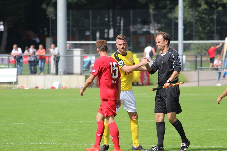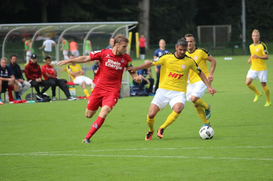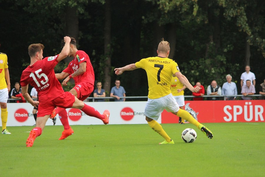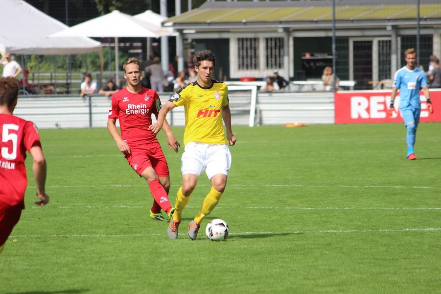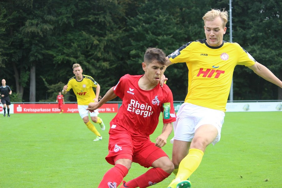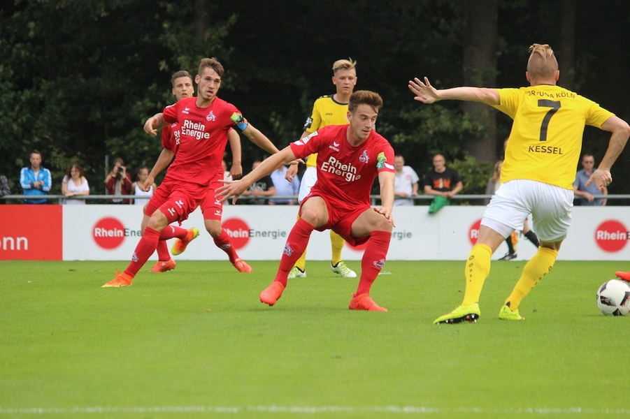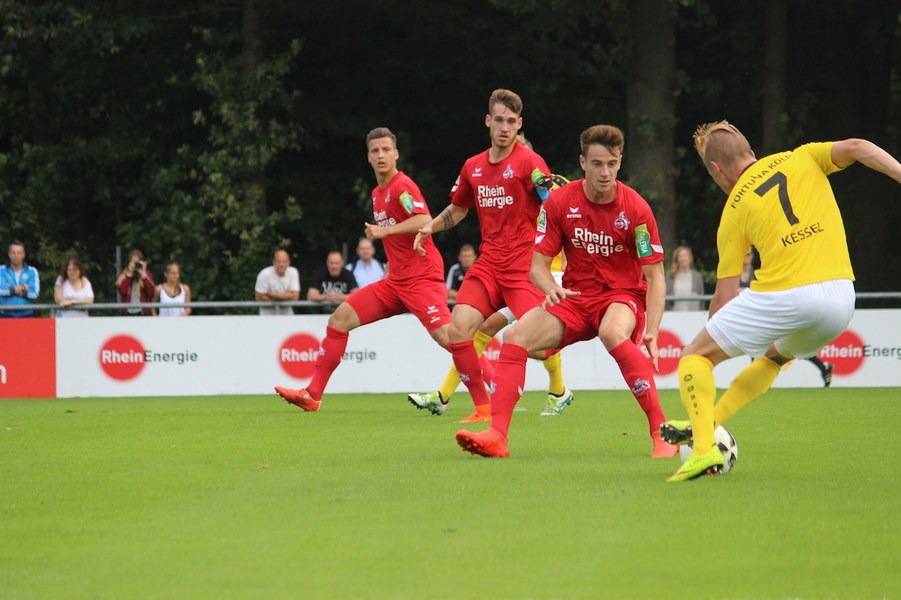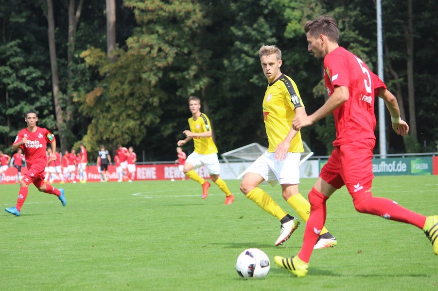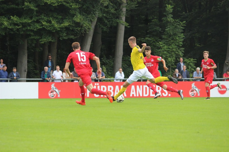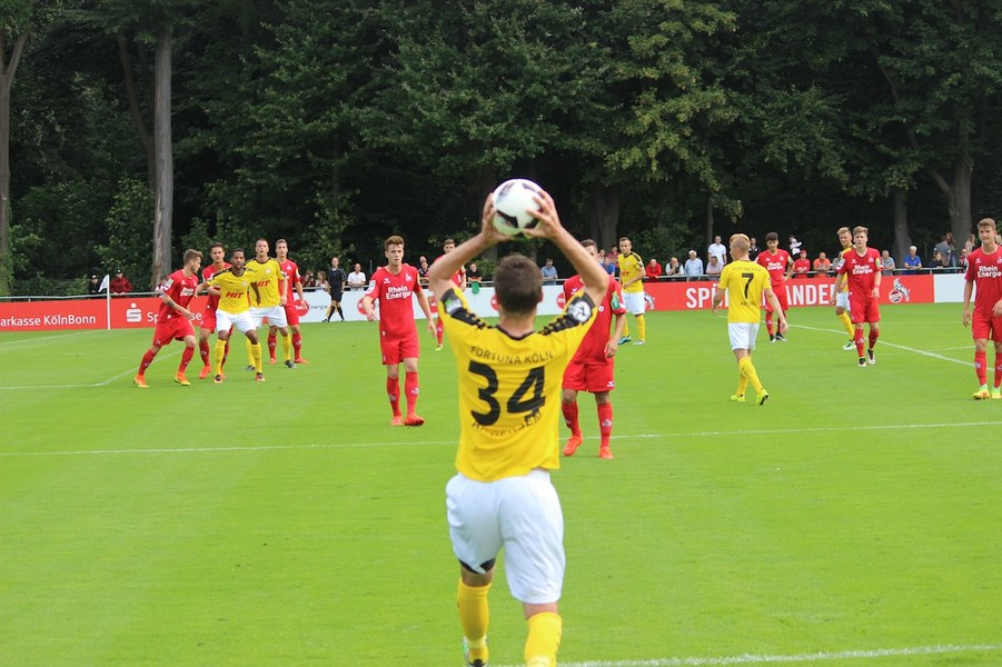 Von Beginn an ging die Fortuna mit der notwendigen Ernsthaftigkeit in den Test gegen die jungen Geißböcke. So setzte Röcker mit einem resoluten Zweikampf früh das erste Zeichen. Die Südstädter versuchten von hinten heraus das Spiel zu kontrollieren, lauerten zugleich aber auch auf Kontermöglichkeiten. Den ersten Torschuss gab jedoch der FC in Person von Bauer ab, nach einem Ballverlust der Fortuna (11.). Danach bestimmte der Drittligist jedoch die Partie. Immer wieder versuchte man schnell nach vorne zu spielen. Nach einem Konter des FC schaltete die Fortuna schnell um, sodass sich Rahn aus der Distanz probieren konnte (19.). Wenige Minuten zuvor wurde der Stürmer nach einem blitzsauberen Konter über Engelman in aussichtsreicher Position wegen Abseits zurückgepfiffen. Trotzdem ging die Fortuna anschließend in Front: Nach einem Ballgewinn von Engelman marschierte Andersen in Richtung FC-Tor. Schließlich war es Kessel, der nach Spielverlagerung von Bösing trocken ins kurze Eck verwandelte - 1:0 für die Fortuna (26.). Der Regionalligist kam gegen kompakte und giftige Südstädter nicht zur Entfaltung. Vielmehr hat Stoffels einen Distanzschuss für die Fortuna parat (39.). Dass die jungen Geißböcke aber nicht zur Entfaltung kamen, lag auch an der Aggressivität des Drittligisten. So war es nicht überraschend, das mit Stoffels ein Fortune kurz vor der Pause die einzige Verwarnung in der Partie sah (43.).