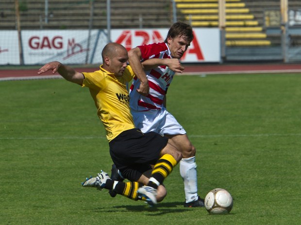 (Kapitän Stephan Glaser setzt sich hier schön im Zweikampf durch und bereitete auch das zweite Tor von Fabian Montabell vor, Foto: Gert König)