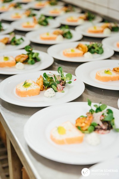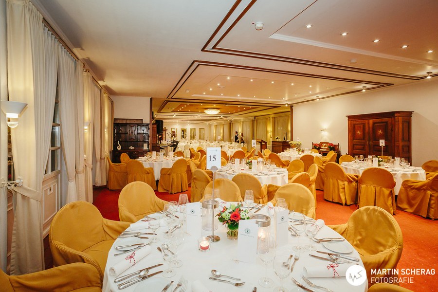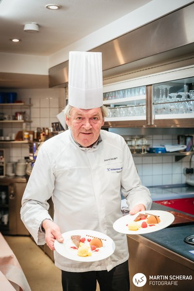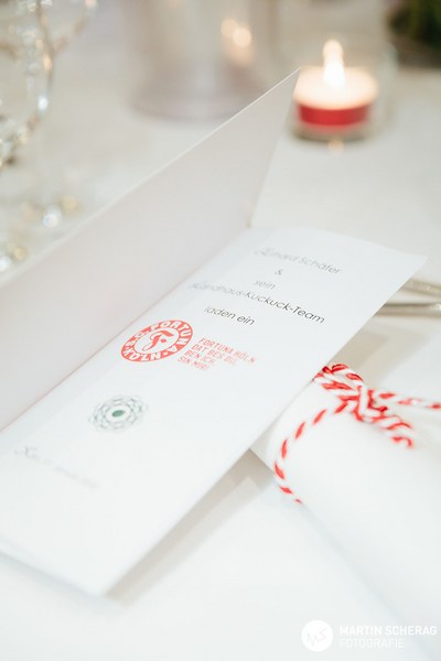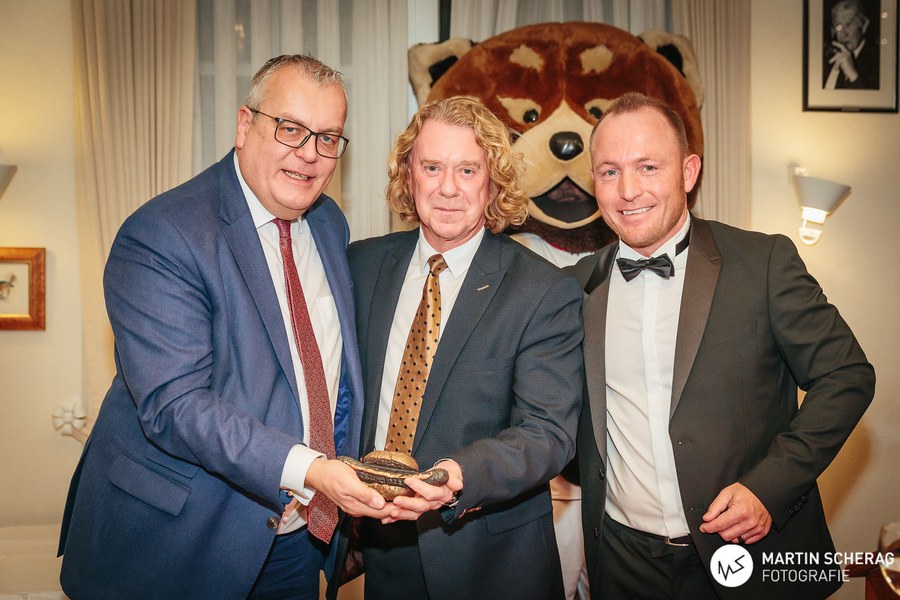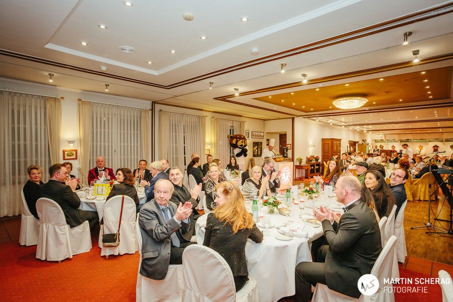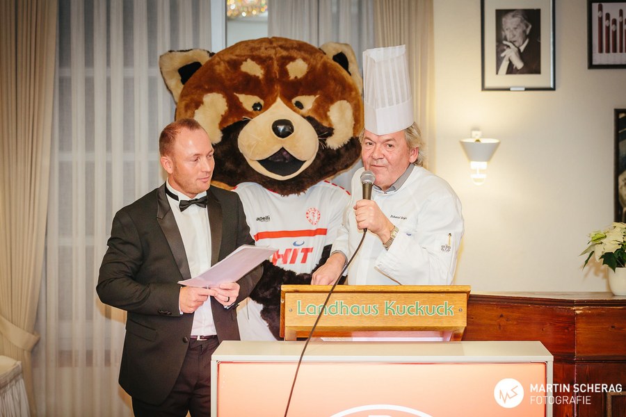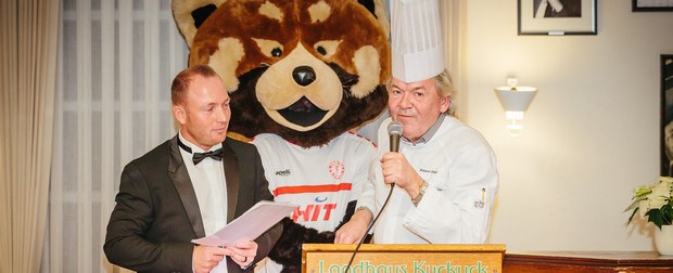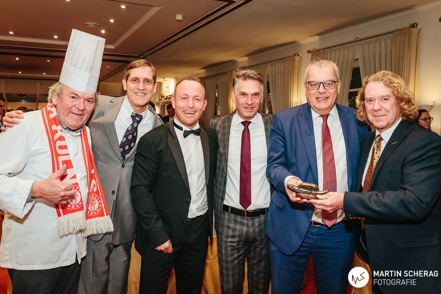 Nach einem kurzen Sektempfang und gereichten Häppchen des Hauses nahmen die rund 130 Gäste an den gedeckten Tischen Platz. Passend zum Anlass, deckte das Landhaus die Tische in rot und weiß. Zunächst übernahm der Gastgeber des Abends das Wort und begrüßte die Gäste, sowie die 1. Mannschaft der Fortuna. Schließlich reihte sich Benjamin Bruns, Geschäftsführer der Südstädter, zu den Rednern und überreichte Erhard Schäfer als kleine Aufmerksamkeit einen unterschriebenen Spielball, sowie das gelb-schwarze Traditionstrikot. Dann fiel der Startschuss für das vier Gänge Menü.