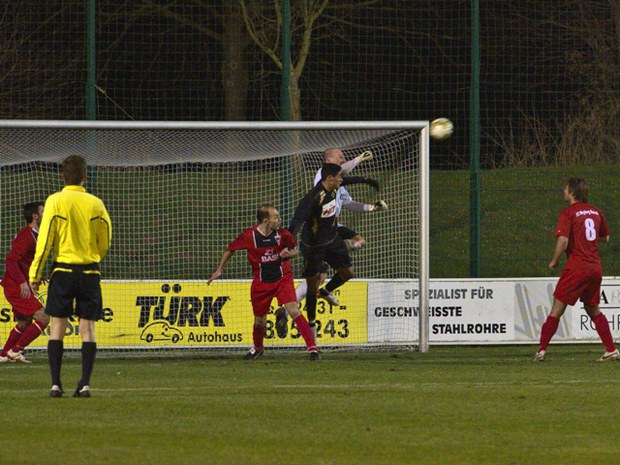 (Der Wegberger Torwart Sascha Rodemers, hier im Duell mit Handi Dahmani, war zu bedauern - gleich dreimal musste er den Ball aus dem eigenen Netz holen, Foto: Gert König)