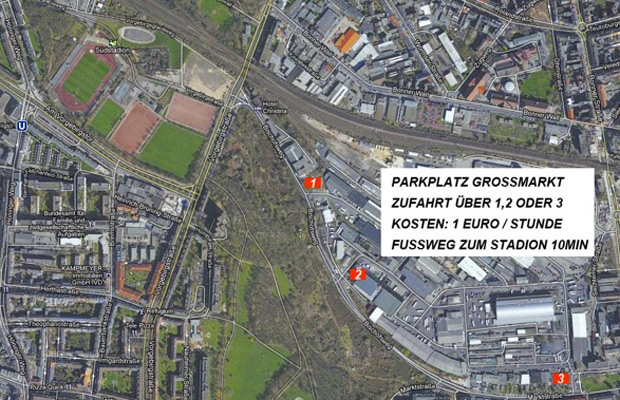 Beim Heimspiel gegen den Wuppertaler SV am kommenden Freitag (Anstoß 19 Uhr) steht der große Asche-Parkplatz hinter dem Südstadion, aufgrund des Zelt-Aufbaus des „KölschFestes“, nicht zur Verfügung. Alternativ könnt ihr euer Auto auf dem Großmarkt-Parkplatz (siehe Bild) abstellen. Von dort erreicht ihr das Stadion zu Fuß in ca. 10 Minuten. Die Parkgebühren belaufen sich auf 1€/Stunde.