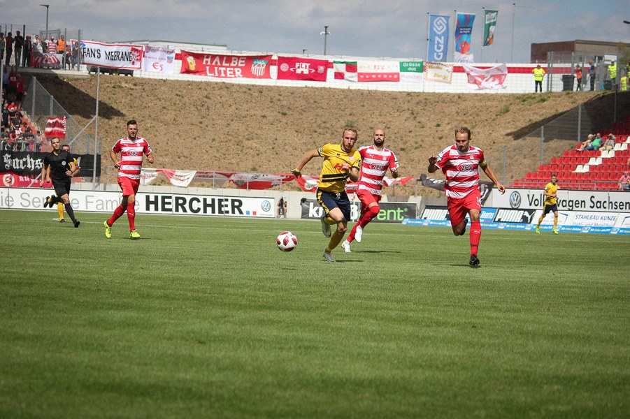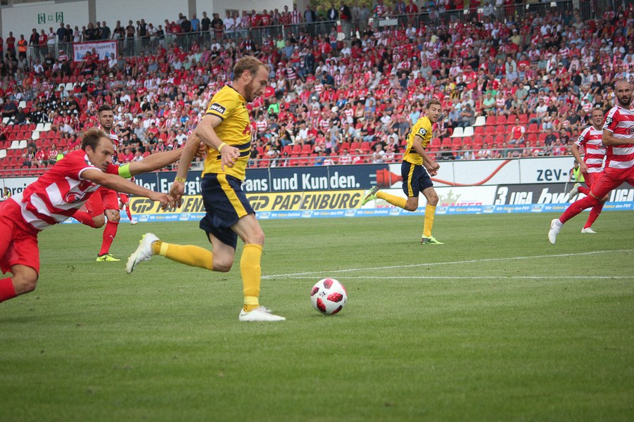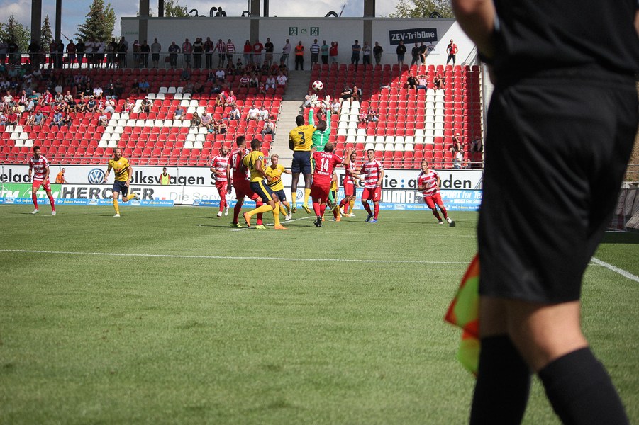 Die Teams ließen sich etwas Zeit, bis sich die Statistikzettel der Medienvertreter füllten. Das Tempo der Partie war zunächst nicht so hoch wie noch bei hochsommerlichen Temperaturen unter der Woche gegen den Karlsruher SC. Die Anfangsphase dieses Auswärtsspiels war geprägt von kleineren Fouls und Ungenauigkeiten. Auch nach einer Viertelstunde waren beide Torhüter noch nicht wirklich gefordert. Die Fortuna versuchte es neben einigen spielerischen Ansätzen auch oft, Michael Eberwein mit einem langen Ball aus der Defensive zu erreichen und so durch den verlängerten Ball per Kopf Moritz Hartmann ins Spiel zu bringen. Nach rund zwanzig Minuten entwickelte die Fortuna ein leichtes Übergewicht in Sachen Ballbesitz. Immer wieder spielte man sich gefällig bis an den Strafraum der Gastgeber heran. Die beste Chance bis dahin hatte Hartmann, als er aus der Drehung an Brinkies scheiterte (27.). Dabei blieb es vorerst auch, auch wenn die Fortuna die langen Bälle seltener werden ließ und sich teils konzentriert in die Hälfte des FSV kombinierte. Dennoch waren es die Schwäne, die gegen Ende der ersten Hälfte so etwas wie eine Chancen hatten, als Reinhardt es flach aus der Distanz versuchte (41.). Das sollte es dann für die erste Spielhälfte gewesen sein.