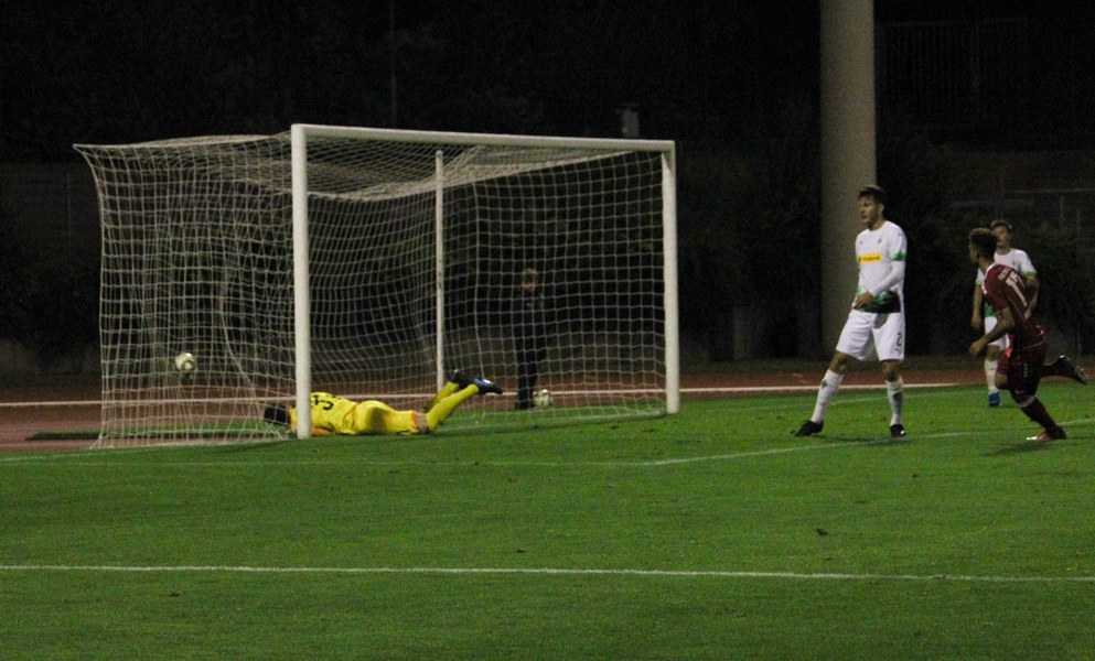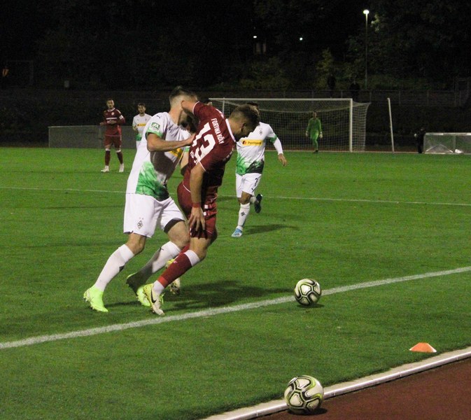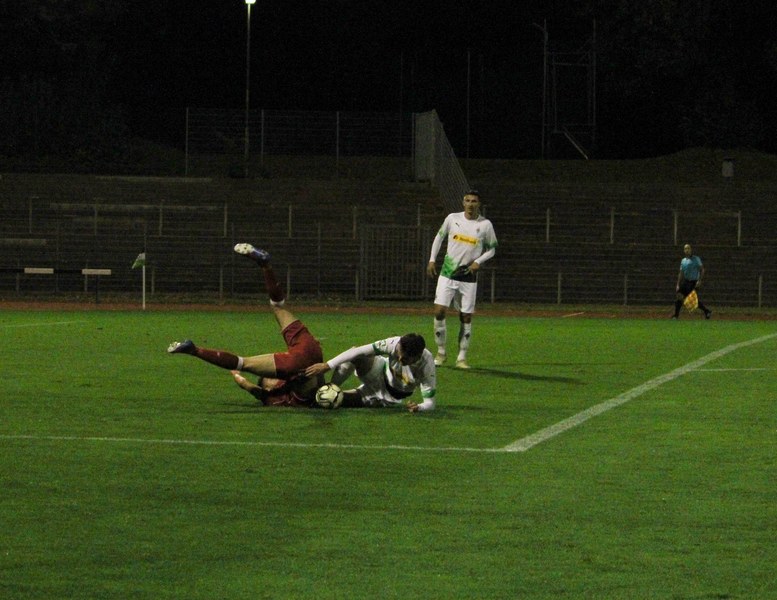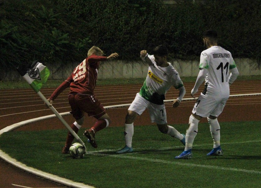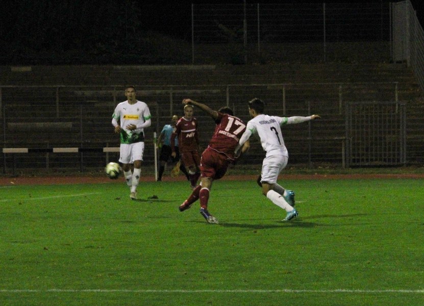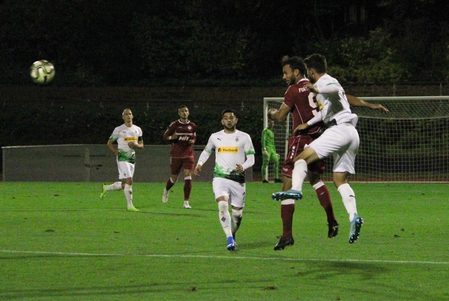 In den Anfangsminuten setzte die Borussia die ersten Akzente des Spiels. Nach Fehlpass von Försterling im Mittelfeld, zog Italiano Richtung Tor und suchte an der Strafraumkante den Abschluss. Kevin Rauhut lenkte den Ball sicher zur Ecke (3.). Nur eine Minute später hatte die Fortuna Glück, als ein abgefälschter Schuss knapp neben dem Kasten landete (4.). Bereits in den Anfangsminuten mussten die Kölner aufpassen, nicht in Rückstand zu geraten. Die Fortuna tauchte durch eine Ecke erstmals gefährlich vor dem Kasten von Max Grün auf. Den hereingeschlagenen Ball klärte Gladbach im ersten Versuch. Prokoph nutzte jedoch die zweite Welle, um den Ball vor das Tor zu köpfen, fand dort aber keinen Mitspieler (8.). Auf der anderen Seite versuchte es Cirillo mit einem Distanzschuss, der nur knapp am langen Pfosten vorbei ging (12.). Jubeln durfte zehn Minuten später dann aber die Fortuna. Nach starker Balleroberung im Mittelfeld machte sich Mike Owusu auf den Weg nach vorne und legte vor dem Kasten noch einmal quer auf Salman, der den Ball mit Hilfe eines Gladbacher Beins im Kasten versenkte (22.). Der Schrei nach dem Tor machte deutlich, wie wichtig dieser Treffer war. Es zeigte sich ein offenes Spiel, in dem die Fortuna mehr Kontrolle hatte, als noch zu Beginn der ersten Halbzeit. Gladbach versuchte es immer wieder aus der Distanz, fand seinen Meister aber oftmals in Kevin Rauhut, während Fortuna schnelle Konter nutzte, um für Akzente zu sorgen. So war es Alem Koljic, der über die rechte Offensivseite das Tempo anzog und an der Kante zum Strafraum flach vor das Tor spielte, wo Roman Prokoph im Hereinrutschen knapp verpasste (39.). So ging es mit der knappen Führung der Südstädter in die Pause.
