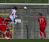 (Fabian Montabell köpft in unnachahmlicher Manier zur Führung ein, Foto: Gert König)