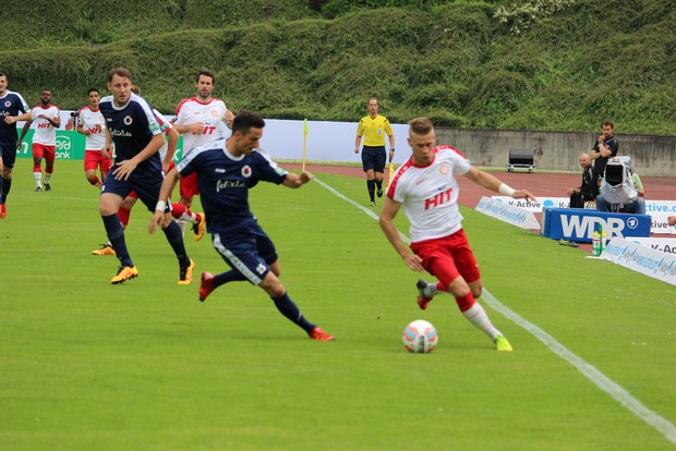 Die Fortuna kam dabei vielversprechend in die Partie und konnte früh Akzente setzen: Nach einem Bender-Freistoß musste Pellatz einen Biada-Kopfball auf der Linie klären (6.). Die anschließende Ecke landete auf dem Kopf von Uaferro, der erneut Pellatz prüfte (6.). Die Viktoria versuchte mit Härte in die Partie zu finden. Die Fortuna zeigte sich davon zunächst unbeeindruckt. Allerdings kam der Regionalligist nach einer knappen Viertelstunde auch spielerisch besser zum Zug. Reimerink war da auf links ein Aktivposten, nach dessen Flanke Jansen die Latte traf (15.). Kurz darauf musste sich Boss nach einem Wunderlich-Freistoß erstmals strecken (16.). Die Partie im Bonner Sportpark war bei schwülen Temperaturen von Beginn an tempo- und abwechslungsreich. Nach einer kurzen Verschnaufpause verzeichneten Biada und Wunderlich die nächsten Offensivaktionen (23.). Es entwickelte sich eine umkämpfte Jagd nach dem Ball, bei der die Fortuna immer wieder auf schnelle Umschaltsituationen lauerte. Die Partie beruhigte sich Mitte der 1. Halbzeit aber zusehends. Erst ein härterer Zweikampf zwischen Jansen und Uaferro inklusive Rudelbildung küsste dieses Finale wieder wach (34.). Spielerisch passierte allerdings lange nichts. Erst kurz vor dem Seitenwechsel musste Boss eine Reimerink-Flanke vor dem einköpfbereiten Wunderlich abfangen (45.).