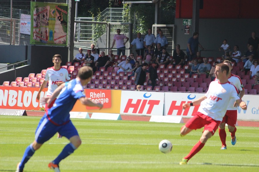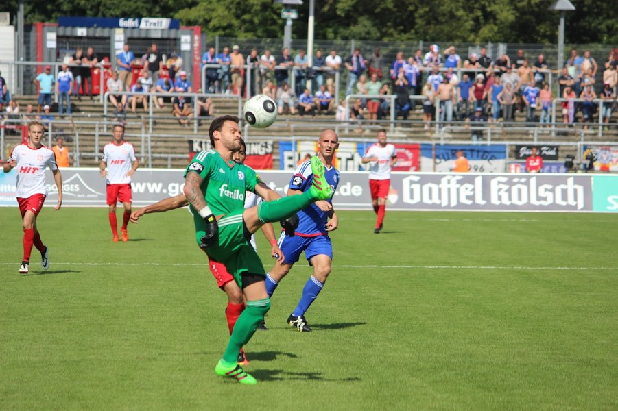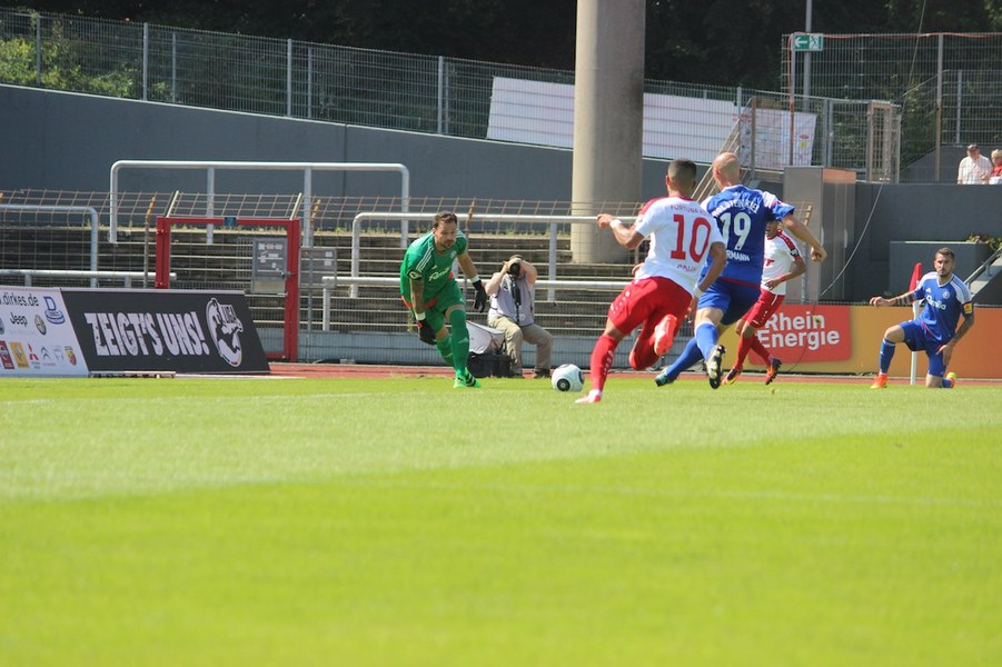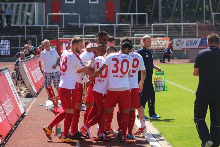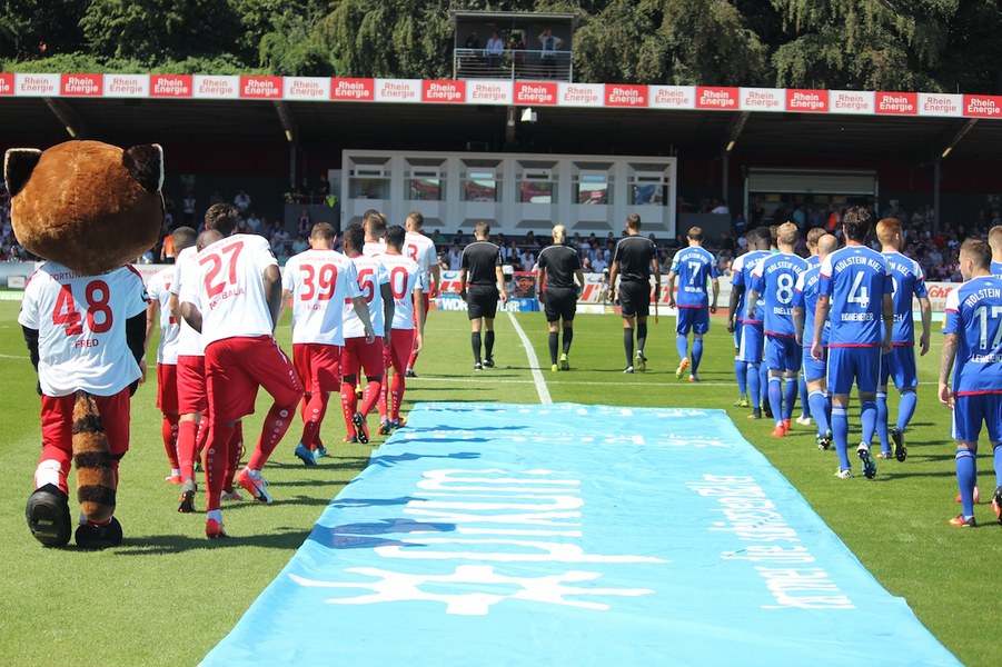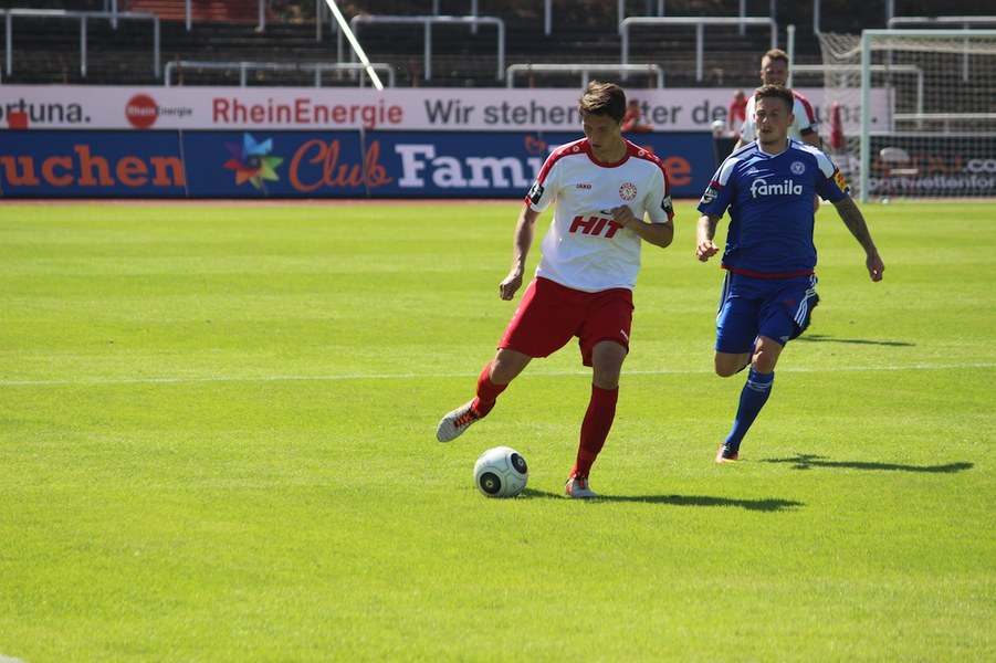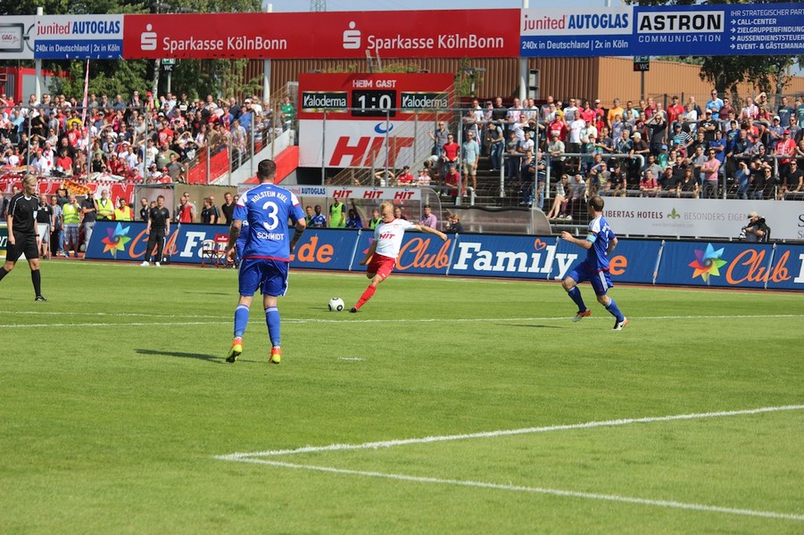 Die Partie im Südstadion begann bei sonningen Temperaturen allerdings schleppend. Beide Mannschaften tasteten sich vorsichtig rein. So offenbarte sich eine ereignisarme Anfangsphase mit vielen Aktionen zwischen den Strafräumen. Erst ein Schuss von Souza aus dem Rückraum küsste die Partie so langsam wach (16.). Kiel stellte vorne früh zu, aber bis auf Einzelaktionen von Drexler strahlte man nur selten echte Torgefahr aus. Aus dem Nichts ging die Fortuna dann in Führung: Nach einem Ballgewinn von Flottmann schickte Rahn den durchstartenden Fortuna-Kapitän auf die Reise. Der schob frei vor Kiels Keeper Kronholm zum 1:0 für die Südstädter ein (21.). Das Spiel blieb aber weiter ereignisarm, weil beide Mannschaften auf die Defensive bedacht waren und vorne auf Fehler lauerten. Trotzdem bot sich Kiel die schnelle Chance zum Ausgleich: Nach Dribbling von Drexler tauchte Lewerenz frei vor Boss auf, scheiterte aber am Fortuna-Schlussmann (28.). Die Südstädter tauchten offensiv mit einem Souza-Freistoß auf (31.). Insgesamt schraubte Kiel nun aber am Tempo und verlagerte das Spielgeschehen in die Kölner Hälfte. So bot sich nach einem Ballgewinn von Holstein für Lewerenz die nächste Großchance auf den Ausgleich, aber wieder war Boss Endstation (35.). Die kurze Kieler Drangphase bekam die Fortuna aber anschließend wieder in den Griff. Besonders Drexlers Aktionsradius konnte man nun eindämmen. So nahm die Elf von Trainer Uwe Koschinat eine Führung in die Kabine.