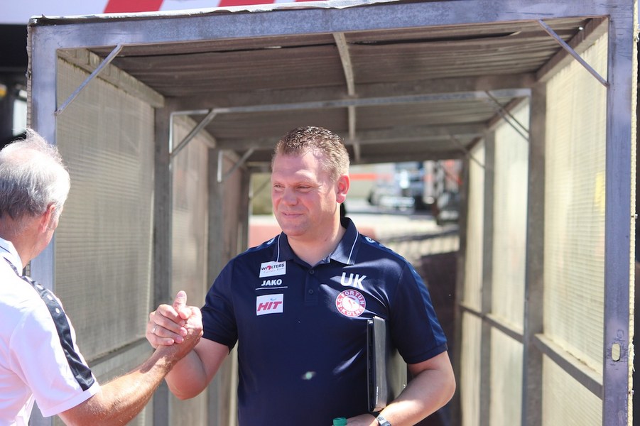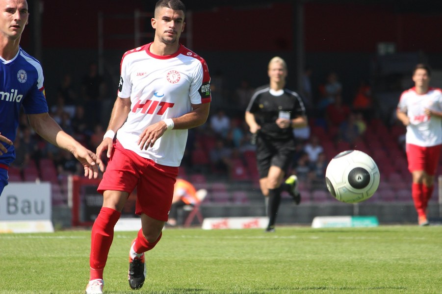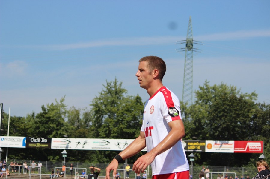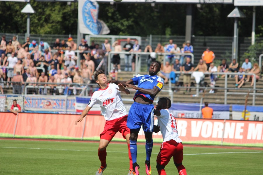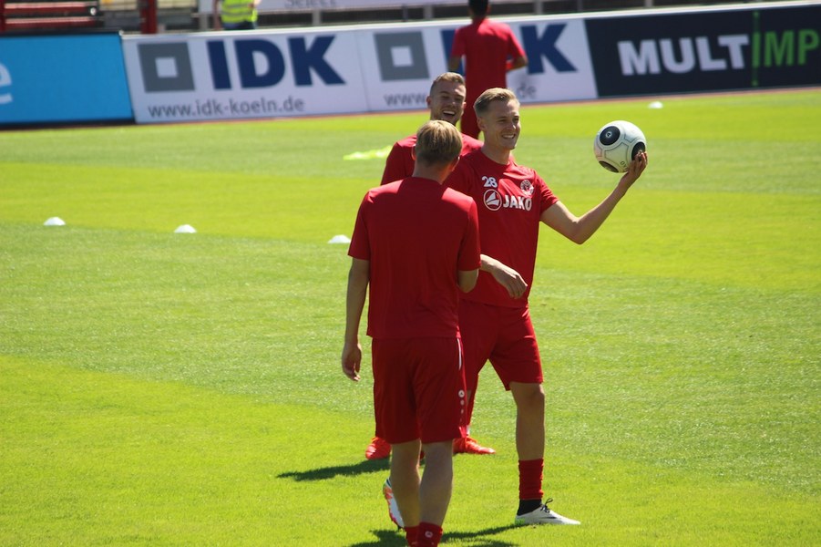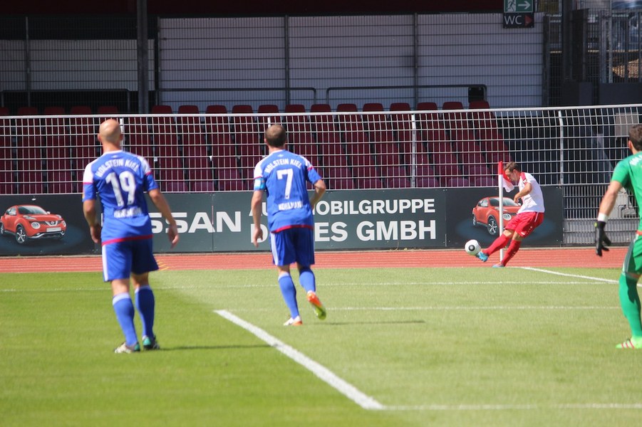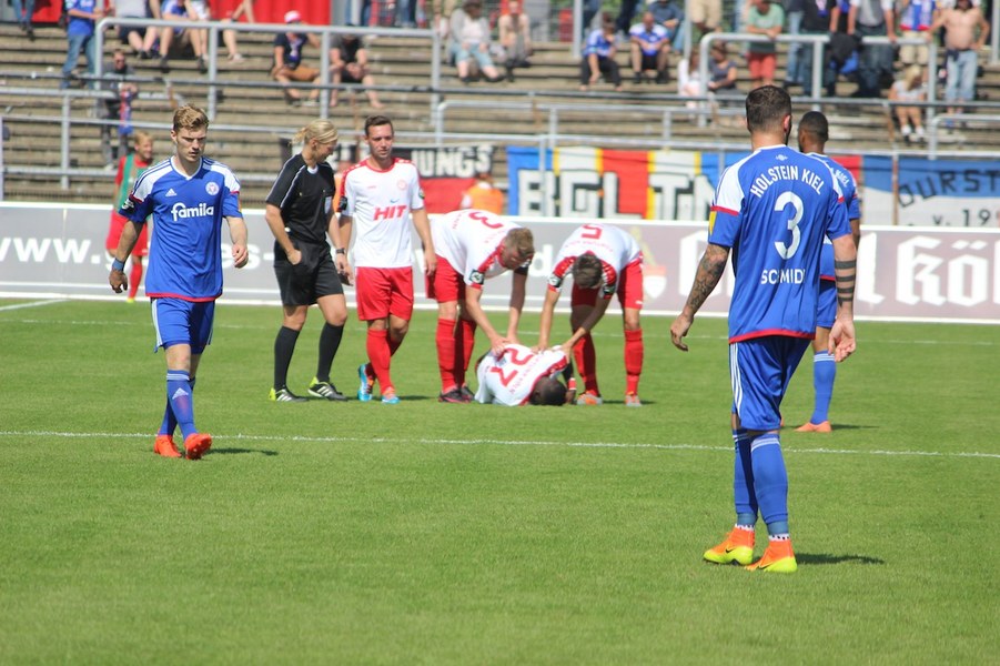 Die Partie im Südstadion begann bei sonningen Temperaturen allerdings schleppend. Beide Mannschaften tasteten sich vorsichtig rein. So offenbarte sich eine ereignisarme Anfangsphase mit vielen Aktionen zwischen den Strafräumen. Erst ein Schuss von Souza aus dem Rückraum küsste die Partie so langsam wach (16.). Kiel stellte vorne früh zu, aber bis auf Einzelaktionen von Drexler strahlte man nur selten echte Torgefahr aus. Aus dem Nichts ging die Fortuna dann in Führung: Nach einem Ballgewinn von Flottmann schickte Rahn den durchstartenden Fortuna-Kapitän auf die Reise. Der schob frei vor Kiels Keeper Kronholm zum 1:0 für die Südstädter ein (21.). Das Spiel blieb aber weiter ereignisarm, weil beide Mannschaften auf die Defensive bedacht waren und vorne auf Fehler lauerten. Trotzdem bot sich Kiel die schnelle Chance zum Ausgleich: Nach Dribbling von Drexler tauchte Lewerenz frei vor Boss auf, scheiterte aber am Fortuna-Schlussmann (28.). Die Südstädter tauchten offensiv mit einem Souza-Freistoß auf (31.). Insgesamt schraubte Kiel nun aber am Tempo und verlagerte das Spielgeschehen in die Kölner Hälfte. So bot sich nach einem Ballgewinn von Holstein für Lewerenz die nächste Großchance auf den Ausgleich, aber wieder war Boss Endstation (35.). Die kurze Kieler Drangphase bekam die Fortuna aber anschließend wieder in den Griff. Besonders Drexlers Aktionsradius konnte man nun eindämmen. So nahm die Elf von Trainer Uwe Koschinat eine Führung in die Kabine.