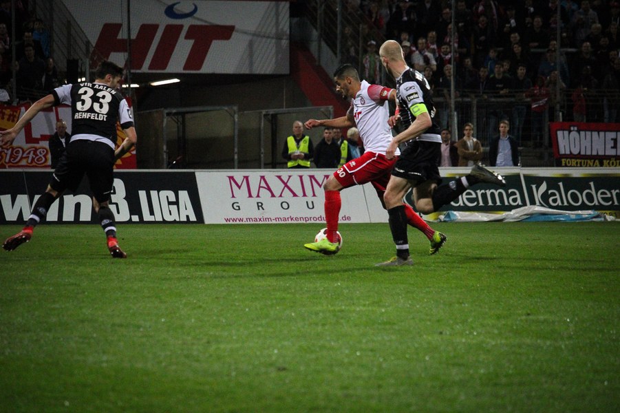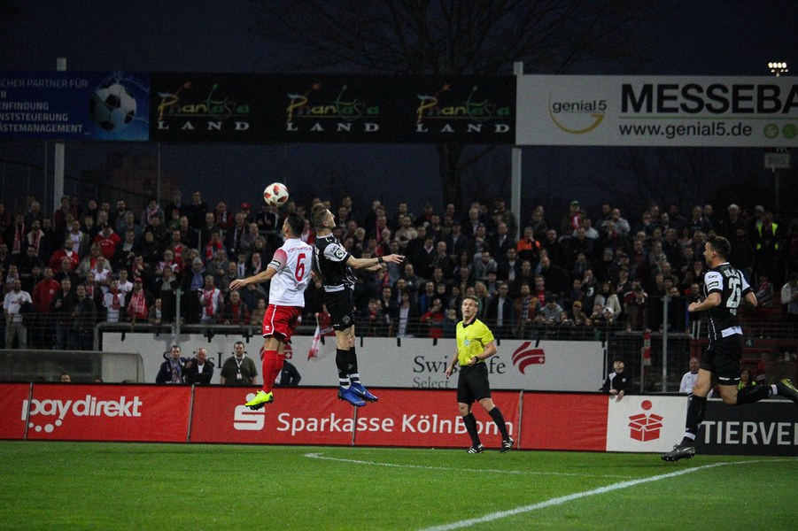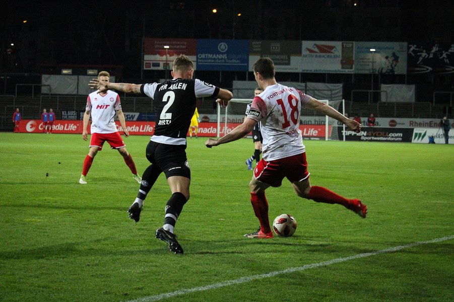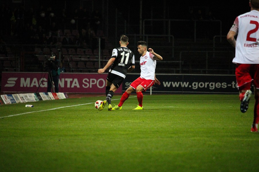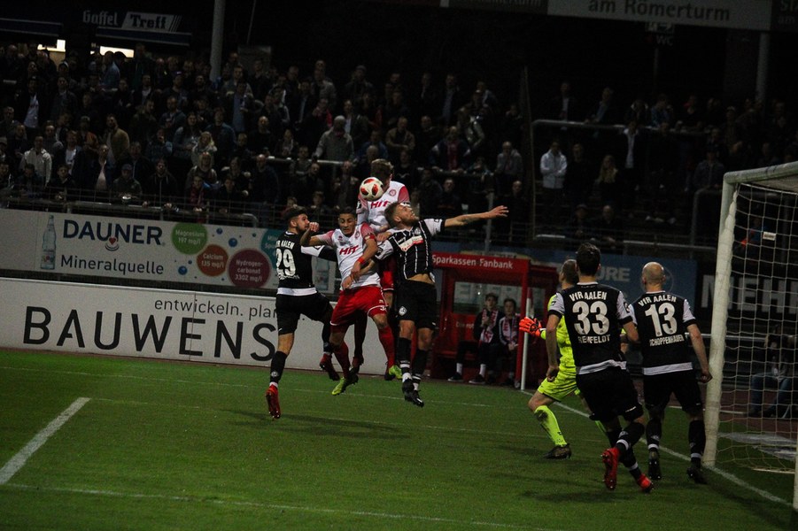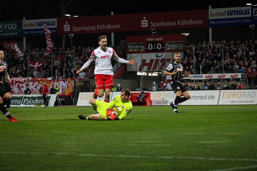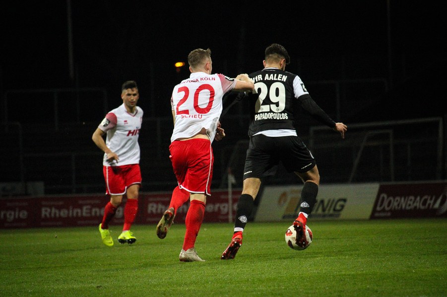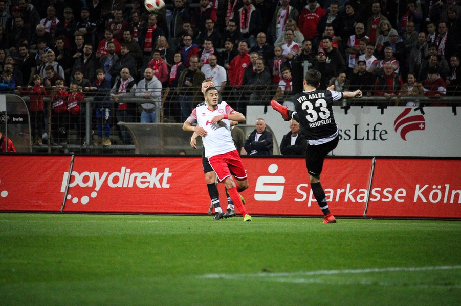 Die Bedeutung des Spiels war den Aktionen von der ersten Minute an anzumerken. Beide Teams agierten erst einmal sehr kontrolliert. Damit waren klare Möglichkeiten am Anfang Mangelware. Nach zehn Minuten sicherte sich Fortuna Köln mehr Spielanteile. Doch nach Foul von Robin Scheu bekam Aalen in der 19. Minute eine gute Freistoßchance. Nikolai Rehnen parierte den Linksschuss von Nicolas Sessa aus 28 Metern mit beiden Händen. Fünf Minuten später war es Stephan Andrist, der aus aussichtsreicher Position am Kölner Keeper scheiterte. Auch in der 30. Minute bewahrte Rehnen die Fortuna vor einem Rückstand. Ein Kopfball von Andrist nur 60 Sekunden später ging zum Glück der Südstädter ebenfalls knapp am Tor vorbei. Ein Schuss von Antonios Papadopoulos aus 16 Metern landete ebenso über dem Tor (36.).