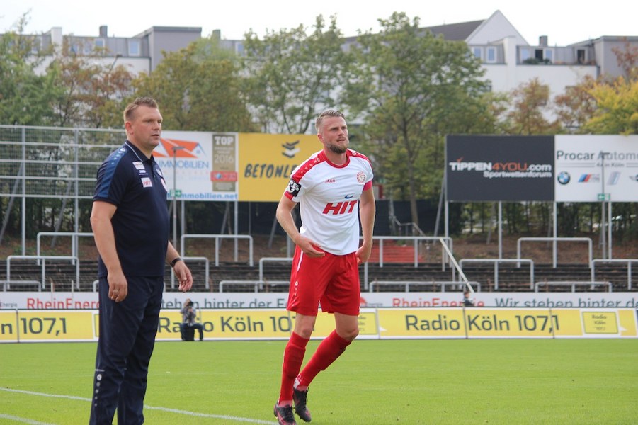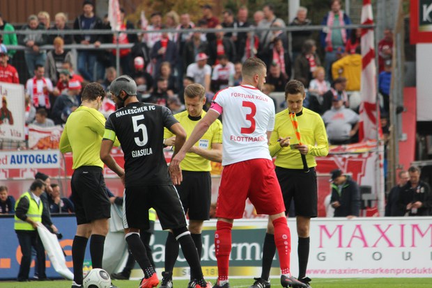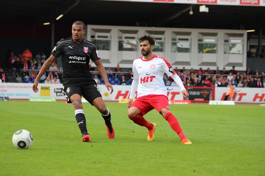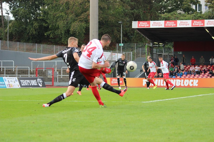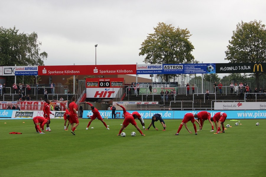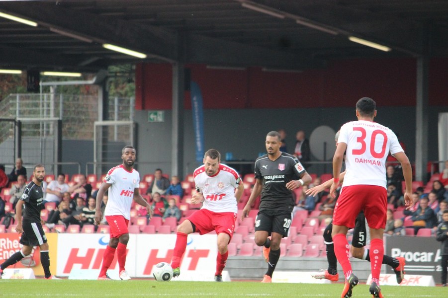 Mit viel Dampf gingen bei Teams ins Duell im Südstadion. Es wurde eine hohe Schlagzahl angeworfen, sodass sich schnell besonders im Mittelfeld ein Abnutzungskampf entwickelte. Im Strafraum war aber lange wenig los, auch wenn Pintol und Dahmani jeweils für ihre Farben erste Abschlüsse verbuchten (7./9.). Halle war aber das etwas griffigere Team, das speziell im Zentrum mit dem auffälligen Fennell selbstbewusster auftrat. Nachdem Pfeffer allein auf das Kölner Tor zu lief und im letzten Moment von Flottmann gestört wurde, erspielten sich die Gäste auf dem Chancenzettel ein leichtes Übergewicht (17.). Das äußerte sich dann auch in Toren, als Fennell eine Flanke aus dem Halbfeld aus kurzer Distanz zur Hallenser Führung einköpfte (26.). Die Fortuna tat sich anschließend schwer, eine Antwort zu geben. Halle agierte kompakt und bot der Kölner Offensive keine Räume, um Druck aufzubauen. So brauchte es einen Eckball, an dessen Ende Souza am zweiten Pfosten in ausreichender Position köpfen konnte (37.). Halle kontrollierte die Partie aber auch weiterhin über die eigene Defensive und setzte mit einem Distanzschuss von Lindenhahn einen offensiven Akzent (43.). Es blieb aber bei der knappen Gästeführung zur Pause.