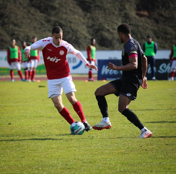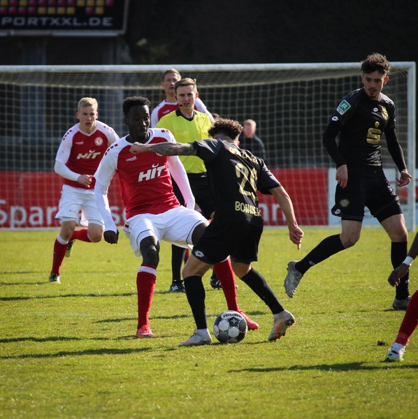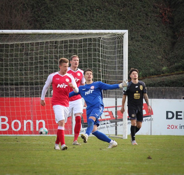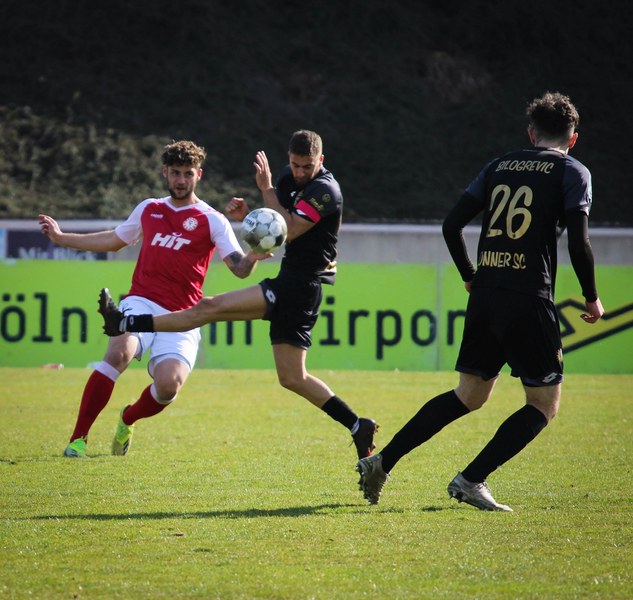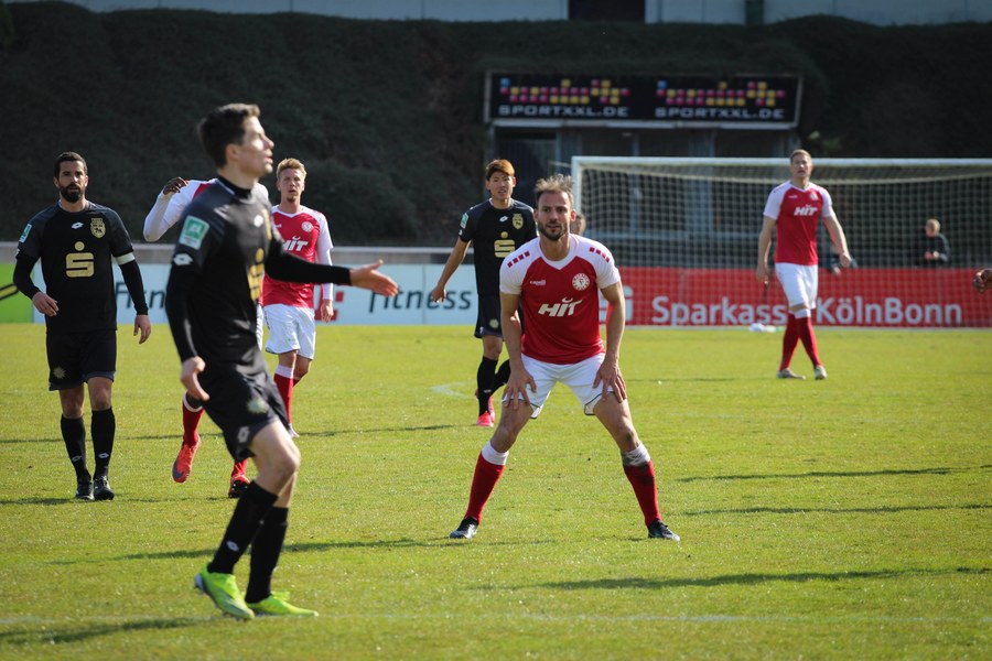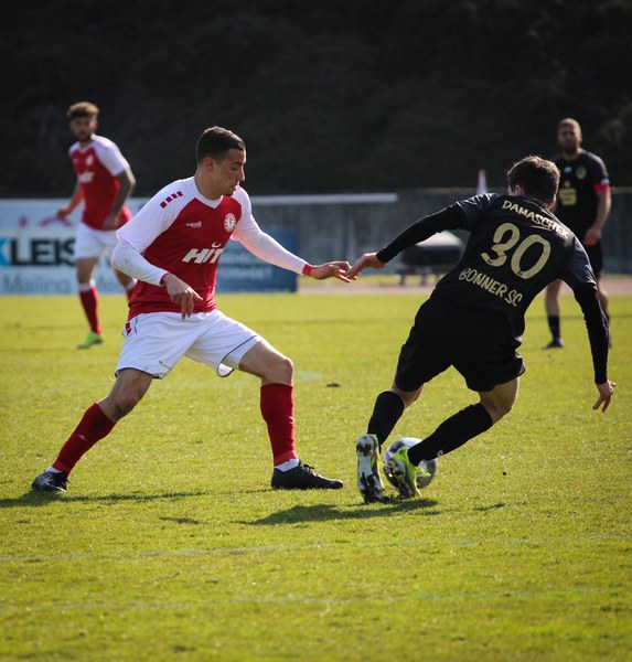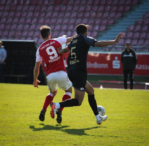 Nach kurzer Anreise spielte die Fortuna heute beim Nachbarn Bonner SC. In der Startelf nahm Cheftrainer Alexander Ende im Vergleich zum vergangenen Spiel einige Änderungen vor: Aufgrund einer Verletzung stand Dominik Lanius heute nicht im Kader, dafür kam Löhden nach seiner Gelbsperre zurück in die Startelf. Außerdem fehlte Poggenberg, Försterling und Salman nahmen zunächst auf der Bank Platz. Najar, Itter und Ubabuike starteten dafür von Beginn an. Bei Sonnenschein pfiff Schiedsrichter Koj die Partie um 14:02 Uhr an. Die erste Chance gehörte den Bonnern. Verteidiger Lippert zog aus gut 30 Metern einfach mal ab und setzte dabei das Spielgeerät deutlich über das Tor. Dies sollte in der ersten Hälfte die nennenswerteste Aktion der Gastgeber bleiben. In der Anfangsphase war direkt zu erkennen, dass das Spiel sehr zweikampfbetont werden sollte. So holte sich Güler bereits in der 13. Minute nach einem Foul an Itter die erste gelbe Karte des Spiels ab. Bonn versteckte sich nicht in der eigenen Hälfte und stellte sich hinten rein, sondern versuchte die Fortuna früh zu stören. Richtig brenzlig wurde es direkt im Anschluss im Bonner Strafraum. Owusu setzte sich in der Mitte durch und knallte den Ball aus fast 25 Metern an die Latte (14.). Bonn gestaltete ihr eigenes Spiel insbesondere mit Hilfe von weit nach vorne geschlagenen Bällen, die die Fortuna bislang aber problemlos klären konnte oder sie stellten die Rheinlöwen ins Abseits. Nach einer Abseitsposition im Fortuna Strafraum schlug Rauhut den Ball per Freistoß in Richtung des Bonner Strafraums. Najar legte von dort aus auf Ubabuike ab, der schlenzte den Ball gefühlvoll unten links in den Kasten des Bonner SC und erzielte dadurch das 1:0 für die Fortuna (26.). Nach dem Rückstand änderten die Bonner ihren Spielstil nicht und agierten weiterhin mit langen Bällen. Vor allem Löhden konnte so gut wie jedes Kopfballduell für sich gewinnen und behielt somit die Lufthoheit. Das von Zweikämpfen geprägte Spiel führte in der 44. Minute durch ein Foul am Bonner Sechzehner zu einer aussichtsreichen Freistoßposition für die Kölner. Ochojski legte sich den Ball in zentraler Lage knapp an der Strafraumgrenze zurecht und verwandelt den Standard direkt, indem er unten rechts an Keeper Hupe vorbeischob. Ochojskis zweites Saisontor war somit fast eine Kopie seines Treffers gegen die Reserve des 1. FC Köln. Kurz danach pfiff der Schiedsricher zur Halbzeit.