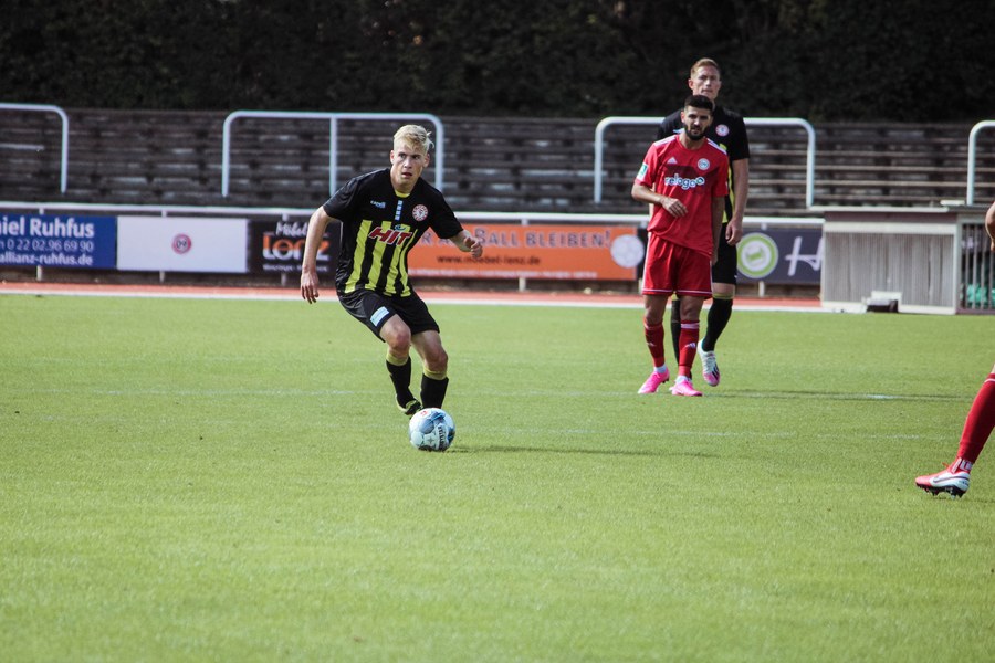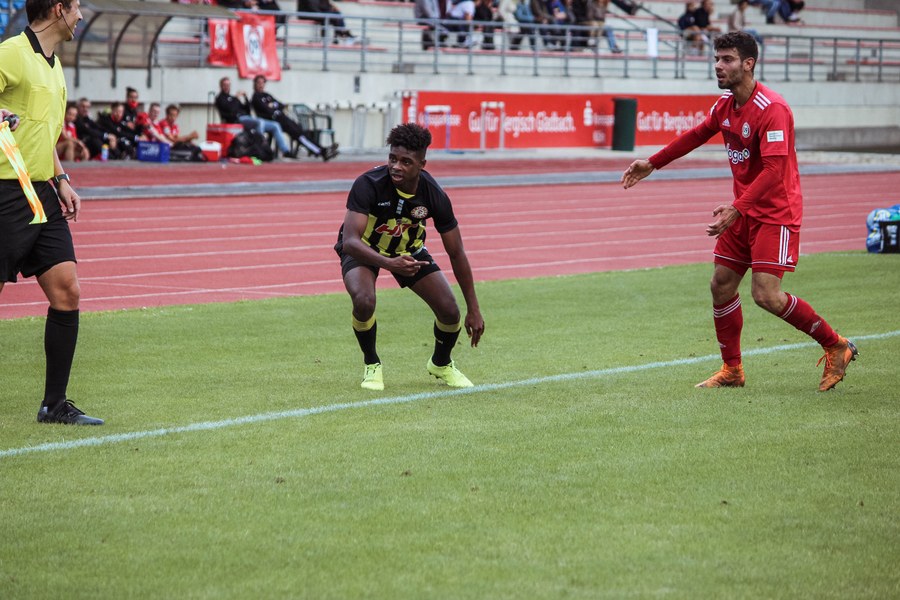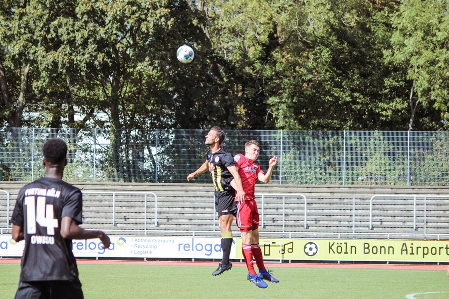 Gleich mit dem Anstoß versuchte Fortuna, den ersten Akzent zu setzen. Ochojski startete über rechts und holte gleich die erste Ecke raus (1.), die allerdings noch nicht gefährlich wurde. Anders sah das in der 23. Spielminute aus. Francis Ubabuike, für die Standards zuständig, fand mit seiner Hereingabe Franko Uzelac, der den Ball nur Zentimeter über das Tor köpfte. Aber auch Bergisch Gladbach versteckte sich nicht. Der Gastgeber versuchte nach Ballgewinnen immer wieder, das Spiel schnell zu machen, Fortuna behielt aber die Übersicht und bekam immer einen Fuß dazwischen. In der Offensive wurde es bei den Südstädtern vor allem über Standards gefährlich. Aber auch die bis dahin beste Chance der Gastgeber zeigte sich nach einem ruhenden Ball. Koruk köpfte eine Ecke nur knapp über den Kasten von Kevin Rauhut. Bergisch Gladbach bliebt griffig in den Zweikämpfen und die Fortuna hatte Probleme, die Bälle klar in die Spitze zu bekommen. Der nächste Versuch der Südstädter stand daher erst in der 40. Spielminute auf dem Zettel. Julian Günther-Schmidt brachte den Ball von rechts vor das Tor, wo Roman Prokoph den Fuß reinhielt. Der Schuss landete aus kurzer Distanz jedoch in den Armen des Torhüters. Kurz vor der Pause zappelt der Ball dann doch im Tor der Gastgeber. Doch schnell machte sich Ernüchterung breit. Nach einer Ecke prallte der Ball vom Pfosten zu Julian Günther-Schmidt, der den Ball mit dem Kopf über die Linie drückte (43.). Doch gleich hob der Linienrichter die Fahne – Abseits. So ging es ohne Tore in die Pause.