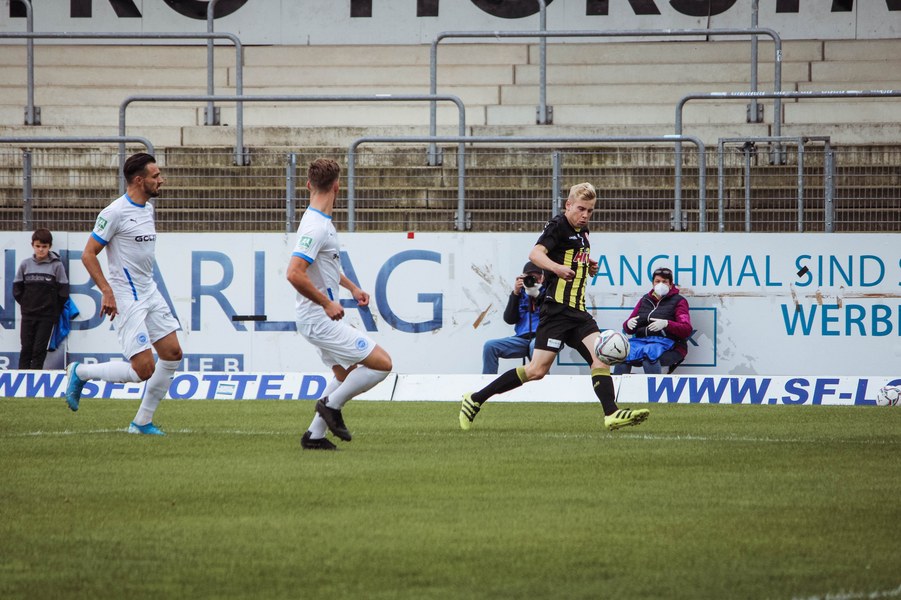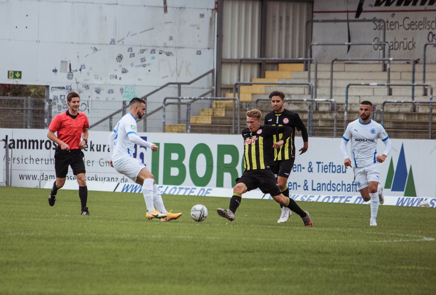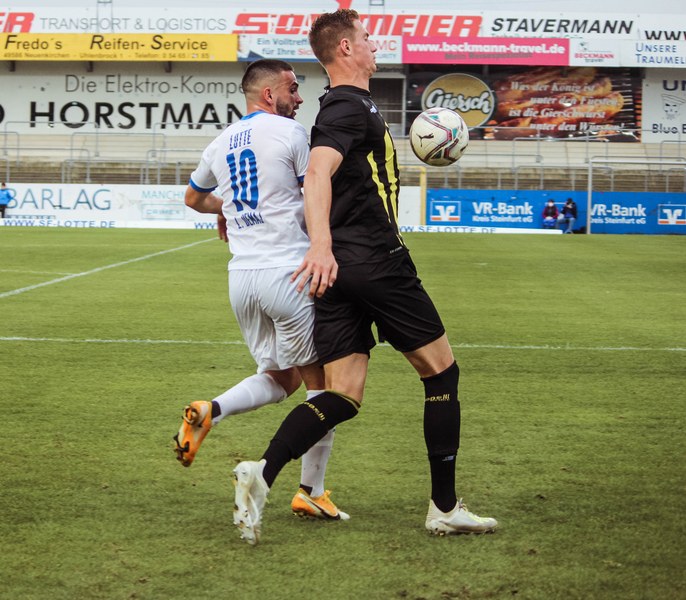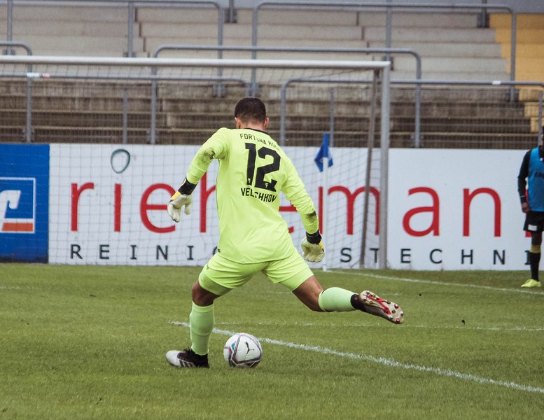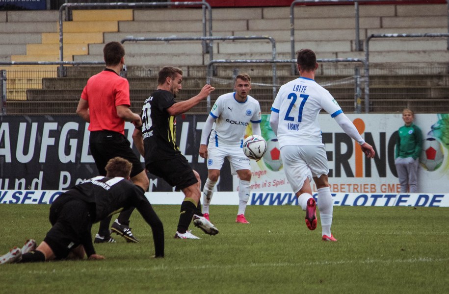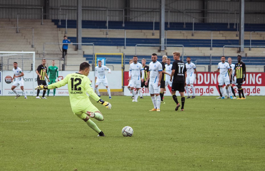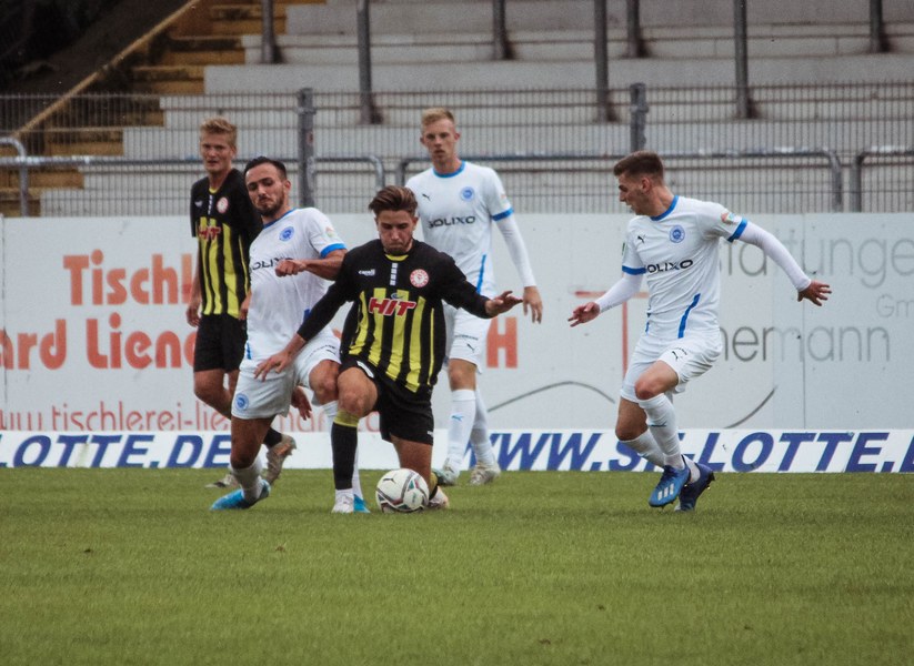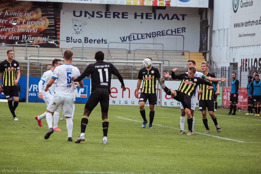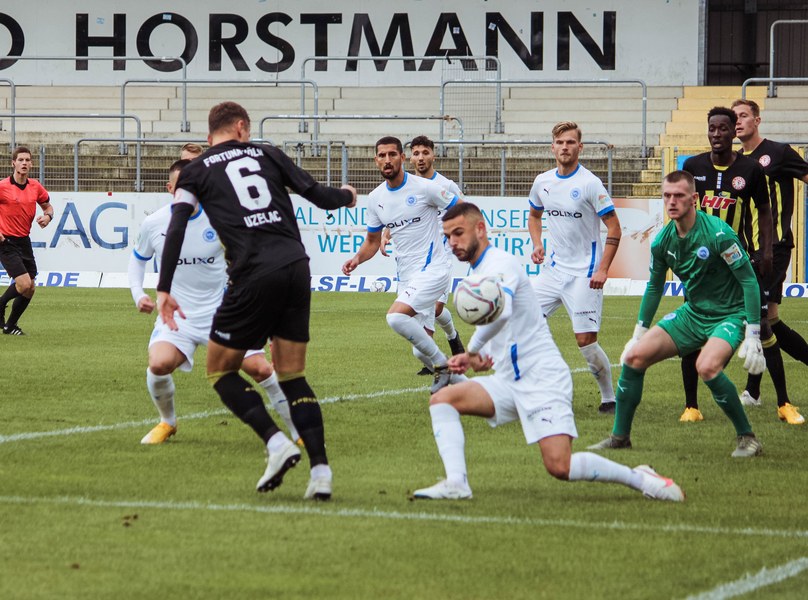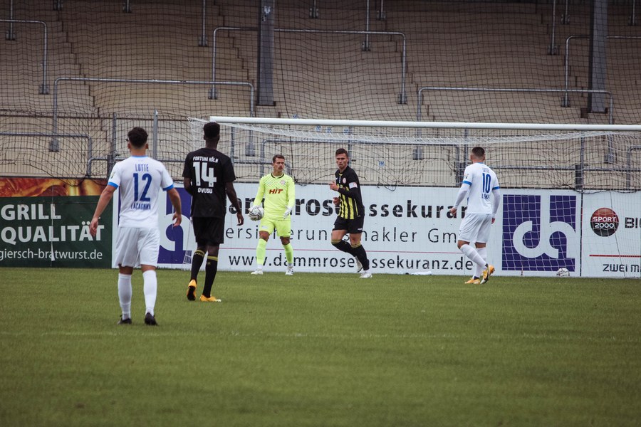 Gleich von Beginn an machte die Fortuna Druck und holte nach einer gespielten Minute die erste Ecke der Partie raus. Die Hereingabe landete auf dem Fuß von Franko Uzelac, der den Ball aber nicht auf das Tor bringen konnte. Drei Minuten später landete der Ball, diesmal durch einen langen Einwurf, erneut bei Uzelac. Erneut versuchte der Kapitän den Ball Richtung Lotter Gehäuse zu bringen, ehe die gesamte Fortuna-Mannschaft „Hand“ schrie. Der Schiedsrichter ließ das Spiel aber weiterlaufen (4.). Die nächste gute Chance der Fortuna ging auf das Konto von Mike Owusu, der setzte jedoch den Ball über das Tor (18.). Dann wurde es hektisch im Stadion am Lotter Kreuz: Die Gastgeber schlugen einen langen Ball. Kevin Rauhut eilte aus seinem Kasten, kam aber etwas zu spät und erwischte seinen Gegenspieler kurz vor dem Seitenaus. Der Schiedsrichter pfiff und zog die glatt rote Karte. Nachdem auch Prokoph für Ersatzkeeper Velichkov das Feld verlassen hatte, ging es für die Fortuna mit zehn Mann weiter. Kurz danach wurde es direkt brenzlich vor dem Tor des neuen Mannes. Ein Freistoß von der Strafraumkante landete erst in der Mauer und schließlich im Nachschuss in den Armen von Velichkov (27.). Auf der anderen Seite versuchte Brandenburger einen Doppelpass auf Hölscher durchzustecken. Nach einem Missverständnis trudelte der Ball jedoch Richtung Keeper (29.). Lotte versuchte immer wieder über die Außen Akzente zu setzen und den Ball von der Grundlinie in die Gefahrenzone zurück zu spielen. So auch in der 33 Spielminute, jedoch war Velichkov am ersten Pfosten zur Stelle. Fortuna machte sich oft selbst das Leben schwer und dachte in einigen Momenten zu kompliziert. So ging es ohne Tore in die Pause.