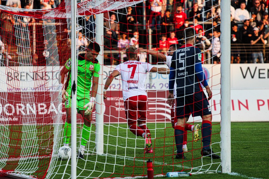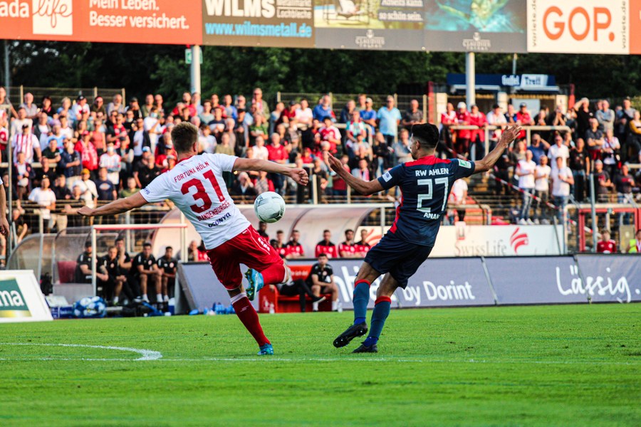 Bereits in der ersten Minute kam Owusu gefährlich vor das Tor der Gäste, sein Schuss ging jedoch deutlich drüber. Anschließend hatten die Gäste etwas mehr Ballbesitz, kamen aber nicht gefährlich vor das Tor von Schlussmann André Weis. Die Ahlener wurden lautstark von den mitgereisten Fans nach vorne gepeitscht und der Fortuna gelangen kaum Befreiungsschläge. In der siebten Spielminute gab es dann die erste Ecke des Spiels für die Südstädter, die Ahlener konnten die Schussversuche jedoch klären. Kurze Zeit später eroberte Najar auf der rechten Seite den Ball, lief schnell aufs Tor der Gäste zu und passte im richtigen Moment auf den mitgelaufenen Marquet, der nur noch zur 1:0 Führung (9.) einschieben musste. Die Fortuna war nach dem Treffer besser im Spiel und bemüht zu erhöhen, Rot Weiss Ahlen ließ allerdings keine Chance zu und versuchte das Spiel zu kontrollieren. In der 18. Spielminute klärte ein Fortune dann den Ball direkt vor die Füße eines Ahleners. Die Ahlener machten dann das Spiel schnell und Holldack überwand Weis zum 1:1 Ausgleich. Im weiteren Verlauf der Halbzeit waren die Südstädter die bessere Mannschaft und erspielten sich einige Chancen, die Ahlen allesamt klären konnte. Fortuna ließ sich davon nicht beirren und baute das Spiel in Ruhe auf, doch es ergaben sich aufgrund der starken Defensive der Gäste kaum Lücken. Vor der Halbzeit hatten die Ahlener noch eine sehr gute Chance durch Wiesweg, die André Weis stark parierte. Anschließend waren die Gäste wieder besser im Spiel und das Spiel um einiges ausgeglichener. Die Mannschaften gingen mit einem 1:1 in die Kabine.
