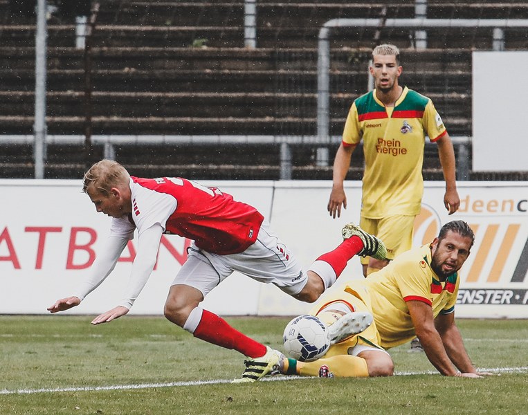 Früh kam die Fortuna bereits zu ihrer ersten Chance. In der 2. Minute war es Hamza Salman, der nach einem Zuspiel von Mike Owusu den gegnerischen Keeper prüfte. Die Fortuna konnte sich in den ersten Minuten gut in der Hälfte der Kölner festsetzen und sich mehrere kleinere Chancen herausspielen, welche allerdings nicht zum Torerfolg führten. Der 1.FC Köln kam in den Anfangsminuten nur mit wenigen Chancen vor das Tor von Kevin Rauhut. Nach einer Ecke von Hamza Salman verfehlte Jannik Löhden das Tor mit einem Kopfball nur knapp (8.). Nach 10 Minuten gab es dann die erste Torannäherung für den 1. FC Köln, aber Rauhut war hell wach und konnte die Chance vereiteln. Hamza Salman spielte in der 13. Minute eine Ecke mit Francis Ubabuike kurz aus und flankte dann gefährlich vor das Tor, der Schiedsrichter pfiff allerdings Foul an Julian Krahl. In den Folgeminuten, kamen die Gäste aus Köln-Müngersdorf dann zu einigen gefährlichen Situationen. So klärte Timo Hölscher nach einem Fehlpass von Jannik Löhden eine Chance des 1.FC Köln im Strafraum, (15.). Kurz darauf kam Christian Clemens von der 16er Kante frei zum Schuss, doch Kevin Rauhut machte die Torwartecke zu und klärte zum Eckball. Die anschließende Ecke brachten die Kölner in den Strafraum, aber der Kopfball landetet zum Glück für Fortuna nur auf dem Tornetz (17.). In der 19. Minute köpft Salman nach einem Einwurf von Dan-Patrick Poggenberg auf das Tor der Kölner, aber Krahl hält den Ball sicher. Kurz darauf kam es zu einer brenzligen Situation vor dem Tor der Fortuna, welche mit einem Freistoß für den 1.FC Köln endete, der allerdings deutlich über dem Tor landete (20.). In der 26. Minute gab es dann die Doppelchance für die Jungs aus der Südstadt. Salman spielt eine kurze Ecke mit Ubabuike aus, welcher den vor dem Tor wartenden Julian Günter-Schmidt sah. Dieser traf allerdings nur den linken Pfosten. Der Ball blieb aber weiterhin gefährlich und fand den Weg in den 5er zu Francis Ubabuike, welcher allerdings in die Arme des Kölner Keepers köpfte. In der 28. Minute setzte sich Owusu stark durch und legte auf Höhe der Strafraumlinie für Ochojski ab, welcher allerdings am linken Pfosten vorbei zog. Nach 30 Minuten gab es einen Freistoß auf Höhe der Mittelinie für die Fortuna, der zunächst gefährlich für das Tor der Geißböcke zu werden schien, dann jedoch in einem Konter für den 1. FC Köln endete, welchen Kevin Rauhut aber parieren konnte. In der 34. Minute spielten die Gäste einen langen Ball auf Henning in den Strafraum, welcher den Ball per Kopf auf Hwang ablegte. Christian Clemens erhielt außen den Ball, hatte das Auge für Lucas Musculus, der aber deutlich über das Tor der Fortuna schoss. Kurz vor der Pause kam die Fortuna wieder besser in das Spiel und erzwang sich einige gute Chancen. So hatten die Gäste in der 40. Minute Glück, als Günther-Schmidt aus kürzester Distanz den Kölner Keeper traf und ein weiteres Mal in der 43. Minute, als Owusu an Krahl scheiterte. Die Fortuna ging mit einem leichten Chancenplus und den deutlich zwingenderen Chancen in die Halbzeitpause. Tore wollten allerdings noch nicht fallen.