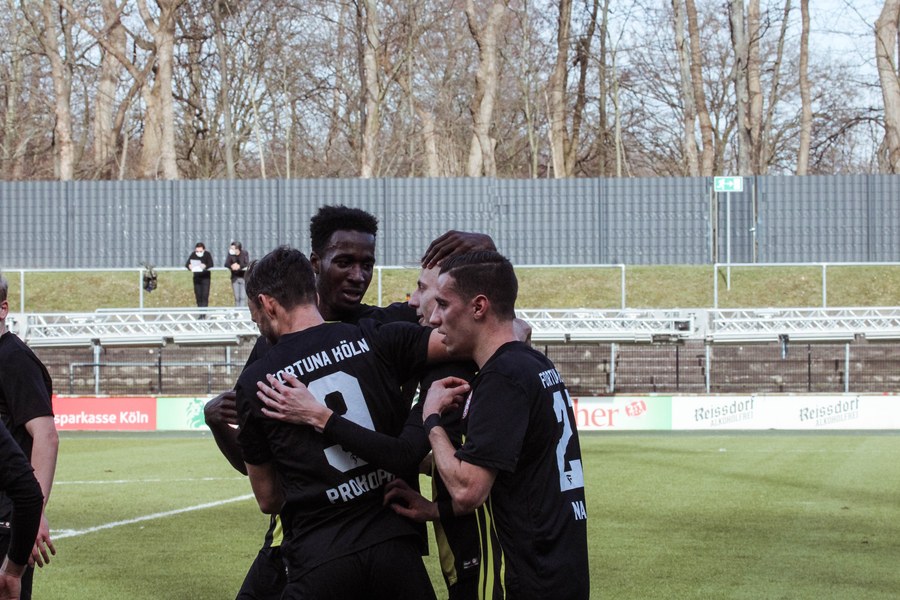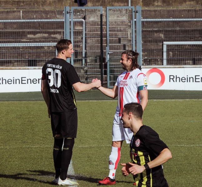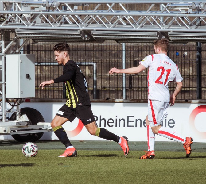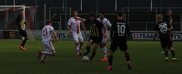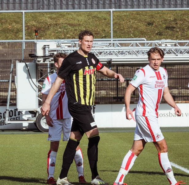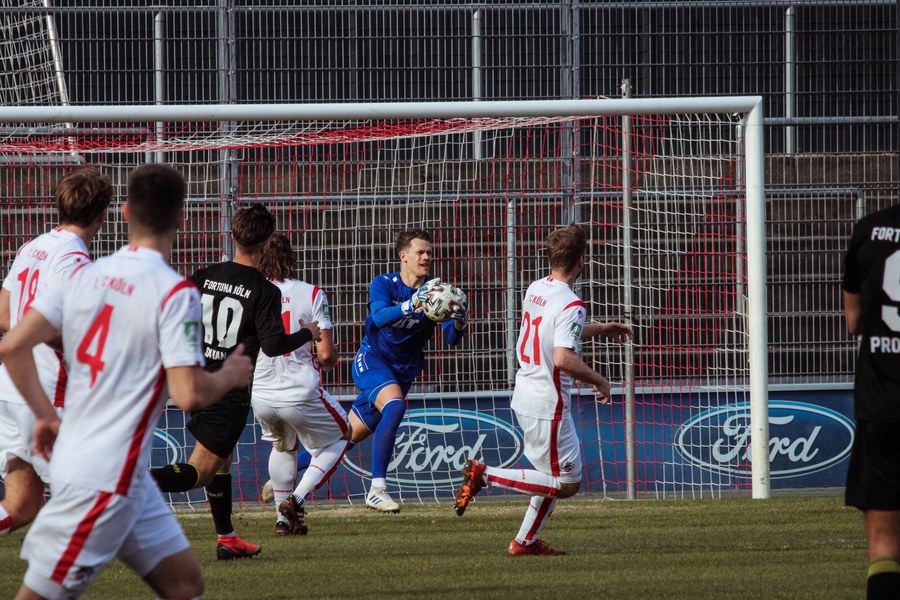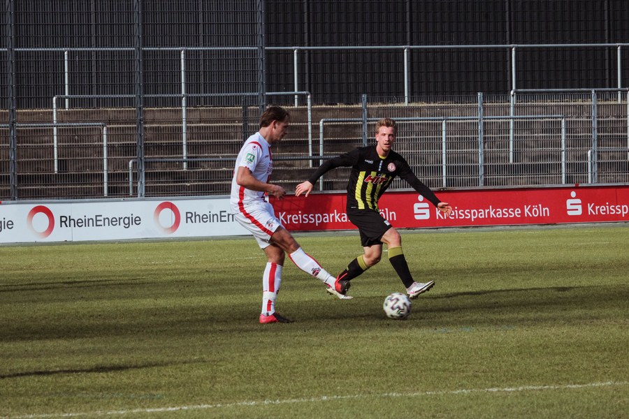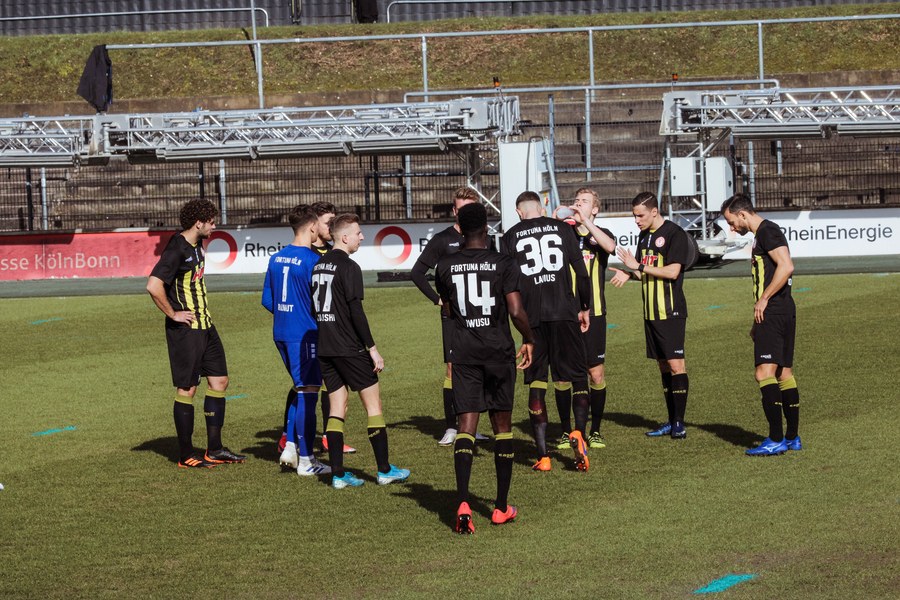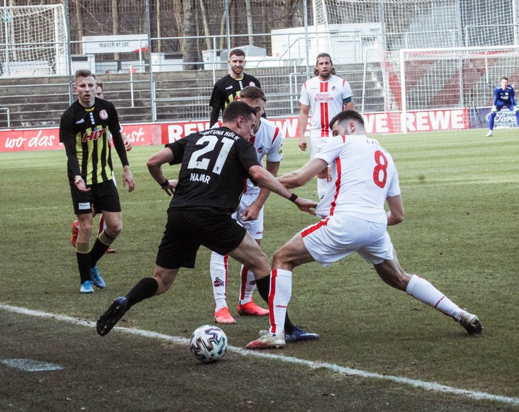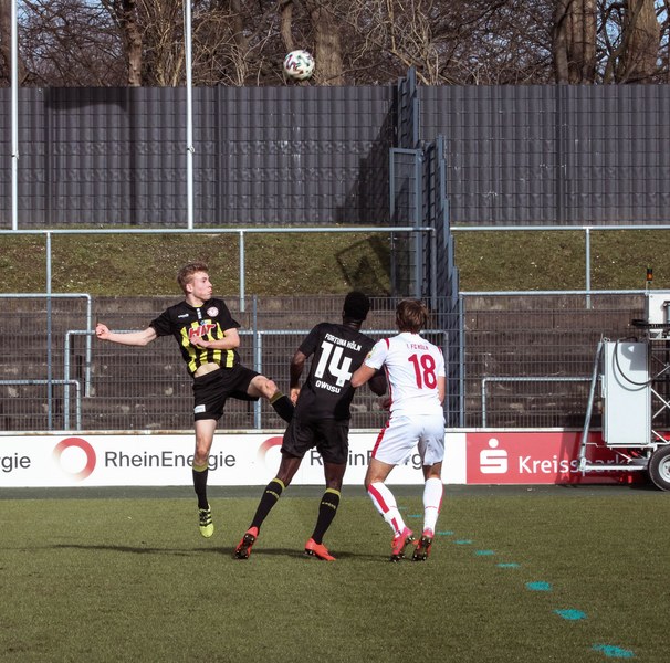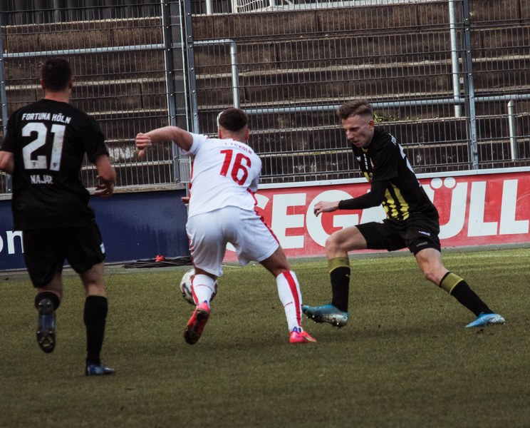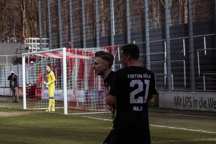 Bei bestem Fußballwetter gastierte die Fortuna beim Kölner Stadtrivalen. Trainer Alexander Ende schickte dieselbe Aufstellung wie vor mittlerweile vier Wochen gegen den SV Straelen ins Rennen. Auf der Bank nahm nach einiger Zeit auch wieder Kai Försterling Platz. Das frühe Pressing der Fortuna war schon in den Anfangsminuten klar zu erkennen. Beide Mannschaften nahmen direkt jeden Zweikampf an, sodass es zu Beginn zu vielen Freistoßunterbrechungen kam. Die ausgeführten Freistöße führten jedoch zu keinen zwingenden Chancen für die Fortuna. In der 13. Minute schlug der Ball das erste Mal hinter Torwart Rauhut ein. Der FC kombiniert sich bis vor das Tor der Fortuna, wo Hwang dann zum Abschluss kam und das Tor traf. Während des Anspiels stand der Stürmer aber deutlich im Abseits, weshalb Schiedsrichter Patrick Holz die Situation sofort zurückpfiff. Das von beiden Seiten kampfbetonte Spiel brachte in der 17. Minute die erste gelbe Karte ein. Jan-Luca Rumpf wurde bereits am Anfang des Spiels nach einem Foulspiel vom Schiedsrichter verwarnt, sodass er nach seinem nächsten Vergehen früh die erste Karte sah. Im Mittelfeld spielte Brandenburger einen Ball in die gegnerische Hälfte auf Salman. Der Offensivmann wurde von seinen Gegenspielern mit unfairen Mitteln vom Ball getrennt, sodass Schiedsrichter Holz zurecht auf Freistoß entschied. Fortunas Rechtsverteidiger Nico Ochojski legte sich ca. 20 Meter vor dem Tor den Ball zurecht, um anschließend den Freistoß ausführen. Mit viel Gefühl setzte er den Freistoß ins untere rechte Eck des gegnerischen Tores (24. Min.) und erzielte die 1:0 Führung. Ein paar Minuten später brachten die Gegner des FC wieder einen Fortuna Spieler in deren Spielfeldhälfte zu Fall, diesmal war es Suheyel Najar. Knapp 20 Meter vor dem Tor des Gegners pfiff Holz erneut auf Freistoß. Nun schnappte sich Najar den Ball, um anzutreten. Aus zentraler und aussichtsreicher Lage blieb er allerdings in der Mauer hängen (32. Min.). Kurz danach fand die präzise Flanke von Linksverteidiger Rumpf einen Abnehmer im gegnerischen Fünfer. Owusu kam vor Keeper Krahl frei zum Kopfball (41. Min.), bekam aber nicht genügend Druck hinter den Ball, sodass der Krahl den Ball problemlos festhalten konnte. Kurz vor dem Halbzeitpfiff steckt Najar einen genialen Pass durch auf Owusu in den Strafraum. Der Flügelspieler bringt den Ball von der Torauslinie nochmals sehr gefährlich in die Mitte. Der FC Torwart bekommt seine Hände zwar noch an den Ball, kann ihn aber nicht mehr entscheidend abwehren. Prokoph ging aber Nummer sicher und drückte den Ball über die Linie (45. Min.) zur zwischenzeitlichen 2:0 Führung für die Fortuna.