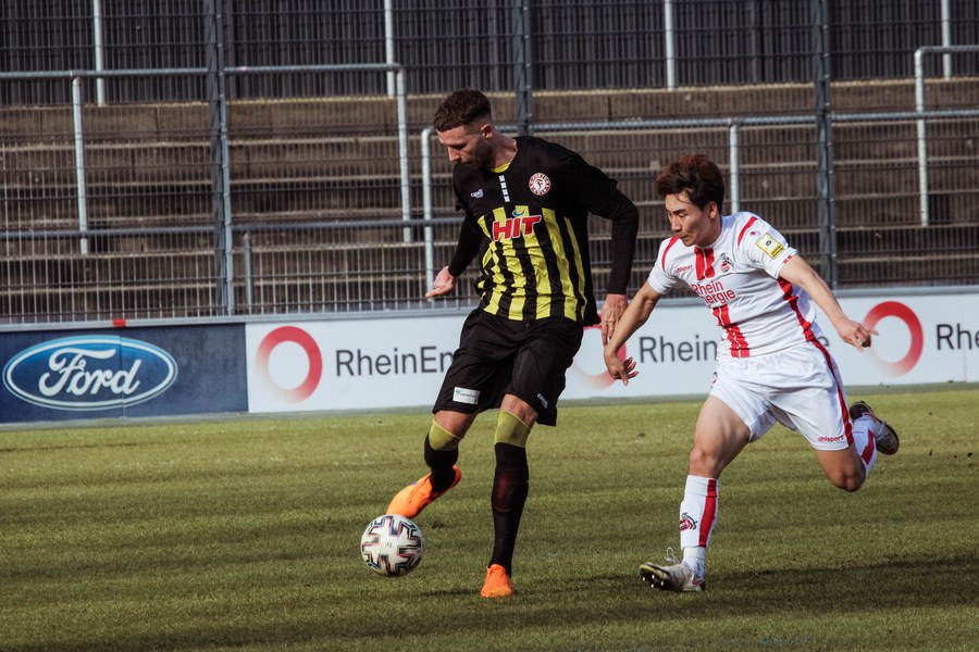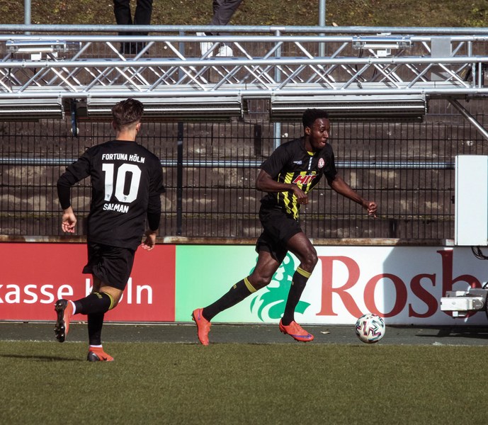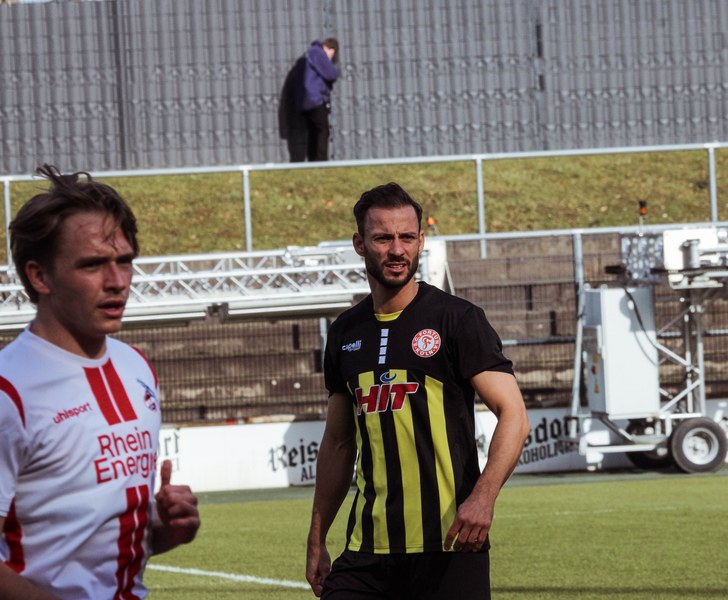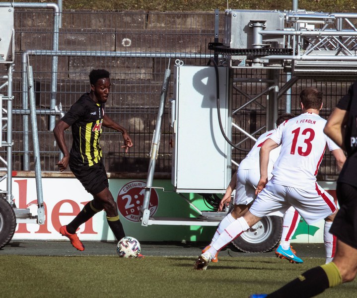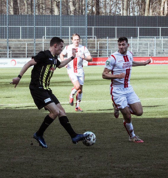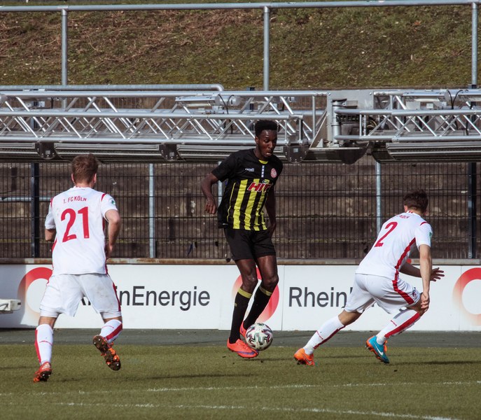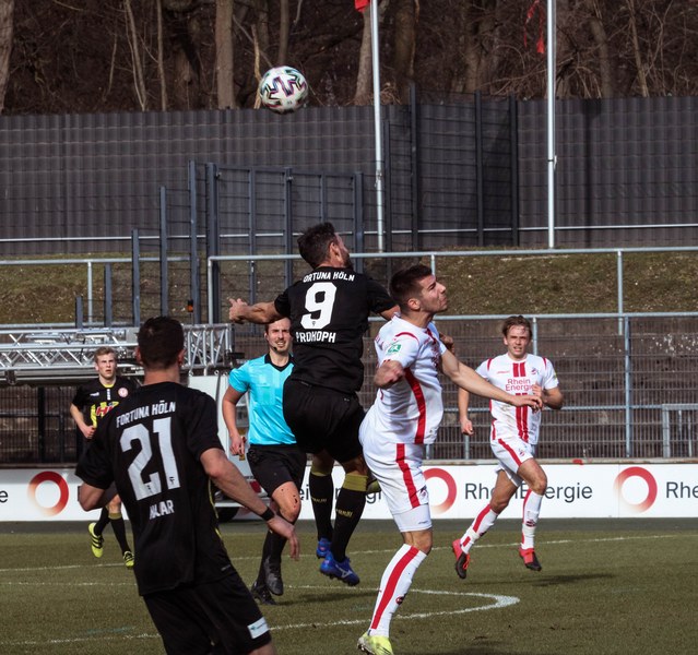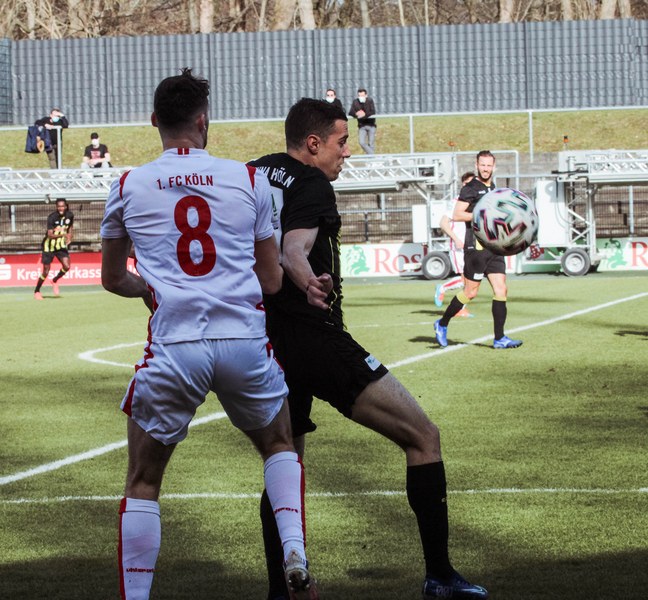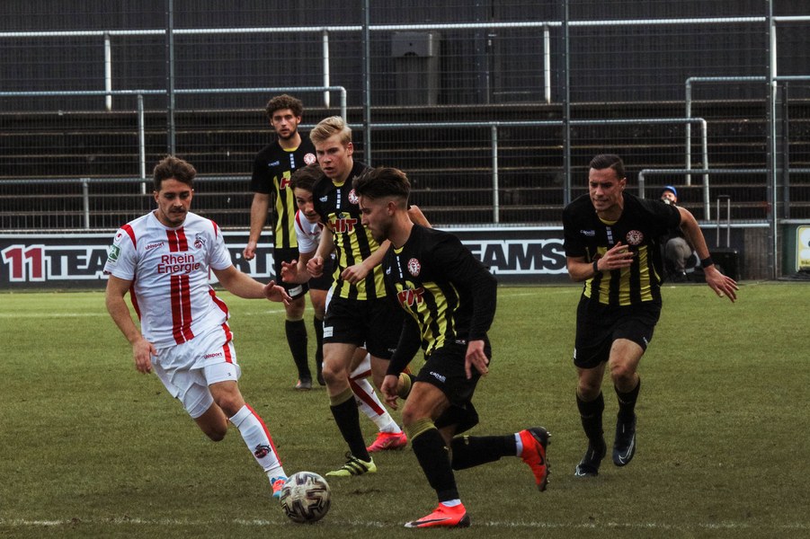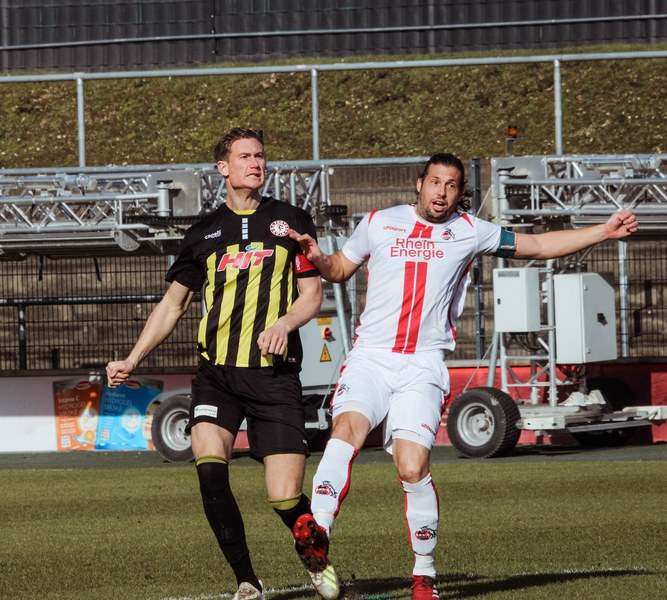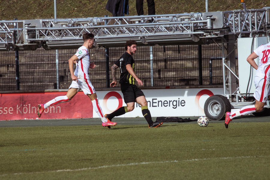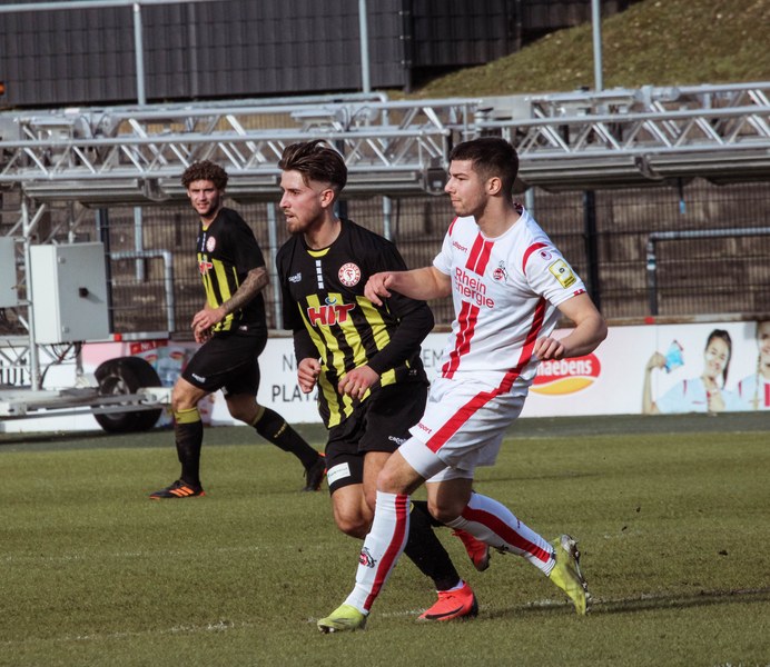 Bei bestem Fußballwetter gastierte die Fortuna beim Kölner Stadtrivalen. Trainer Alexander Ende schickte dieselbe Aufstellung wie vor mittlerweile vier Wochen gegen den SV Straelen ins Rennen. Auf der Bank nahm nach einiger Zeit auch wieder Kai Försterling Platz. Das frühe Pressing der Fortuna war schon in den Anfangsminuten klar zu erkennen. Beide Mannschaften nahmen direkt jeden Zweikampf an, sodass es zu Beginn zu vielen Freistoßunterbrechungen kam. Die ausgeführten Freistöße führten jedoch zu keinen zwingenden Chancen für die Fortuna. In der 13. Minute schlug der Ball das erste Mal hinter Torwart Rauhut ein. Der FC kombiniert sich bis vor das Tor der Fortuna, wo Hwang dann zum Abschluss kam und das Tor traf. Während des Anspiels stand der Stürmer aber deutlich im Abseits, weshalb Schiedsrichter Patrick Holz die Situation sofort zurückpfiff. Das von beiden Seiten kampfbetonte Spiel brachte in der 17. Minute die erste gelbe Karte ein. Jan-Luca Rumpf wurde bereits am Anfang des Spiels nach einem Foulspiel vom Schiedsrichter verwarnt, sodass er nach seinem nächsten Vergehen früh die erste Karte sah. Im Mittelfeld spielte Brandenburger einen Ball in die gegnerische Hälfte auf Salman. Der Offensivmann wurde von seinen Gegenspielern mit unfairen Mitteln vom Ball getrennt, sodass Schiedsrichter Holz zurecht auf Freistoß entschied. Fortunas Rechtsverteidiger Nico Ochojski legte sich ca. 20 Meter vor dem Tor den Ball zurecht, um anschließend den Freistoß ausführen. Mit viel Gefühl setzte er den Freistoß ins untere rechte Eck des gegnerischen Tores (24. Min.) und erzielte die 1:0 Führung. Ein paar Minuten später brachten die Gegner des FC wieder einen Fortuna Spieler in deren Spielfeldhälfte zu Fall, diesmal war es Suheyel Najar. Knapp 20 Meter vor dem Tor des Gegners pfiff Holz erneut auf Freistoß. Nun schnappte sich Najar den Ball, um anzutreten. Aus zentraler und aussichtsreicher Lage blieb er allerdings in der Mauer hängen (32. Min.). Kurz danach fand die präzise Flanke von Linksverteidiger Rumpf einen Abnehmer im gegnerischen Fünfer. Owusu kam vor Keeper Krahl frei zum Kopfball (41. Min.), bekam aber nicht genügend Druck hinter den Ball, sodass der Krahl den Ball problemlos festhalten konnte. Kurz vor dem Halbzeitpfiff steckt Najar einen genialen Pass durch auf Owusu in den Strafraum. Der Flügelspieler bringt den Ball von der Torauslinie nochmals sehr gefährlich in die Mitte. Der FC Torwart bekommt seine Hände zwar noch an den Ball, kann ihn aber nicht mehr entscheidend abwehren. Prokoph ging aber Nummer sicher und drückte den Ball über die Linie (45. Min.) zur zwischenzeitlichen 2:0 Führung für die Fortuna.