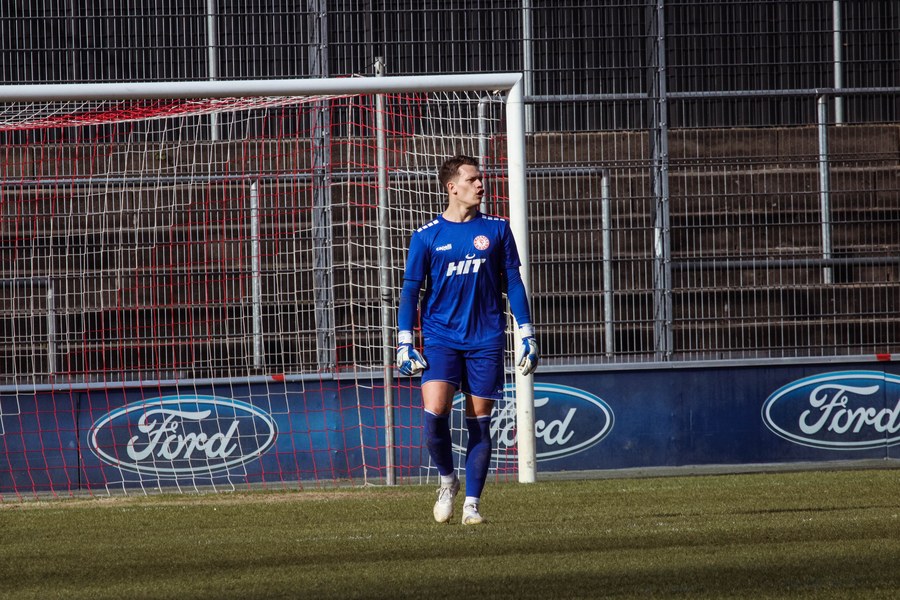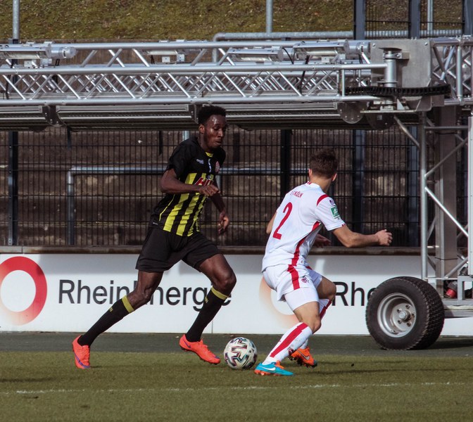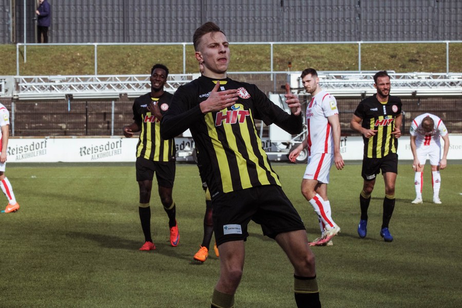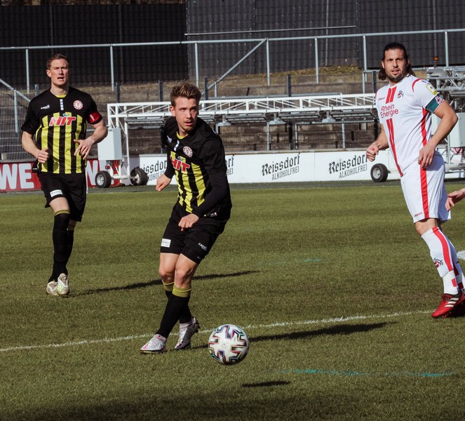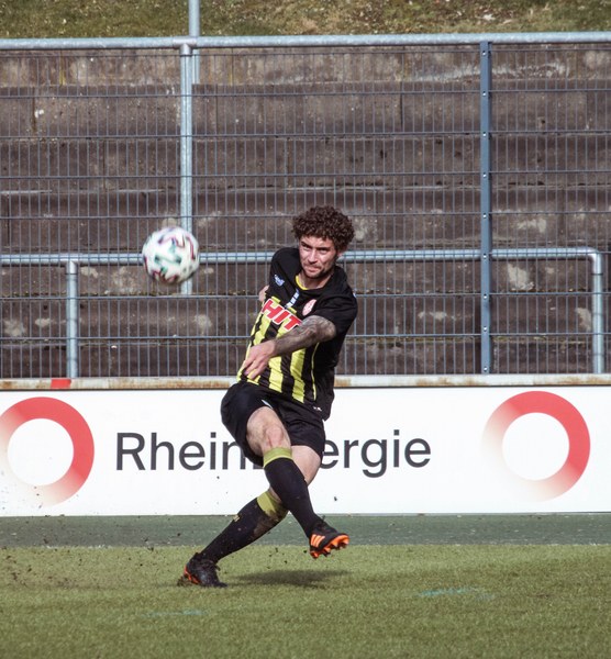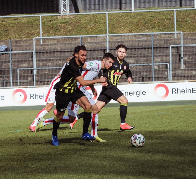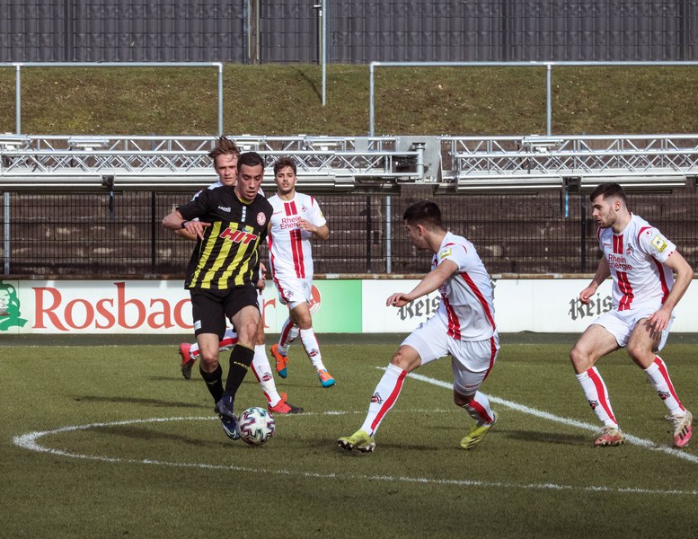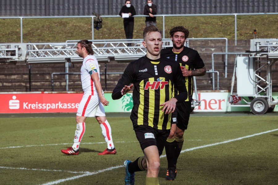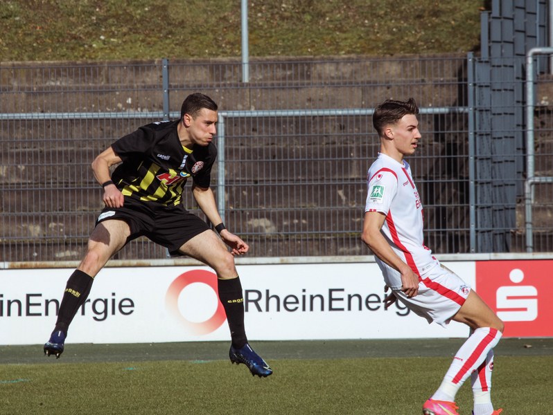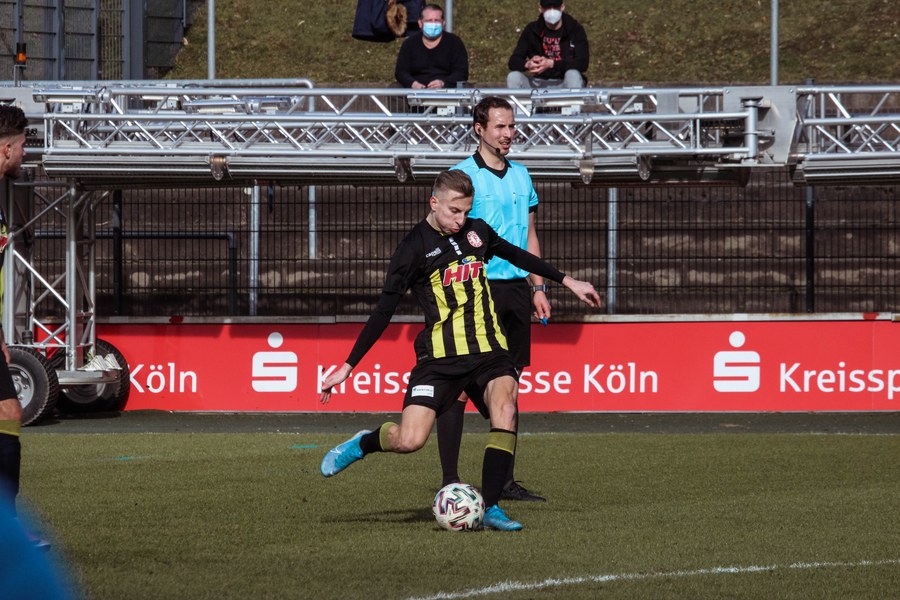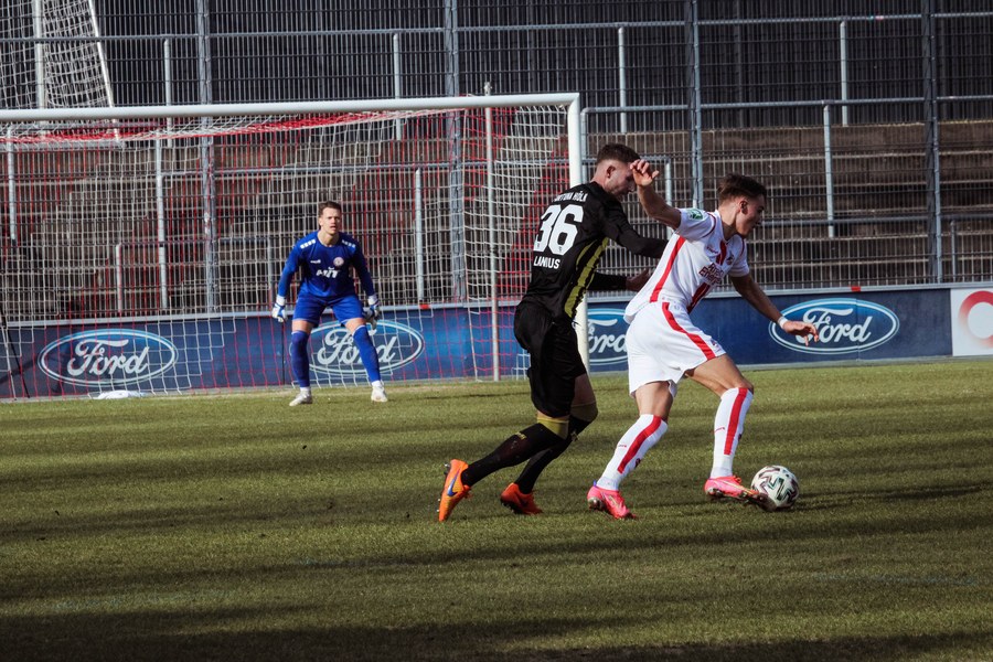 Bei bestem Fußballwetter gastierte die Fortuna beim Kölner Stadtrivalen. Trainer Alexander Ende schickte dieselbe Aufstellung wie vor mittlerweile vier Wochen gegen den SV Straelen ins Rennen. Auf der Bank nahm nach einiger Zeit auch wieder Kai Försterling Platz. Das frühe Pressing der Fortuna war schon in den Anfangsminuten klar zu erkennen. Beide Mannschaften nahmen direkt jeden Zweikampf an, sodass es zu Beginn zu vielen Freistoßunterbrechungen kam. Die ausgeführten Freistöße führten jedoch zu keinen zwingenden Chancen für die Fortuna. In der 13. Minute schlug der Ball das erste Mal hinter Torwart Rauhut ein. Der FC kombiniert sich bis vor das Tor der Fortuna, wo Hwang dann zum Abschluss kam und das Tor traf. Während des Anspiels stand der Stürmer aber deutlich im Abseits, weshalb Schiedsrichter Patrick Holz die Situation sofort zurückpfiff. Das von beiden Seiten kampfbetonte Spiel brachte in der 17. Minute die erste gelbe Karte ein. Jan-Luca Rumpf wurde bereits am Anfang des Spiels nach einem Foulspiel vom Schiedsrichter verwarnt, sodass er nach seinem nächsten Vergehen früh die erste Karte sah. Im Mittelfeld spielte Brandenburger einen Ball in die gegnerische Hälfte auf Salman. Der Offensivmann wurde von seinen Gegenspielern mit unfairen Mitteln vom Ball getrennt, sodass Schiedsrichter Holz zurecht auf Freistoß entschied. Fortunas Rechtsverteidiger Nico Ochojski legte sich ca. 20 Meter vor dem Tor den Ball zurecht, um anschließend den Freistoß ausführen. Mit viel Gefühl setzte er den Freistoß ins untere rechte Eck des gegnerischen Tores (24. Min.) und erzielte die 1:0 Führung. Ein paar Minuten später brachten die Gegner des FC wieder einen Fortuna Spieler in deren Spielfeldhälfte zu Fall, diesmal war es Suheyel Najar. Knapp 20 Meter vor dem Tor des Gegners pfiff Holz erneut auf Freistoß. Nun schnappte sich Najar den Ball, um anzutreten. Aus zentraler und aussichtsreicher Lage blieb er allerdings in der Mauer hängen (32. Min.). Kurz danach fand die präzise Flanke von Linksverteidiger Rumpf einen Abnehmer im gegnerischen Fünfer. Owusu kam vor Keeper Krahl frei zum Kopfball (41. Min.), bekam aber nicht genügend Druck hinter den Ball, sodass der Krahl den Ball problemlos festhalten konnte. Kurz vor dem Halbzeitpfiff steckt Najar einen genialen Pass durch auf Owusu in den Strafraum. Der Flügelspieler bringt den Ball von der Torauslinie nochmals sehr gefährlich in die Mitte. Der FC Torwart bekommt seine Hände zwar noch an den Ball, kann ihn aber nicht mehr entscheidend abwehren. Prokoph ging aber Nummer sicher und drückte den Ball über die Linie (45. Min.) zur zwischenzeitlichen 2:0 Führung für die Fortuna.