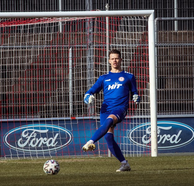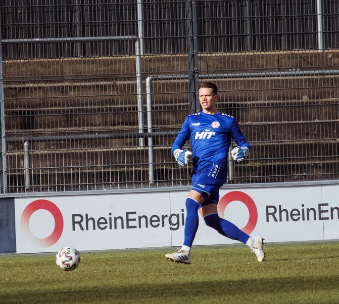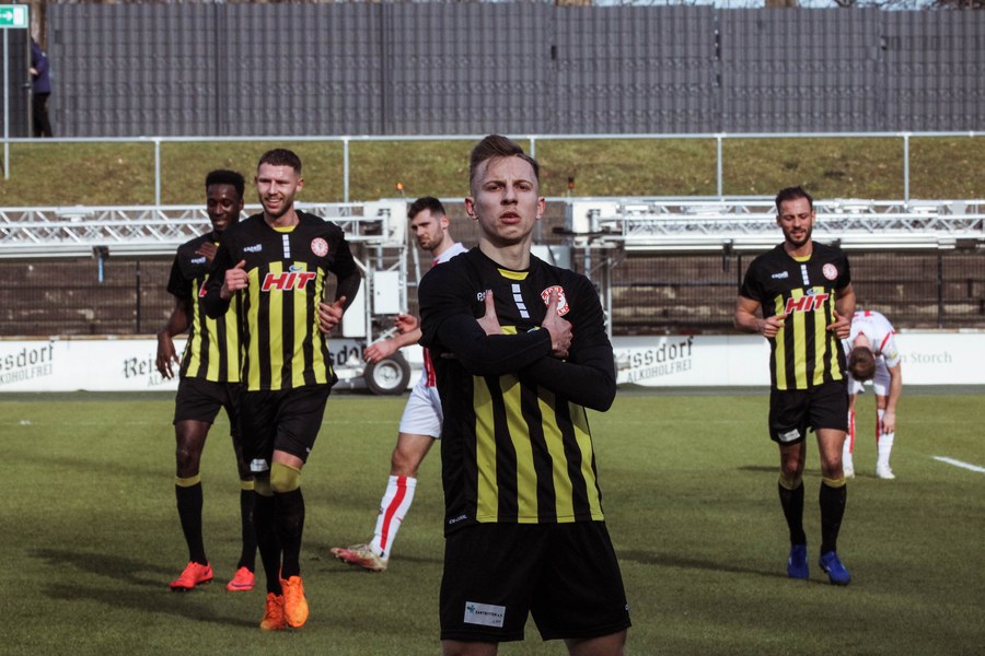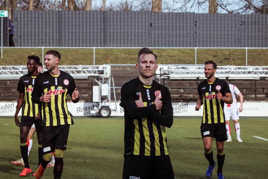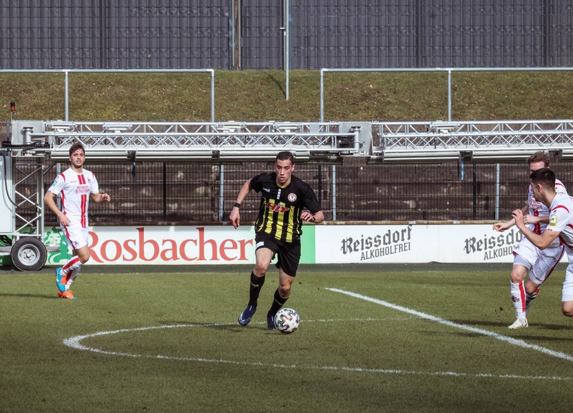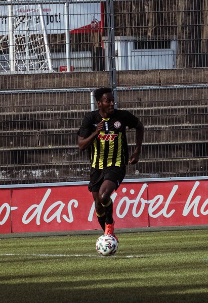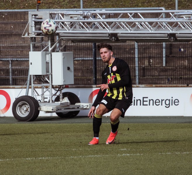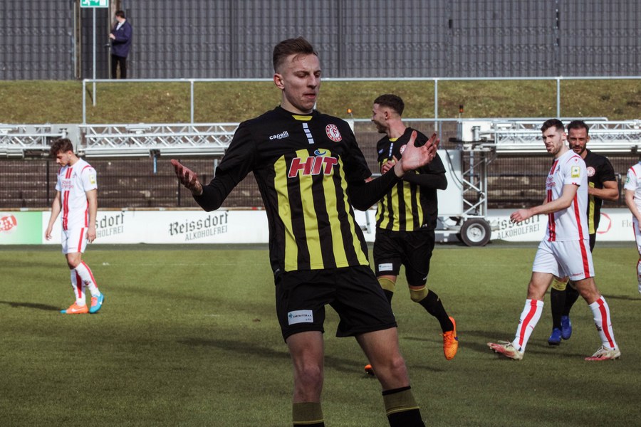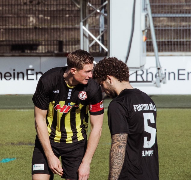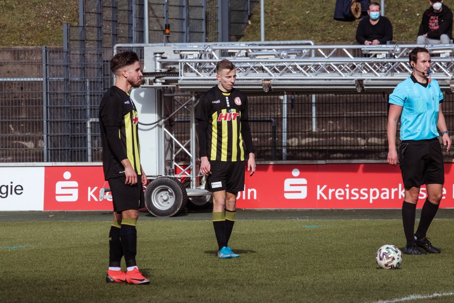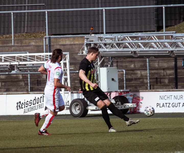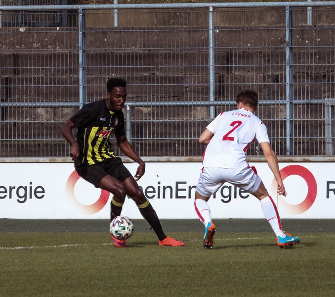 Bei bestem Fußballwetter gastierte die Fortuna beim Kölner Stadtrivalen. Trainer Alexander Ende schickte dieselbe Aufstellung wie vor mittlerweile vier Wochen gegen den SV Straelen ins Rennen. Auf der Bank nahm nach einiger Zeit auch wieder Kai Försterling Platz. Das frühe Pressing der Fortuna war schon in den Anfangsminuten klar zu erkennen. Beide Mannschaften nahmen direkt jeden Zweikampf an, sodass es zu Beginn zu vielen Freistoßunterbrechungen kam. Die ausgeführten Freistöße führten jedoch zu keinen zwingenden Chancen für die Fortuna. In der 13. Minute schlug der Ball das erste Mal hinter Torwart Rauhut ein. Der FC kombiniert sich bis vor das Tor der Fortuna, wo Hwang dann zum Abschluss kam und das Tor traf. Während des Anspiels stand der Stürmer aber deutlich im Abseits, weshalb Schiedsrichter Patrick Holz die Situation sofort zurückpfiff. Das von beiden Seiten kampfbetonte Spiel brachte in der 17. Minute die erste gelbe Karte ein. Jan-Luca Rumpf wurde bereits am Anfang des Spiels nach einem Foulspiel vom Schiedsrichter verwarnt, sodass er nach seinem nächsten Vergehen früh die erste Karte sah. Im Mittelfeld spielte Brandenburger einen Ball in die gegnerische Hälfte auf Salman. Der Offensivmann wurde von seinen Gegenspielern mit unfairen Mitteln vom Ball getrennt, sodass Schiedsrichter Holz zurecht auf Freistoß entschied. Fortunas Rechtsverteidiger Nico Ochojski legte sich ca. 20 Meter vor dem Tor den Ball zurecht, um anschließend den Freistoß ausführen. Mit viel Gefühl setzte er den Freistoß ins untere rechte Eck des gegnerischen Tores (24. Min.) und erzielte die 1:0 Führung. Ein paar Minuten später brachten die Gegner des FC wieder einen Fortuna Spieler in deren Spielfeldhälfte zu Fall, diesmal war es Suheyel Najar. Knapp 20 Meter vor dem Tor des Gegners pfiff Holz erneut auf Freistoß. Nun schnappte sich Najar den Ball, um anzutreten. Aus zentraler und aussichtsreicher Lage blieb er allerdings in der Mauer hängen (32. Min.). Kurz danach fand die präzise Flanke von Linksverteidiger Rumpf einen Abnehmer im gegnerischen Fünfer. Owusu kam vor Keeper Krahl frei zum Kopfball (41. Min.), bekam aber nicht genügend Druck hinter den Ball, sodass der Krahl den Ball problemlos festhalten konnte. Kurz vor dem Halbzeitpfiff steckt Najar einen genialen Pass durch auf Owusu in den Strafraum. Der Flügelspieler bringt den Ball von der Torauslinie nochmals sehr gefährlich in die Mitte. Der FC Torwart bekommt seine Hände zwar noch an den Ball, kann ihn aber nicht mehr entscheidend abwehren. Prokoph ging aber Nummer sicher und drückte den Ball über die Linie (45. Min.) zur zwischenzeitlichen 2:0 Führung für die Fortuna.