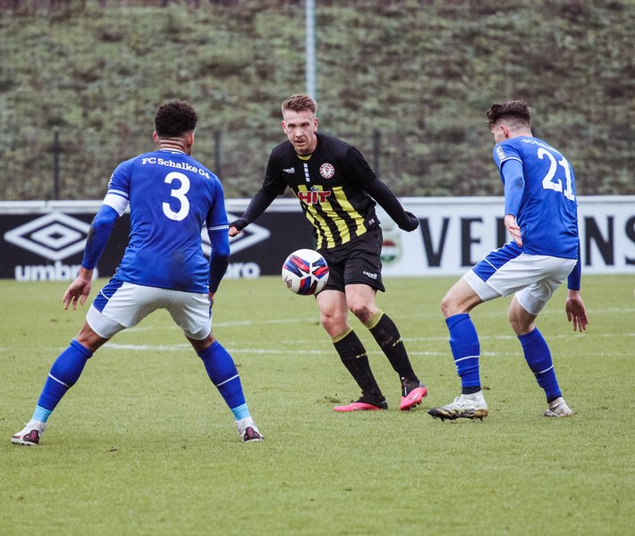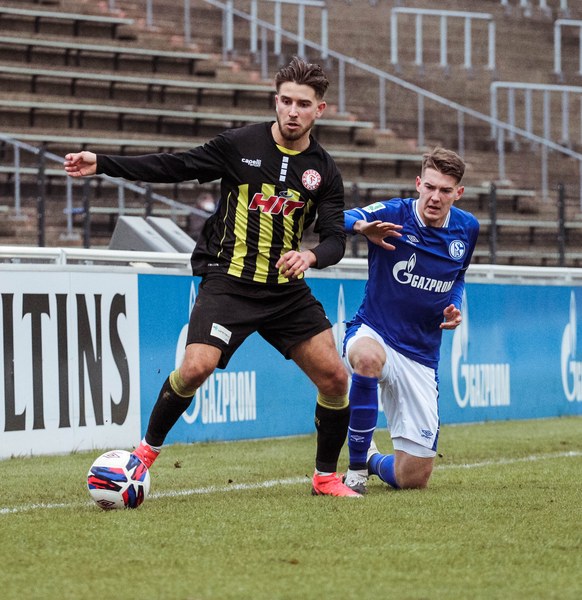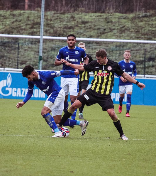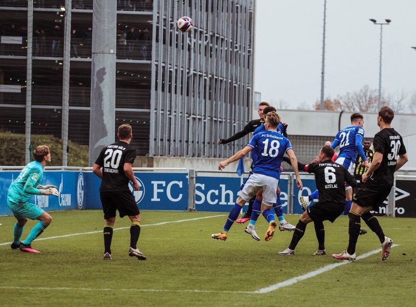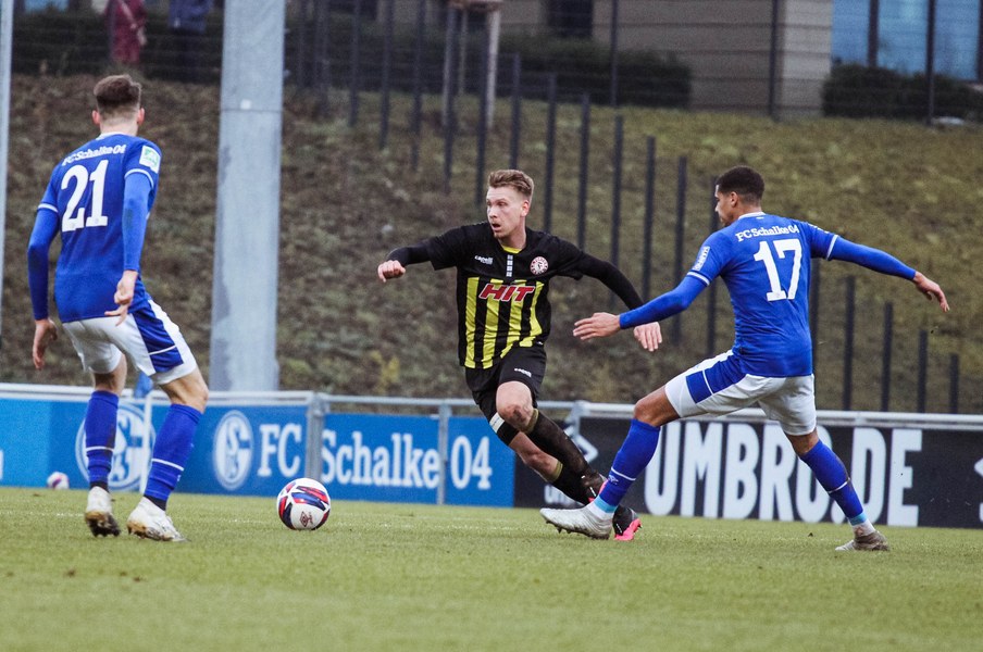 Nach anfänglichem Abtasten kam die Fortuna in der 5. Minute zur ersten Torannäherung. Timo Hölscher verlagerte das Spiel in die Mitte auf Hamza Salman. Der nahm mit einem schnellen Ball Francis Ubabuike mit. Fortunas Nummer 11 suchte aus gut 18 Metern den Abschluss, setzte den Ball aber über den Kasten. Auf der anderen Seite wurde es noch knapper. Weschenfelder-Scienza lief im spitzen Winkel alleine auf Rauhut zu. Fortunas Schlussmann bekam im letzten Moment noch den Fuß dazwischen und lenkte den Ball damit Zentimeter am langen Pfosten vorbei (8.). Die anschließende Ecke klärte die Fortuna und setzte gleich zum Konter an. Der in der Spitze von Prokoph verlängerte Ball landete jedoch in den Armen von Theißen, ehe Günther-Schmidt an das Spielgerät kommen konnte (8.). Es dauerte einige Zeit, bis sich das Spielgeschehen aus dem Mittelfeld wieder vor eines der Tore verlagerte – diesmal vor den Kasten von Kevin Rauhut. Jason Ceka tankte sich durch die Hintermannschaft der Südstädter und spielte auf Schuler ab. Der Schalker kam zwar zum Abschluss, stand dabei jedoch im Abseits (18.). Durch ein taktisches Foul kam die Fortuna zu ihrer nächsten Chance. Nachdem Salman gelegt wurde, setzte Ubabuike zum Freistoß an. Der Ball geriet aber zu lang und segelte an Freund und Feind vorbei (24.). Das weitere Spielgeschehen wurde von vielen kleineren Fouls geprägt, die der Schiedsrichterin immer wieder einen Pfiff entlockten. Ein richtiger Spielfluss kam so nur schwer zu Stande. Zudem setzte Schalke den ballführenden Spieler bereits früh unter Druck, sodass auch Fortunas Abwehr beim Spielaufbau immer wieder aufpassen musste. Nach 30 gespielten Minuten setzten dann Ubabuike und Günther-Schmidt Schalkes Timo Becker an der Schalker Eckfahne gemeinsam unter Druck und sicherten sich so den Ball. Die anschließende Flanke von Brandenburger verunglückte aber sichtlich und fand so in der Mitte keinen Abnehmer. Zwei Zeigerumdrehungen später zielte Diamant Berisha aus der Distanz auf den Kasten von Rauhut, verfehlte diesen aber deutlich (32.). Auch die Fortuna zeigte sich wenig erfolgreich, als sich Prokoph durch starken Einsatz den Ball sicherte, mit seinem Abschluss aber nur ein Schalker Abwehrbein traf. Besser machte es der Stürmer in der 38. Minute. Alleine vor dem Keeper umkurvte er diesen und schob den Ball in Richtung des leeren Tores. Dann aber der Pfiff. Abseits. Und, hier muss man ehrlich sein, das auch deutlich. Dann hieß es durchatmen bei der Fortuna. Wenige Sekunden vor dem Halbzeitpfiff tauchten die Knappen mit einer dicken Dreifach-Chance vor Rauhut auf. Nach einem geblockten Schuss, einem Pfostentreffer und einer weiteren Glanztat von Kevin Rauhut wurde der Ball aus der Gefahrenzone befördert und Fortunas Schlussmann hielt die Null zur Pause (45+1).