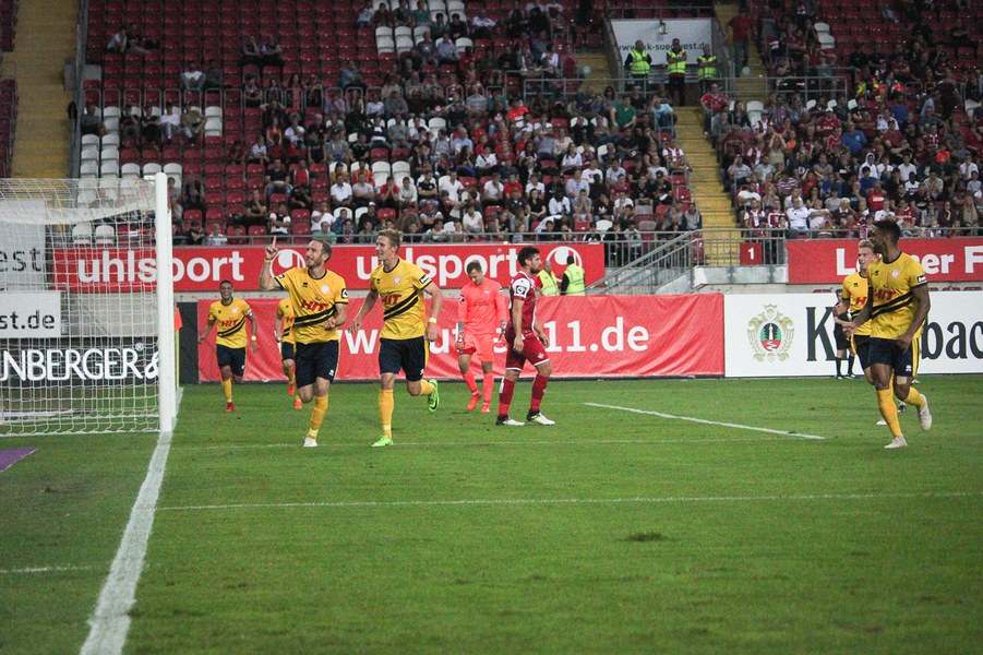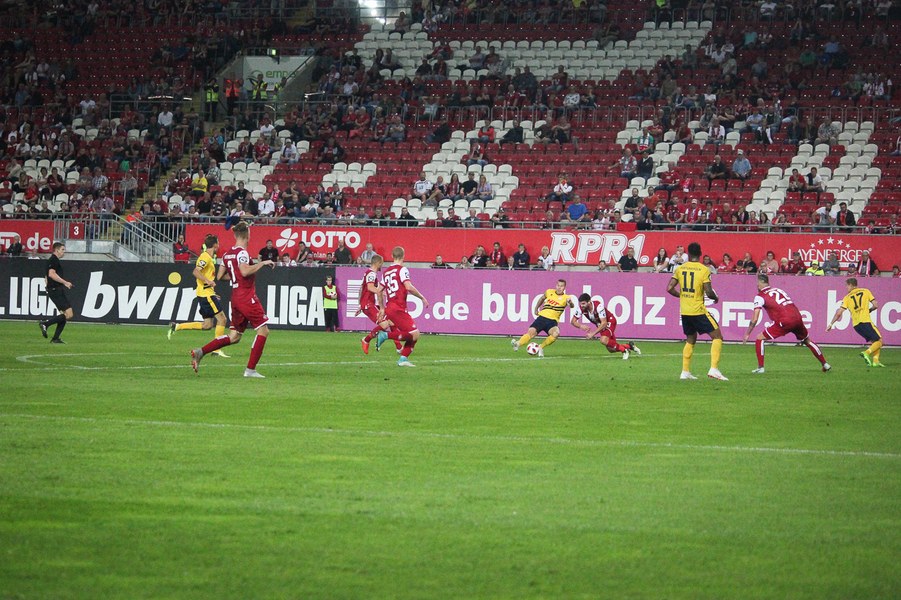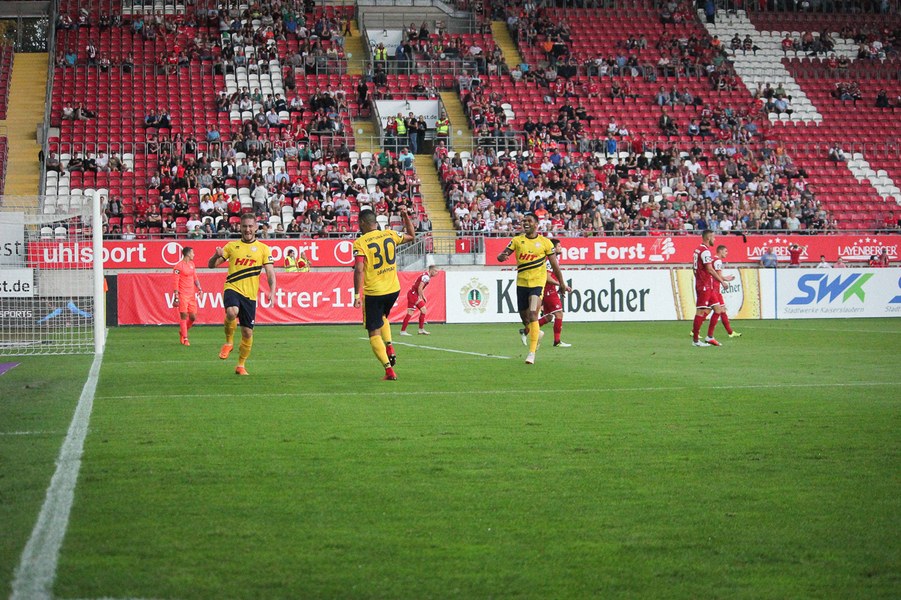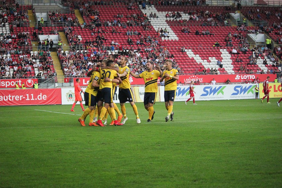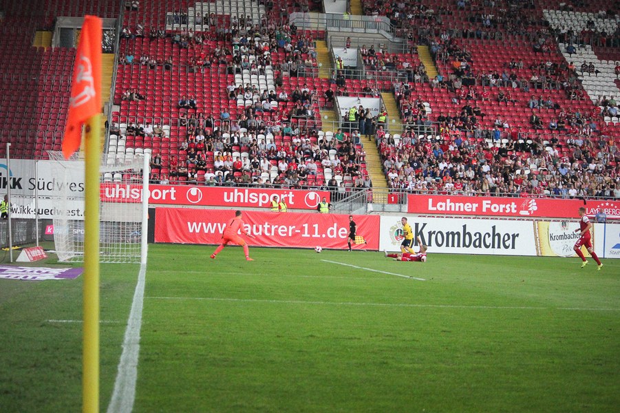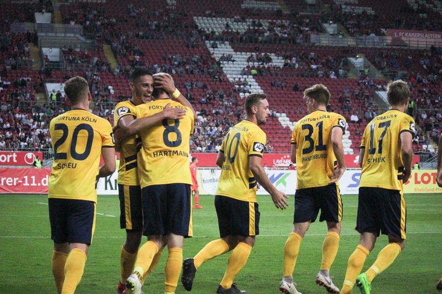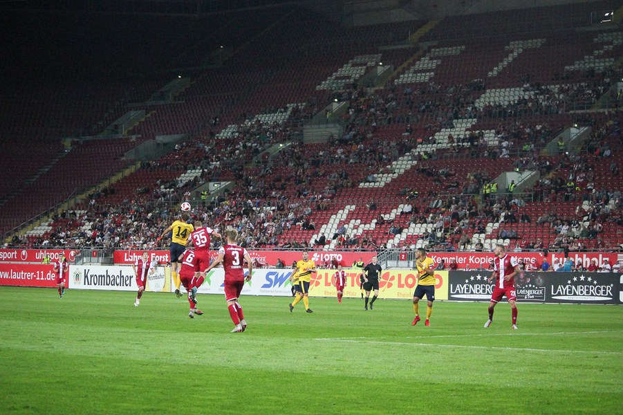 Unter dem gellenden Einsatz von Trillerpfeifen musste sich Schiedsrichter Schröder diesmal besonders bemühen, um den Anpfiff vorzunehmen. Die ersten Chancen ließen danach aber nicht lange auf sich warten. Eine leicht verunglückte Flanke Schieks landete wider Erwarten auf der Latte des Lauterer Kastens (5.). Für die Roten Teufel wirkte das zumindest kurzzeitig wie ein "Wachmacher", denn kurz darauf prüfte Hemlein den Torwart der Fortuna, aber Rehnen parierte (6.). Kurz darauf ließ die Fortuna die Euphorie der Gastgeber aber verstummen. Eine sehenswerte Kombination über viele Stationen endete in einem Tor von Robin Scheu aus spitzem Winkel (9.). Somit kam die Fortuna ihrem Ziel näher, die Heimmannschaft schon früh unter Druck zu setzen und das heimische Publikum in ihrer Ungeduld zu bestärken. Auch die Pfälzer auf dem Platz schien der Gegentreffer ein wenig zu hemmen. Die Fortuna blieb aber dennoch weiter konzentriert und ließ sich auch durch die Kulisse nicht zu sehr beeindrucken. Nach etwas mehr als einer halben Stunde setzte Moritz Hartmann einen weiteren empfindlichen Nadelstich, als er nach Vorlage von Kapitän Dahmani die Führung verdoppelte (31.). Das Spiel kippte in Richtung der Fortuna, sodass der Betzenberg spürbar unruhig wurde. Aus dem Nichts erzielten die Gastgeber dann den Anschlusstreffer von Thiele (35.). Die Mannschaft von Michael Frontzeck konnte die Partie danach immer besser an sich reißen und kurz vor der Halbzeit nach einer Ecke durch den Ex-Fortunen Biada dann doch zum Ausgleich kommen (44.). Mit 2:2 ging es dann in die Kabine.