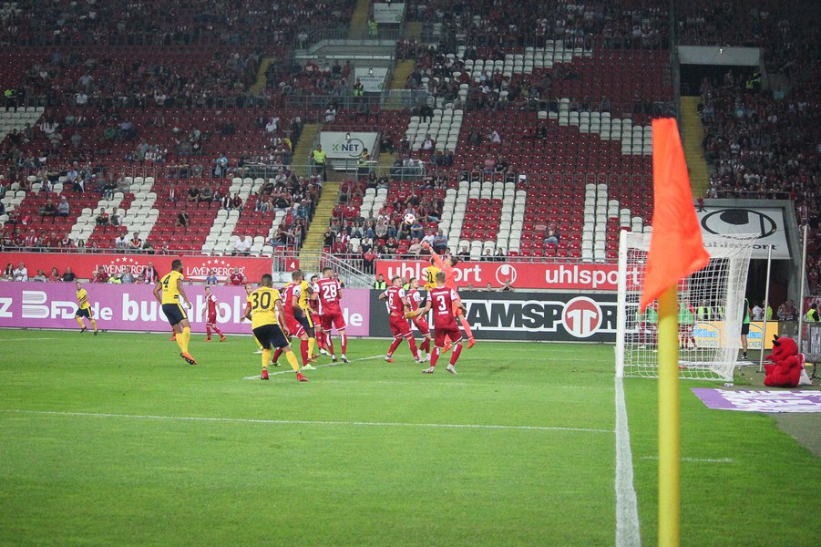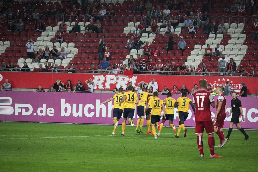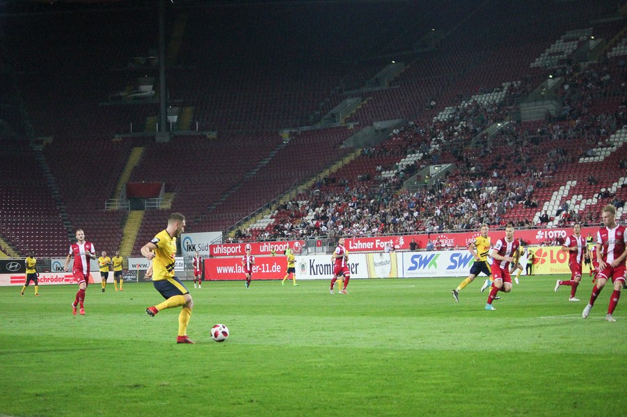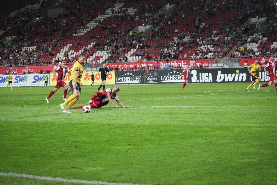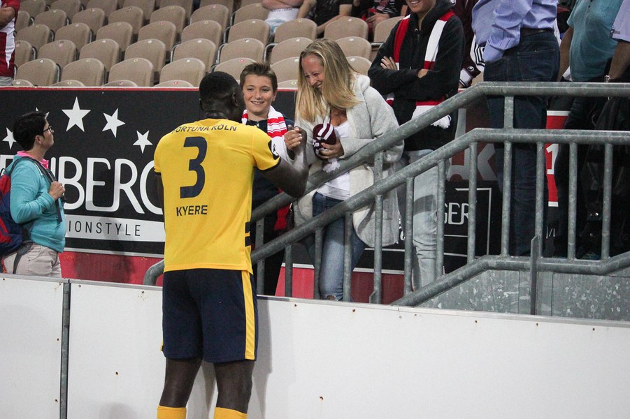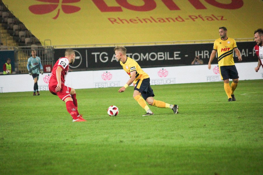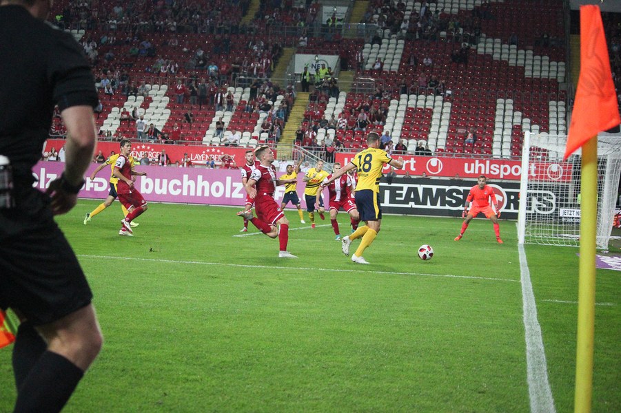 Unter dem gellenden Einsatz von Trillerpfeifen musste sich Schiedsrichter Schröder diesmal besonders bemühen, um den Anpfiff vorzunehmen. Die ersten Chancen ließen danach aber nicht lange auf sich warten. Eine leicht verunglückte Flanke Schieks landete wider Erwarten auf der Latte des Lauterer Kastens (5.). Für die Roten Teufel wirkte das zumindest kurzzeitig wie ein "Wachmacher", denn kurz darauf prüfte Hemlein den Torwart der Fortuna, aber Rehnen parierte (6.). Kurz darauf ließ die Fortuna die Euphorie der Gastgeber aber verstummen. Eine sehenswerte Kombination über viele Stationen endete in einem Tor von Robin Scheu aus spitzem Winkel (9.). Somit kam die Fortuna ihrem Ziel näher, die Heimmannschaft schon früh unter Druck zu setzen und das heimische Publikum in ihrer Ungeduld zu bestärken. Auch die Pfälzer auf dem Platz schien der Gegentreffer ein wenig zu hemmen. Die Fortuna blieb aber dennoch weiter konzentriert und ließ sich auch durch die Kulisse nicht zu sehr beeindrucken. Nach etwas mehr als einer halben Stunde setzte Moritz Hartmann einen weiteren empfindlichen Nadelstich, als er nach Vorlage von Kapitän Dahmani die Führung verdoppelte (31.). Das Spiel kippte in Richtung der Fortuna, sodass der Betzenberg spürbar unruhig wurde. Aus dem Nichts erzielten die Gastgeber dann den Anschlusstreffer von Thiele (35.). Die Mannschaft von Michael Frontzeck konnte die Partie danach immer besser an sich reißen und kurz vor der Halbzeit nach einer Ecke durch den Ex-Fortunen Biada dann doch zum Ausgleich kommen (44.). Mit 2:2 ging es dann in die Kabine.
