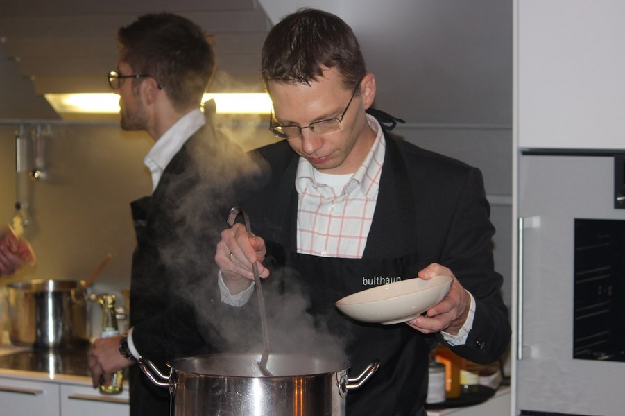 Neben dem Kochen stand vor allem der Kontakt zwischen den Partnern im Vordergrund: Während sich die Männer beim gemeinsamen Kochen näher kennenlernten, durften sich deren Begleitungen bei Sekt und Wein zurücklehnen. Anschließend wurde das fertige Menü gemeinsam genossen. „Wir möchten unseren Partnern mit solchen Abenden die Möglichkeit bieten, miteinander in Kontakt zu treten und sich immer weiter und besser zu vernetzen. Herr Vianden hat uns mit „bulthaup am Mediapark“ den perfekten Rahmen dafür geboten. Das war ein hochklassiger Anfang und wir freuen uns auf die nächsten Partnerevents“, zeigte sich auch Benjamin Bruns mit dem Kochevent sehr zufrieden.