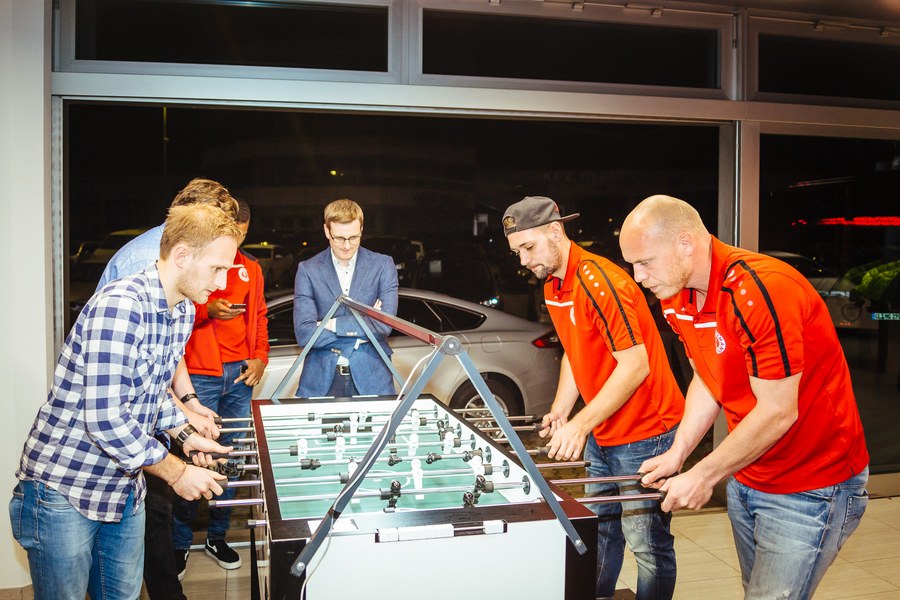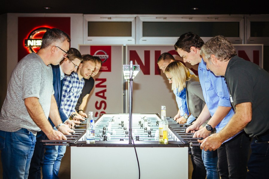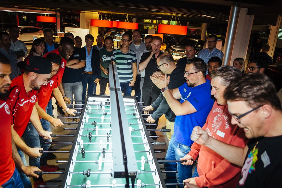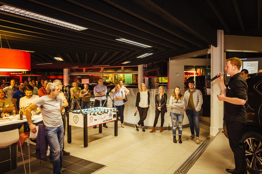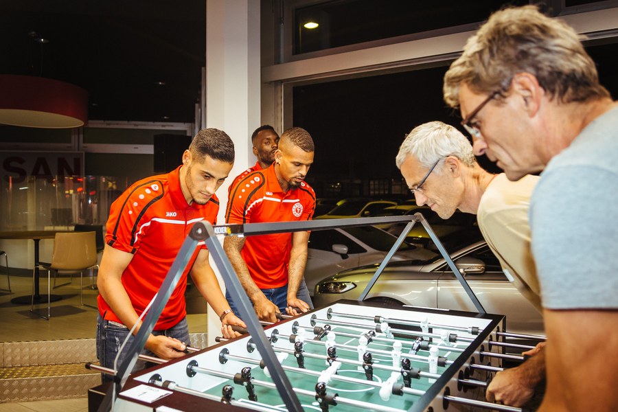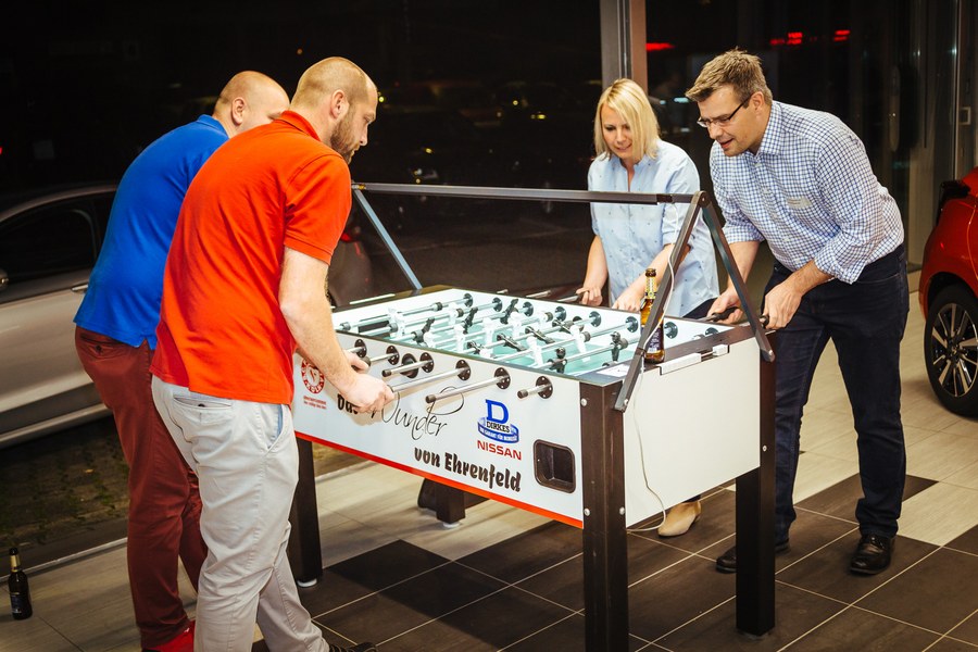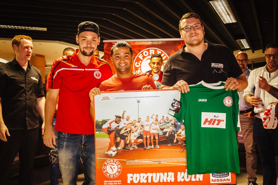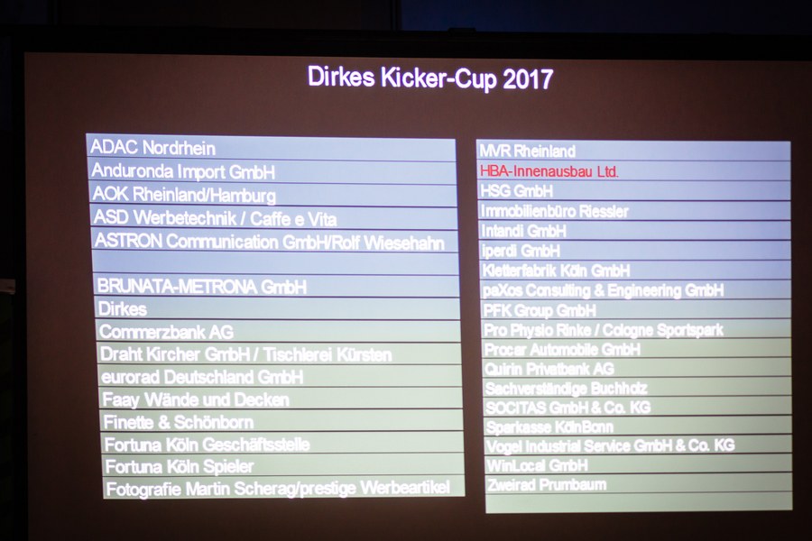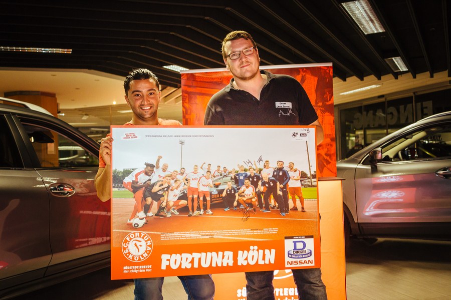 Die Automobilgruppe Dirkes veranstaltete bereits zum dritten Mal das Kickerturnier für das Fortuna-Netzwerk. Elmar Vogel, Leiter Unternehmenskommunikation der Automobilgruppe Dirkes, und Benjamin Bruns, Mitglied der Geschäftsleitung von Fortuna Köln, luden dafür in die Dirkes-Zentrale am Maarweg ein. Unter dem Motto „Das Wunder von Ehrenfeld 2.0“ führte wie gewohnt Fortuna-Partner meinkicker.com durch das Turnier. Auch die Fortuna-Profis Hamdi Dahmani, Maik Kegel, Cedric Mimbala, Andre Poggenborg und Daniel Keita-Ruel spielten abwechselnd als ein Fortuna-Team mit. Dem Gewinnerteam winkten zwei Nissan Champions League Tickets. Diese sicherte sich der ADAC Nordrhein, der durch das Turnier marschierte und im Finale das Team des Gastgebers Automobilgruppe Dirkes schlug.