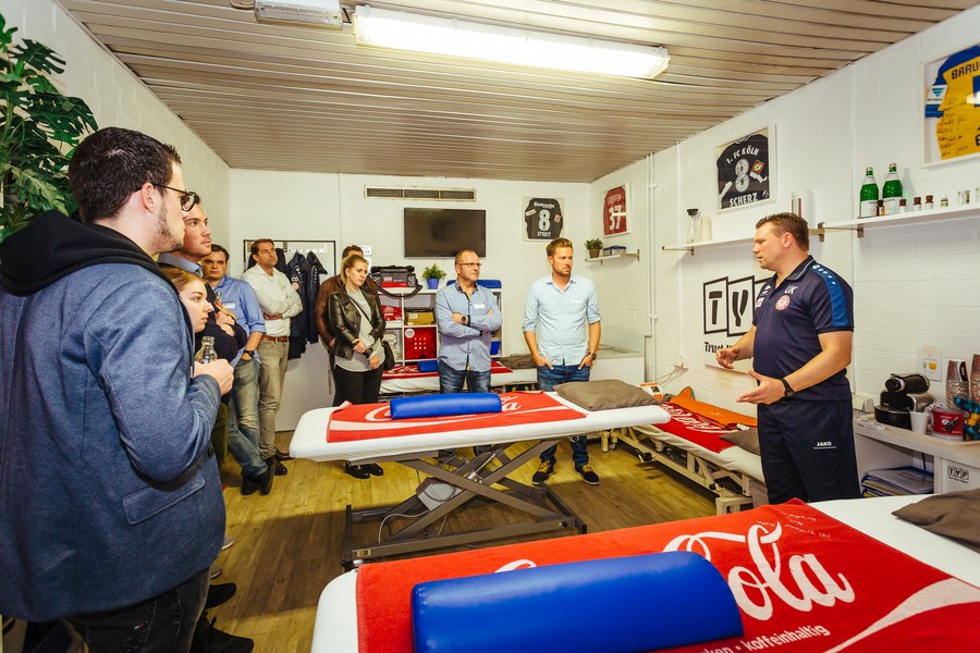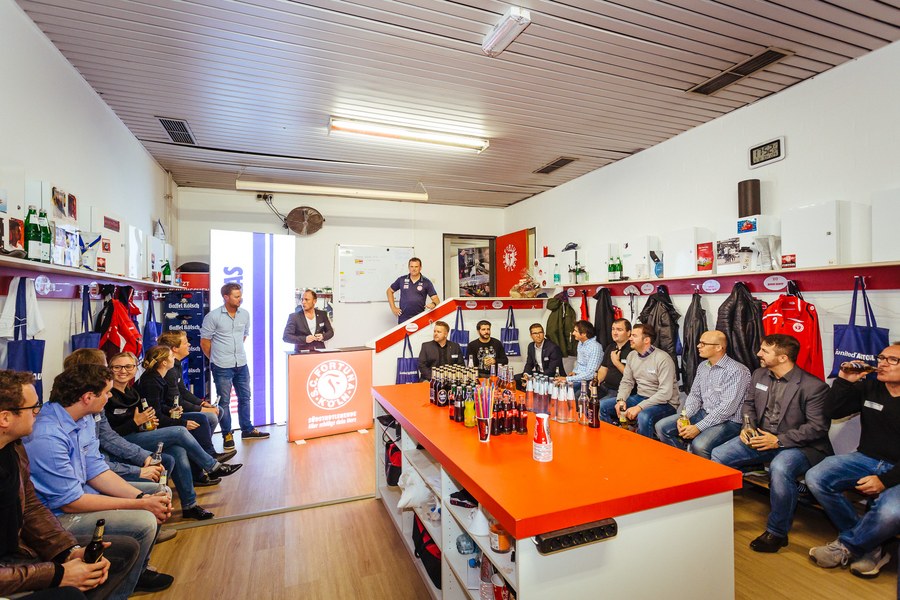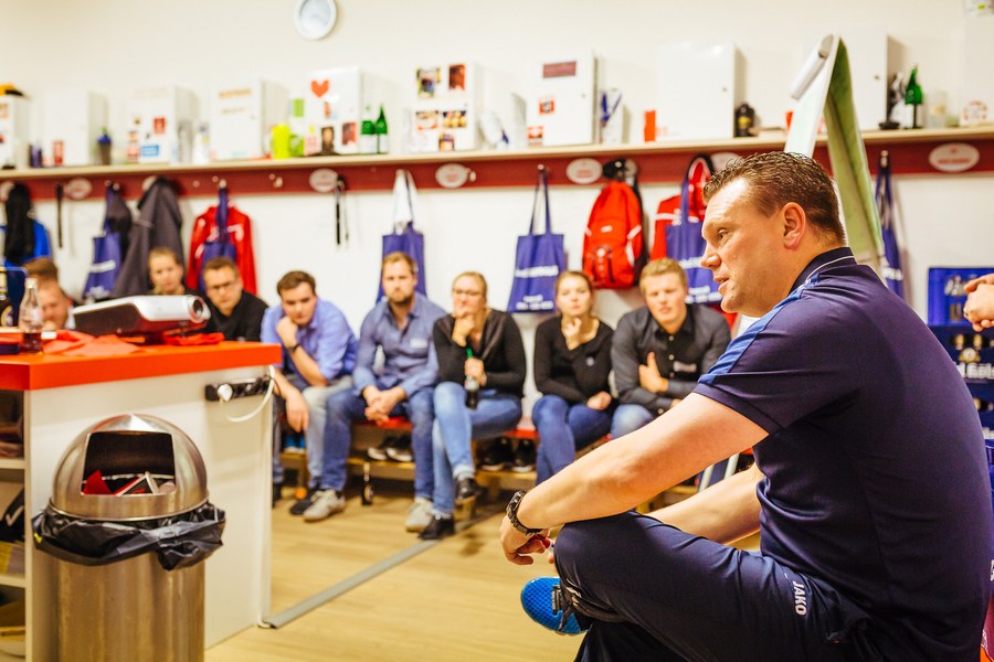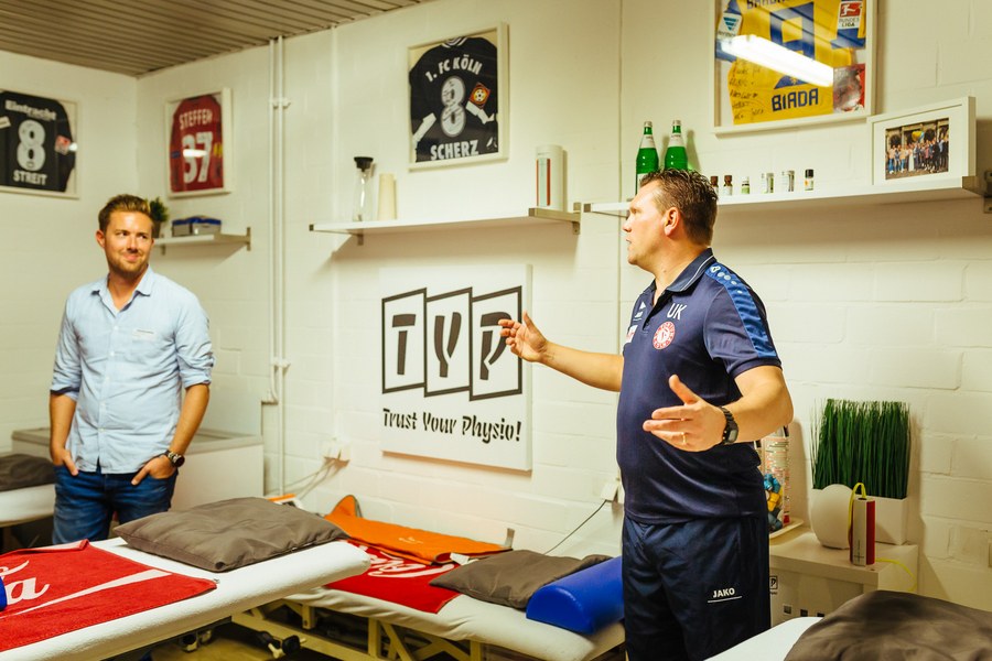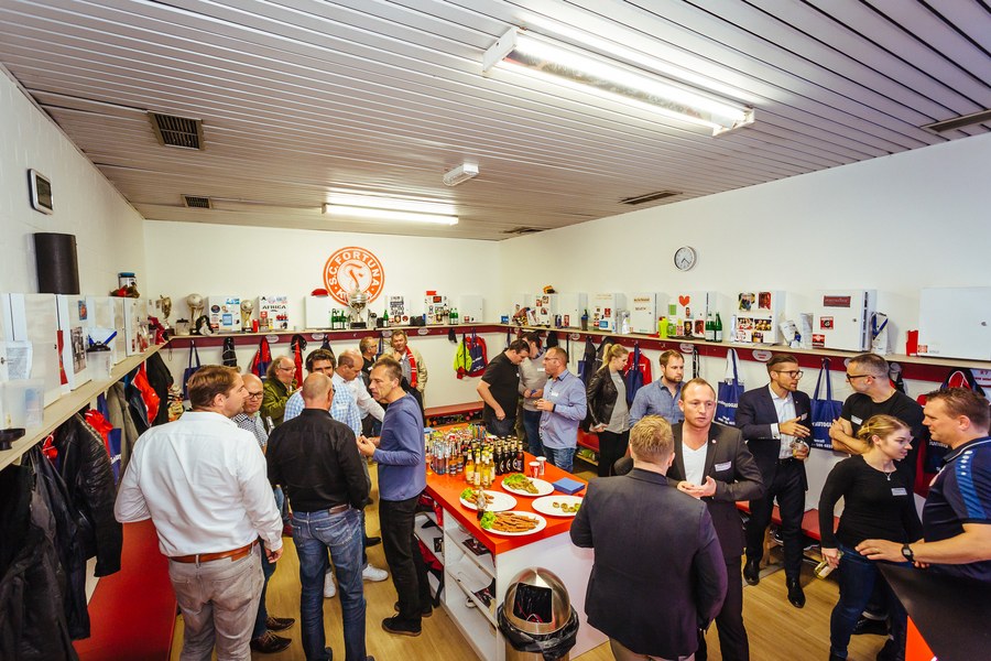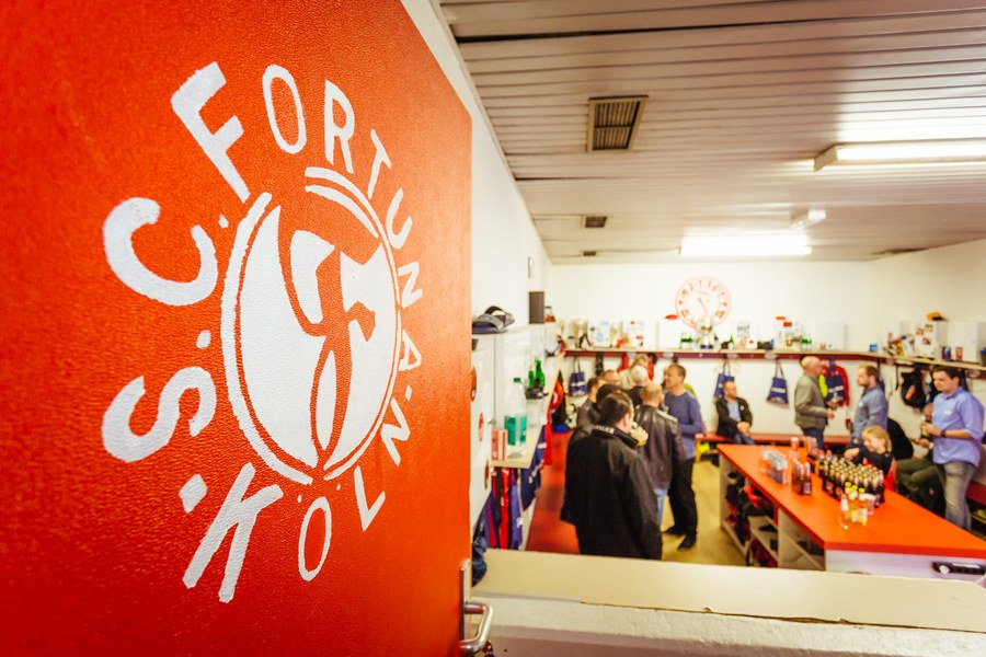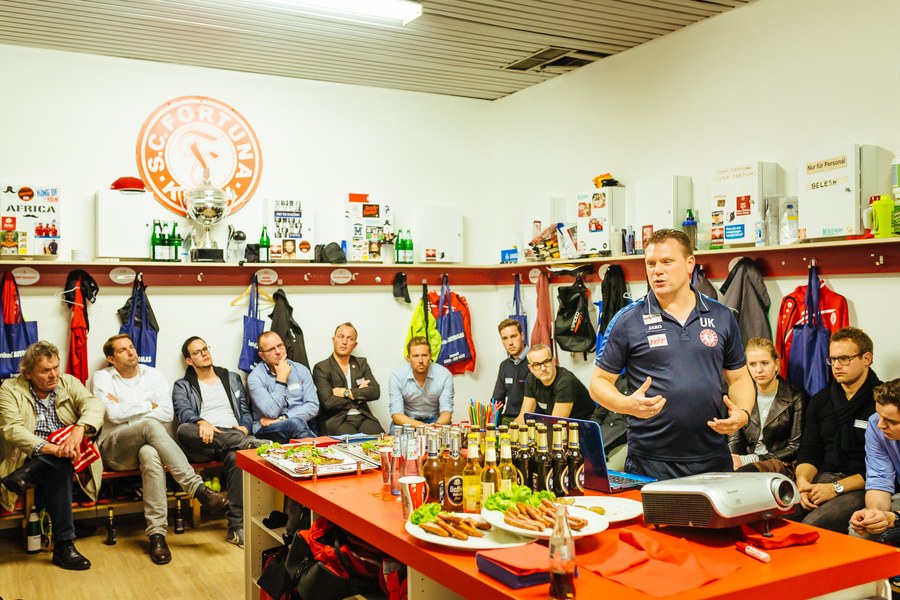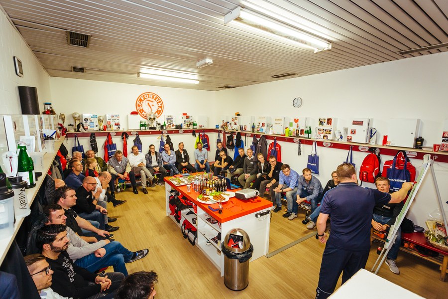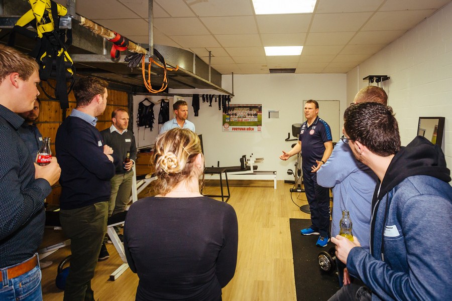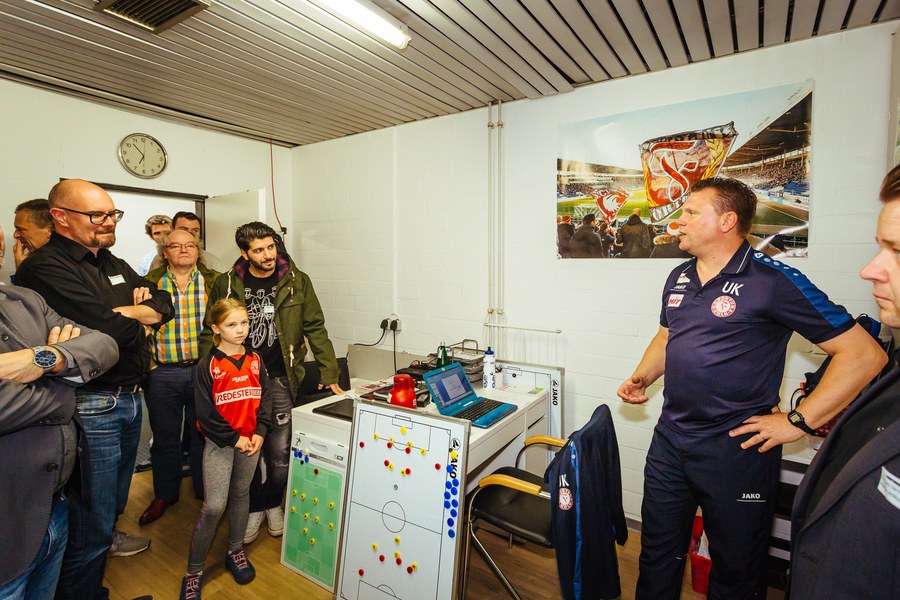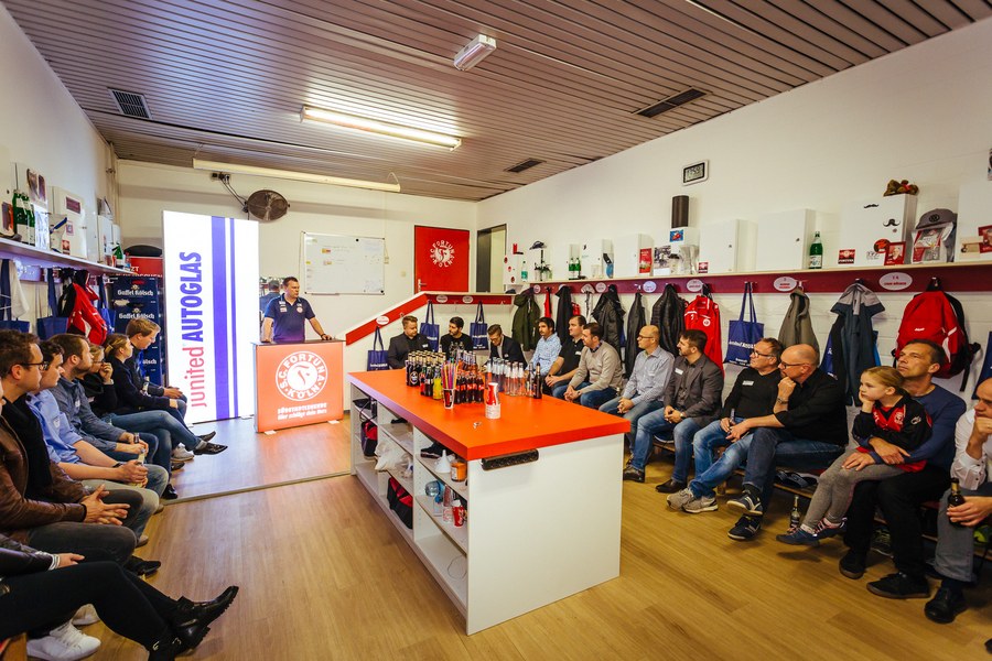 Nach einer kurzen Begrüßung von Benjamin Bruns, Mitglied der Geschäftsleitung Fortuna Köln, und Stefan Kurth, Marketing & Vertrieb junited Autoglas bot sich den Fortuna-Partnern dabei die Gelegenheit, hinter die Kulissen der Südstädter zu schauen. In der Kabine des Drittligisten am Südstadion tauchte man in die Abläufe einer Profimannschaft ein. So führte Koschinat die Partner durch die Kabine, den Kraftraum und den Physiotherapiebereich. Zudem präsentierte Koschinat den Partnern eine Mannschaftsbesprechung, wie sie Dahmani und Co. vor einem Pflichtspiel erleben.