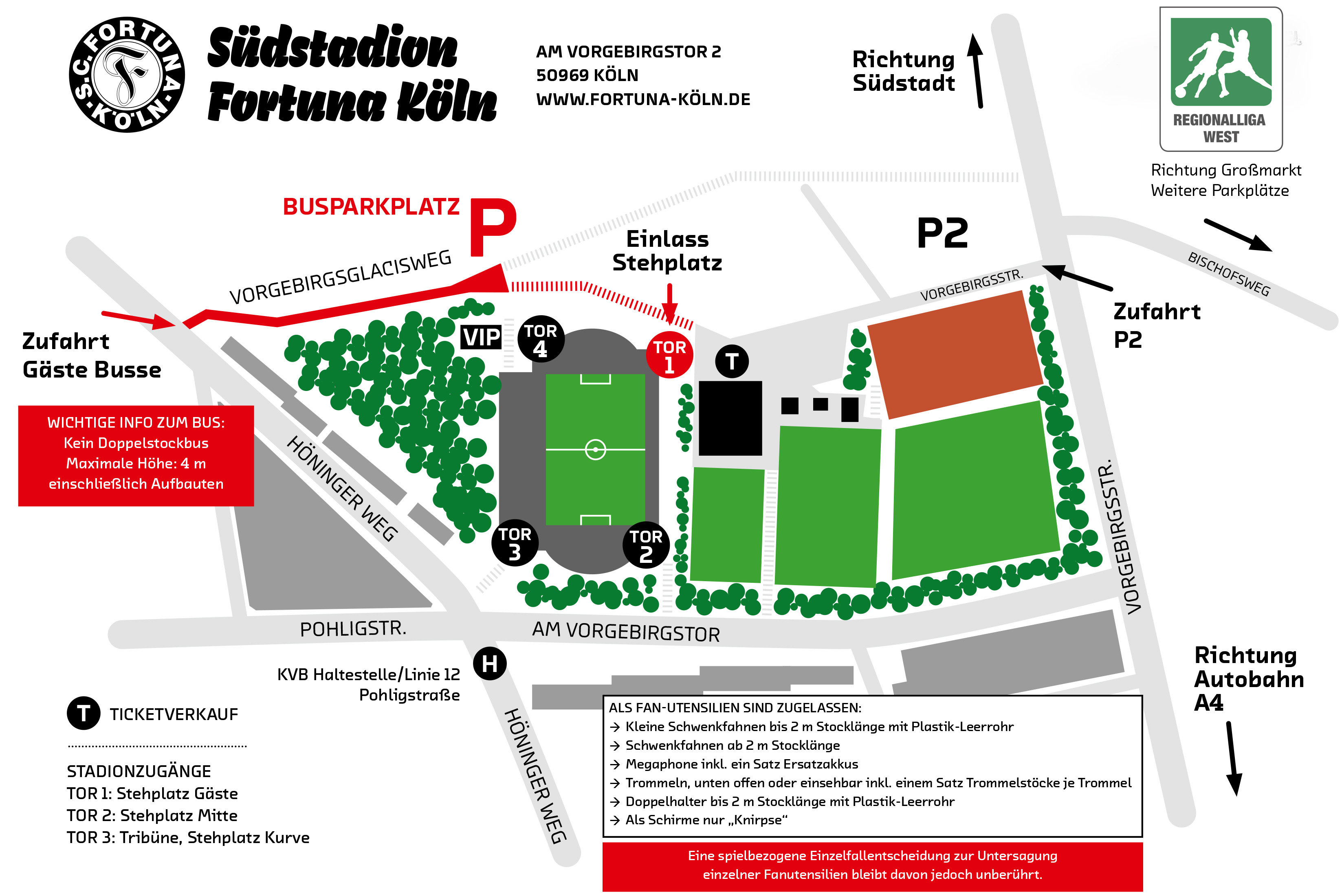 folgend findet ihr zusammengefasst einige hilfreiche Informationen für alle, die ihre Mannschaft im Zuge eines Auswärtsspiels nach Köln ins Südstadion begleiten möchten. Alle Informationen könnt ihr noch einmal ausführlich im Lageplan und der Stadionordnung des Südstadions nachlesen. Diese stellen wir euch ebenfalls zur Verfügung. Beides kann mit einem Klick auf die entsprechende Miniaturansicht geöffnet werden. Bitte lest euch die Informationen sorgfältig durch, um euren Aufenthalt so angenehm wie möglich zu gestalten. Bei weiteren Fragen steht euch außerdem unser Fanbeauftragter Ingolf Stollens gerne zur Verfügung.